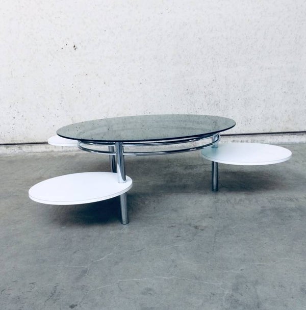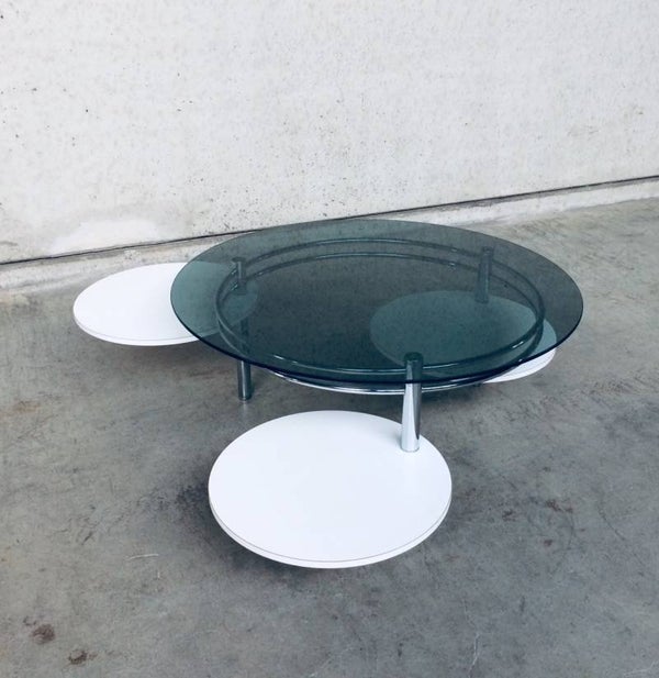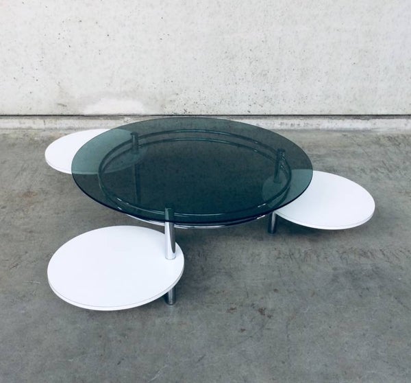 Vintage Midcentury Modern 1970's Design round smoke glass top Coffee Table with fold out, swivel white laminated round parts on chrome base. In very good condition. 100cm x 100cm x 43cm.