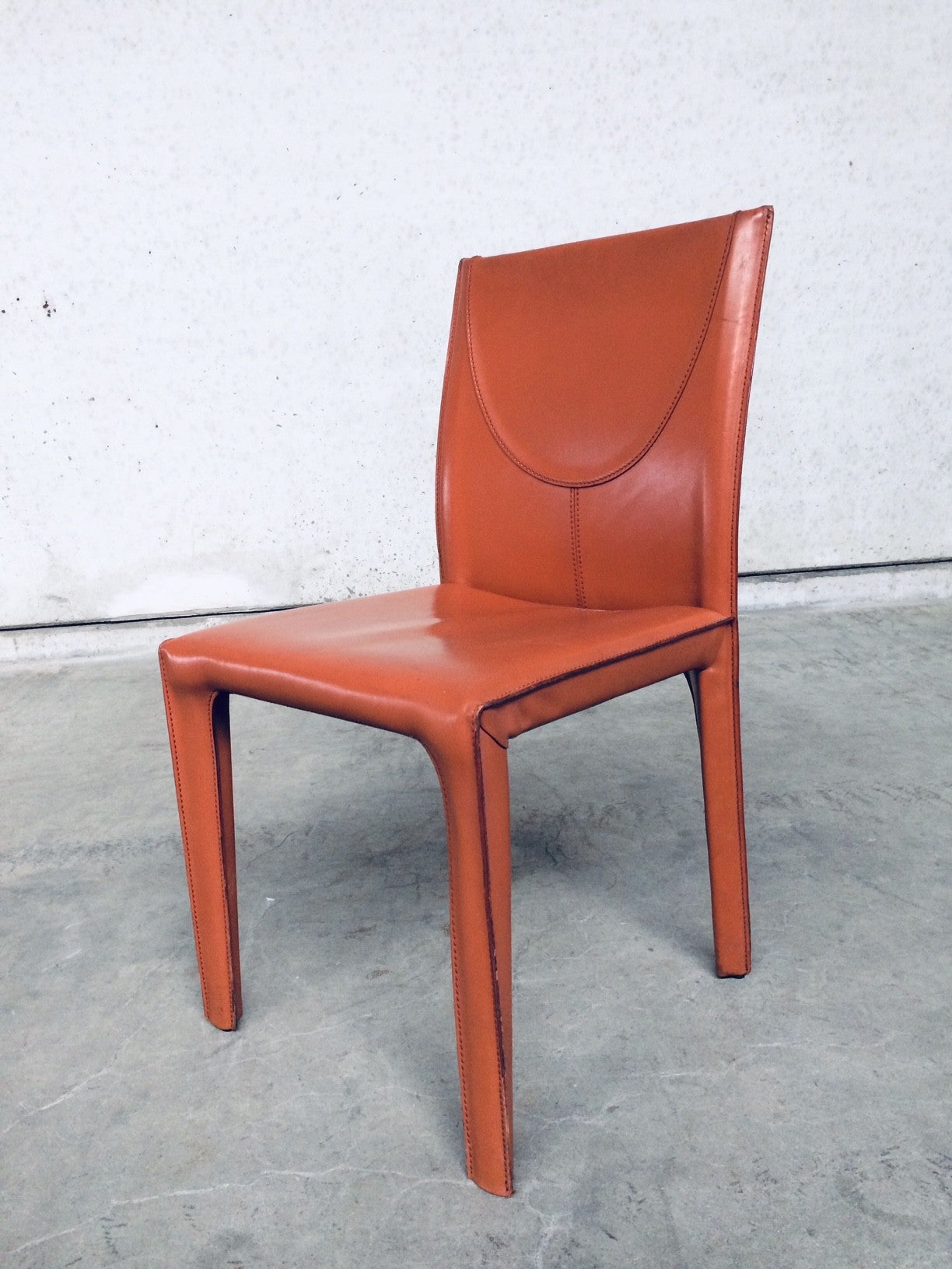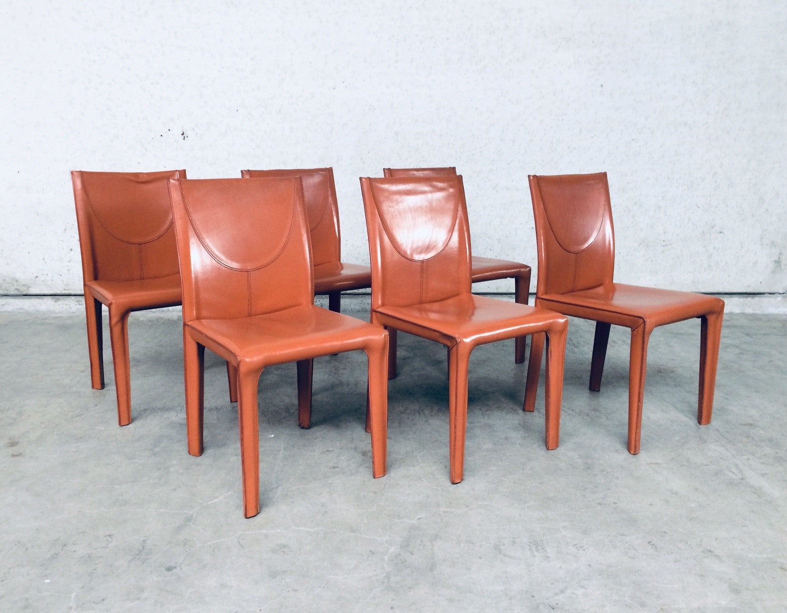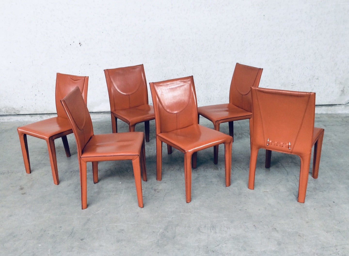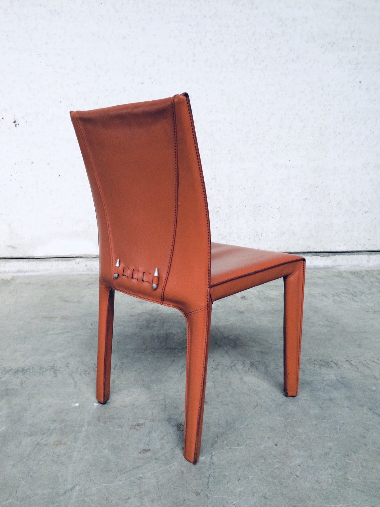 Vintage Midcentury Modern / Post Modern Design set of 6 Leather Dining Chairs by Arper, Italy, 1970's. Beautifull thick quality leather with nice stitching design and neat finish at the back. Each covered in burnt orange leather over metal frame. Leather is worn at the top of the backrest, otherwise in very good condition. Top Quality chair set.