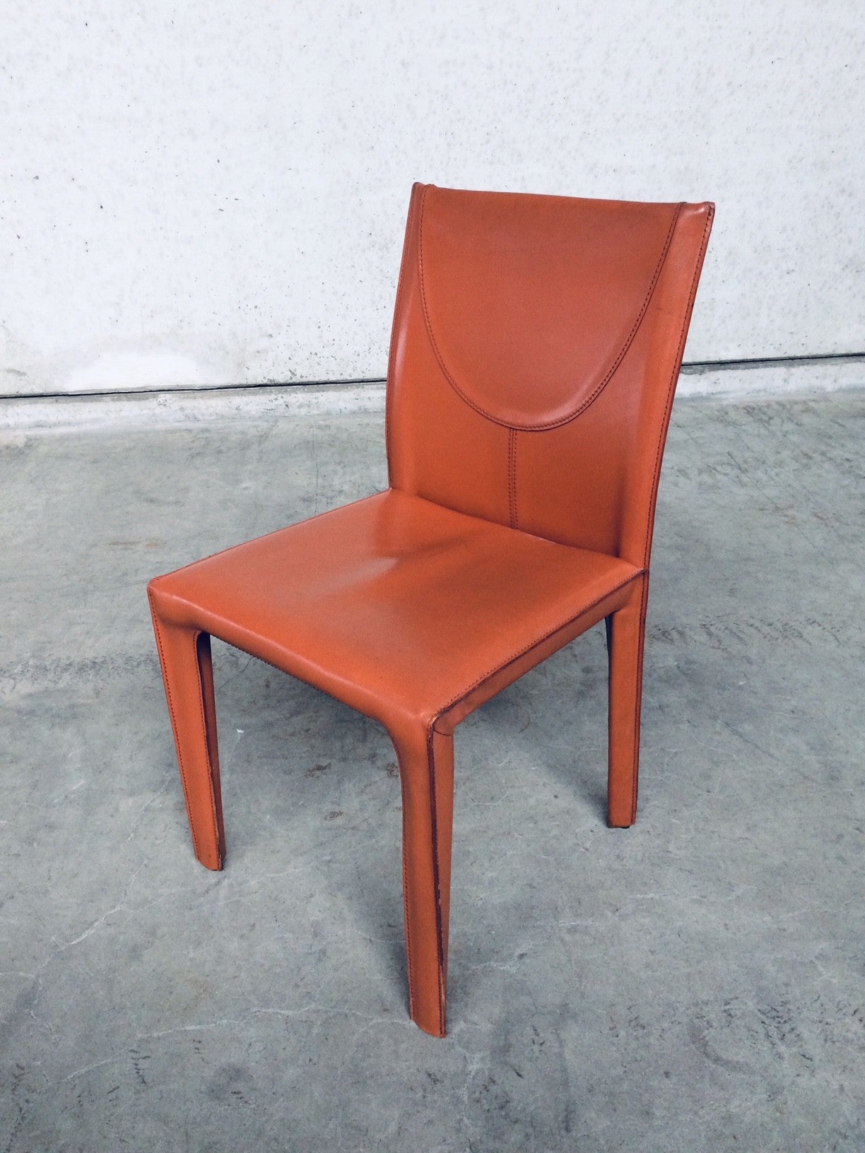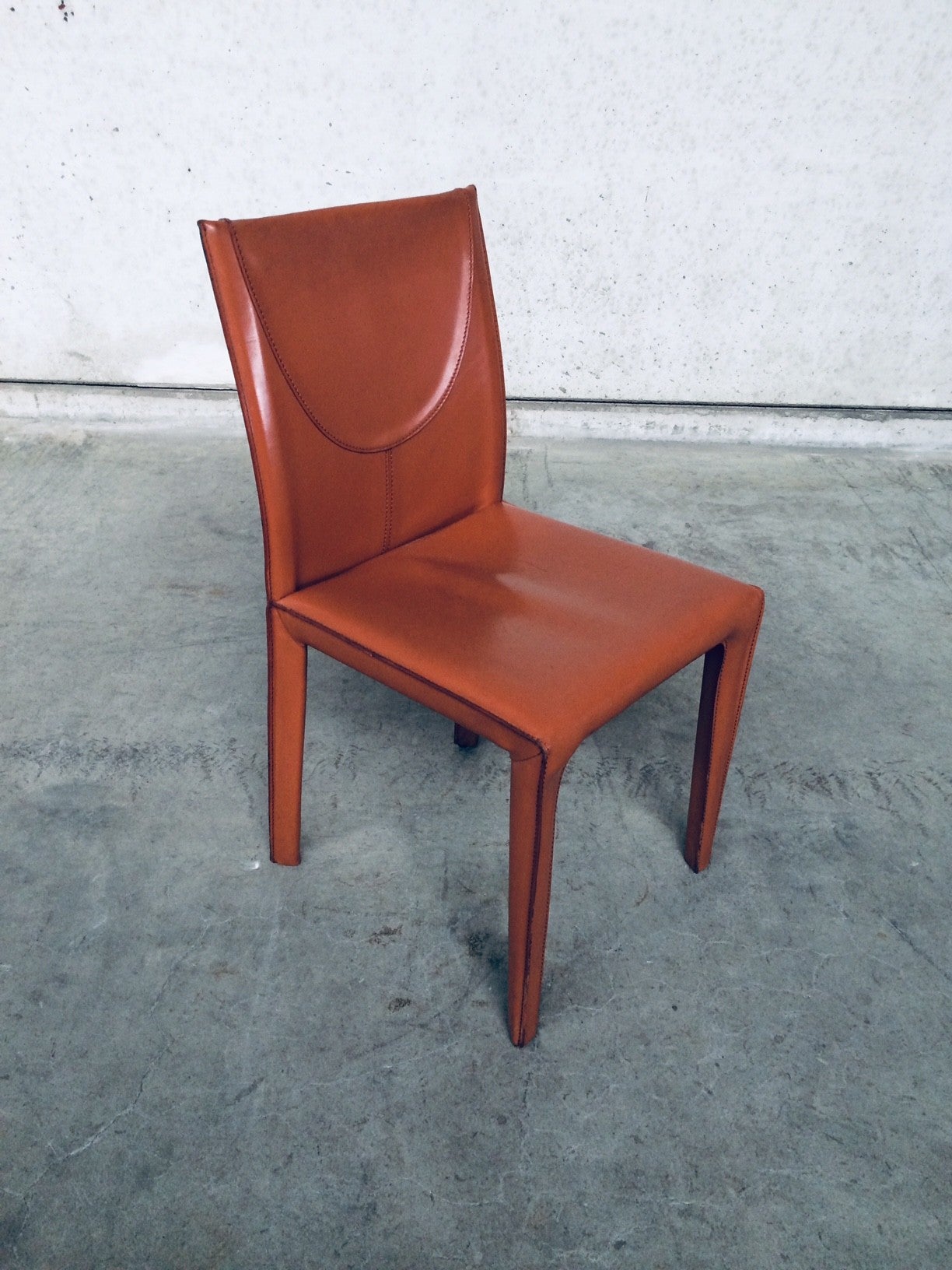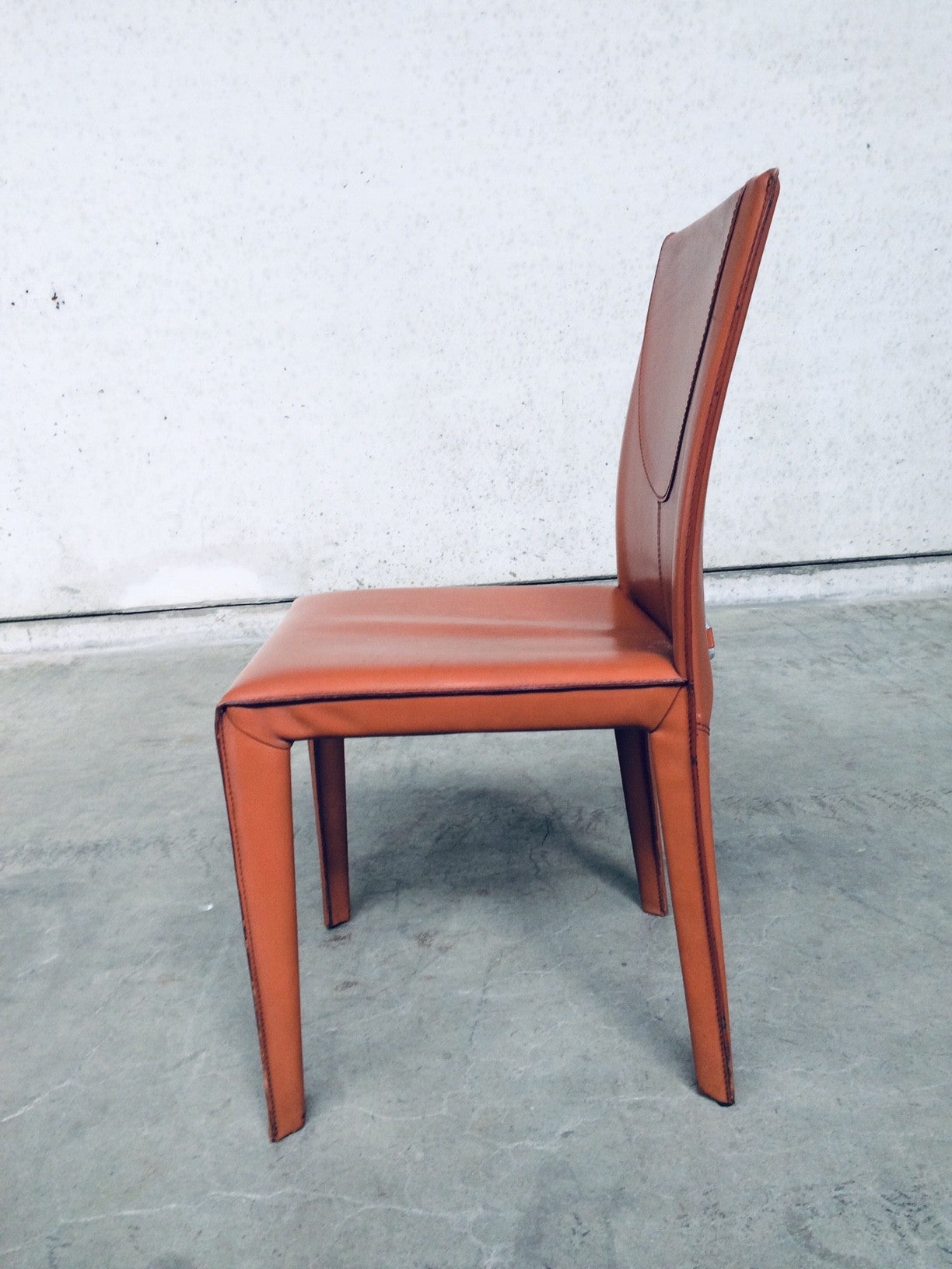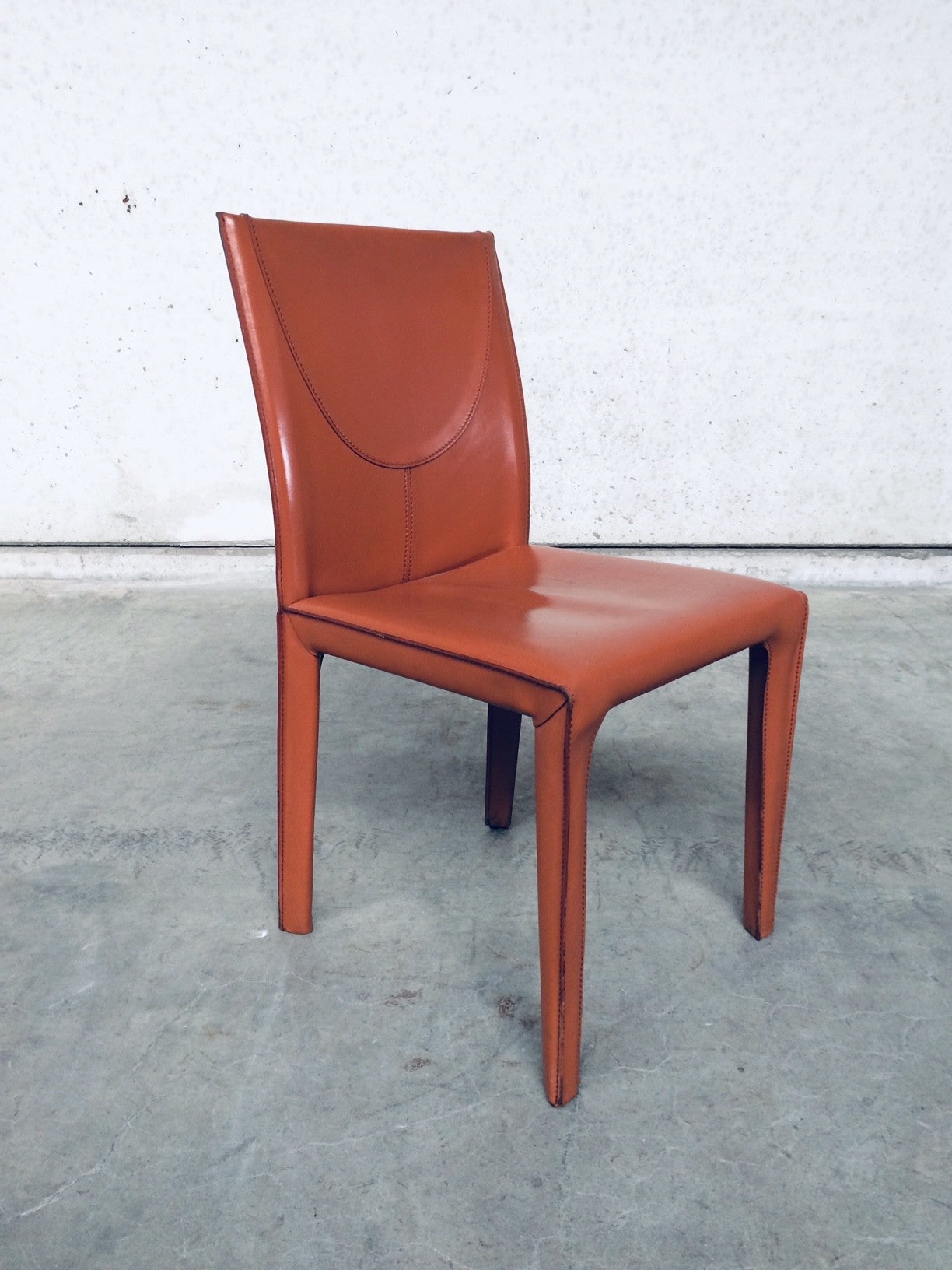 Vintage Midcentury Modern / Post Modern Design set of 6 Leather Dining Chairs by Arper, Italy, 1970's. Beautifull thick quality leather with nice stitching design and neat finish at the back. Each covered in burnt orange leather over metal frame. Leather is worn at the top of the backrest, otherwise in very good condition. Top Quality chair set.