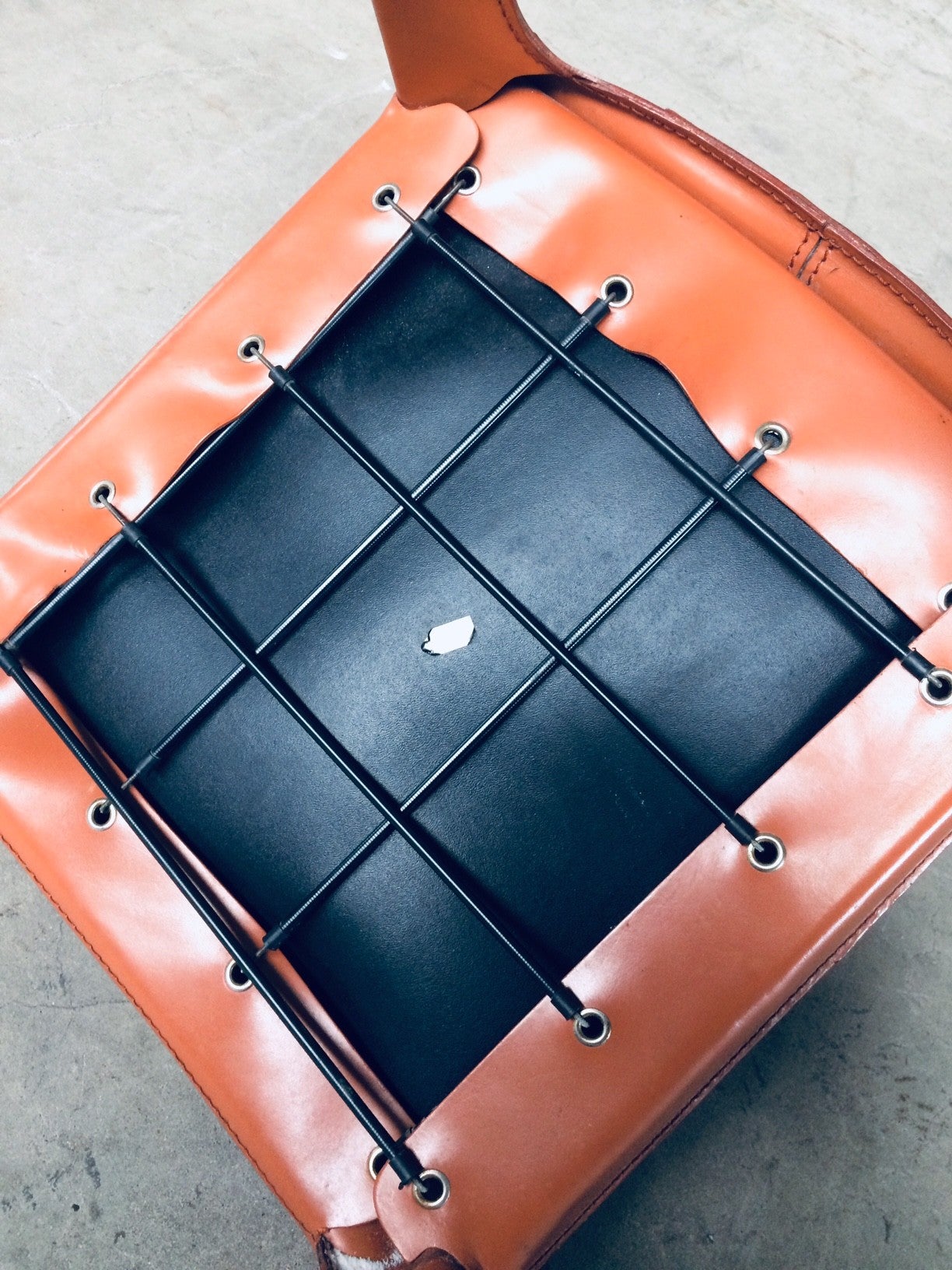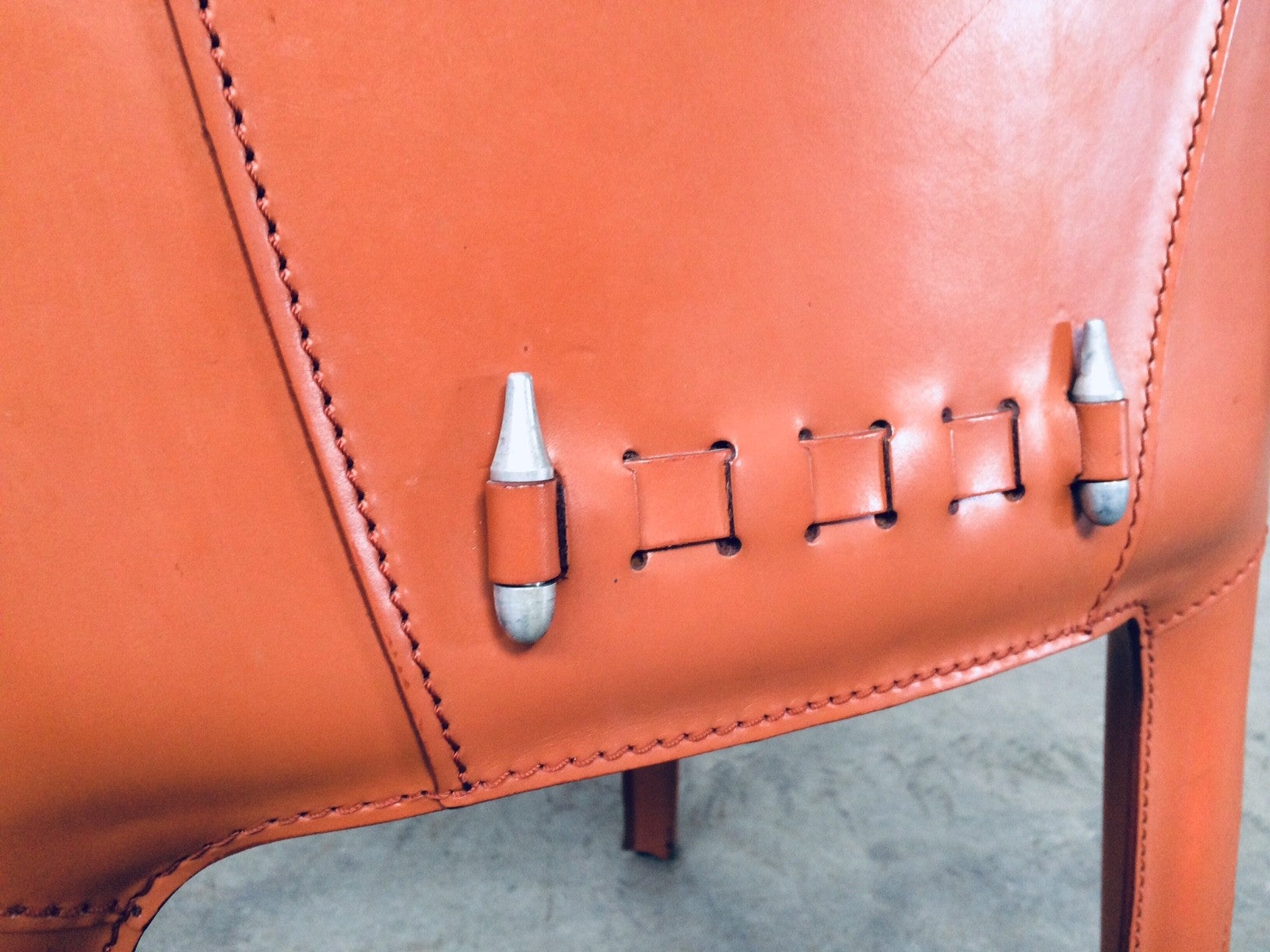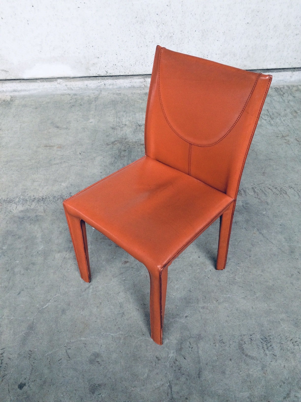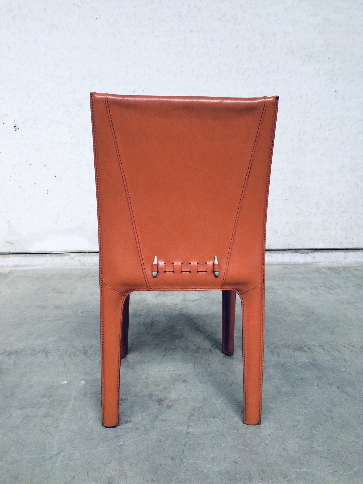 Vintage Midcentury Modern / Post Modern Design set of 6 Leather Dining Chairs by Arper, Italy, 1970's. Beautifull thick quality leather with nice stitching design and neat finish at the back. Each covered in burnt orange leather over metal frame. Leather is worn at the top of the backrest, otherwise in very good condition. Top Quality chair set.