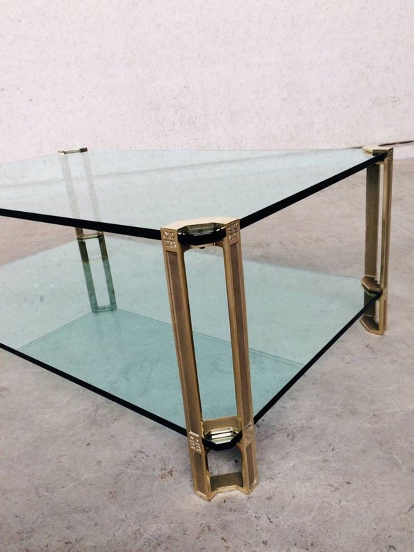 Vintage Midcentury Modern Design Large glass & brass Side Table by Peter Ghyczy, Netherlands 1970's. German designer, Peter Ghyczy, born in Hungary, living and working in the Netherlands. This side table is in very good condition. Super quality with heavy glass and brass. 120cm x 75cm x 45cm.