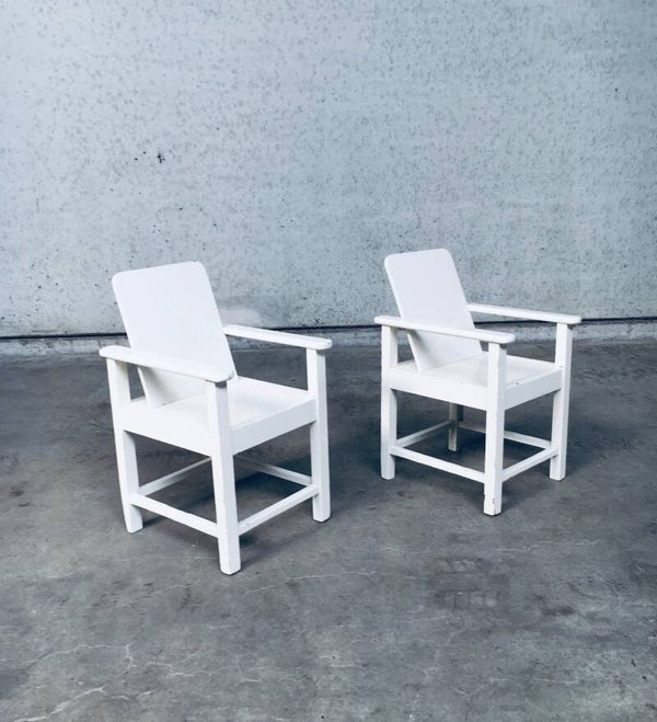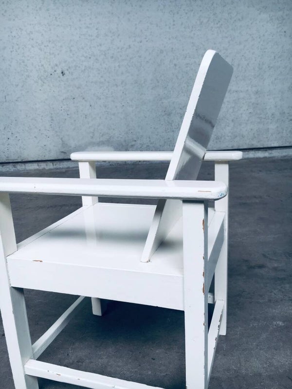 Vintage Early 20th Century Art Deco Period Handmade hand crafted Childs Size Arm Chair set of 2. Made in Belgium, 1920's. Beech wood constructed chairs with a modernist / modernism style design. Painted with a thick layer of white gloss paint. Both chairs are in very good, all original condition. Each measures 67cm x 40cm x 46cm.