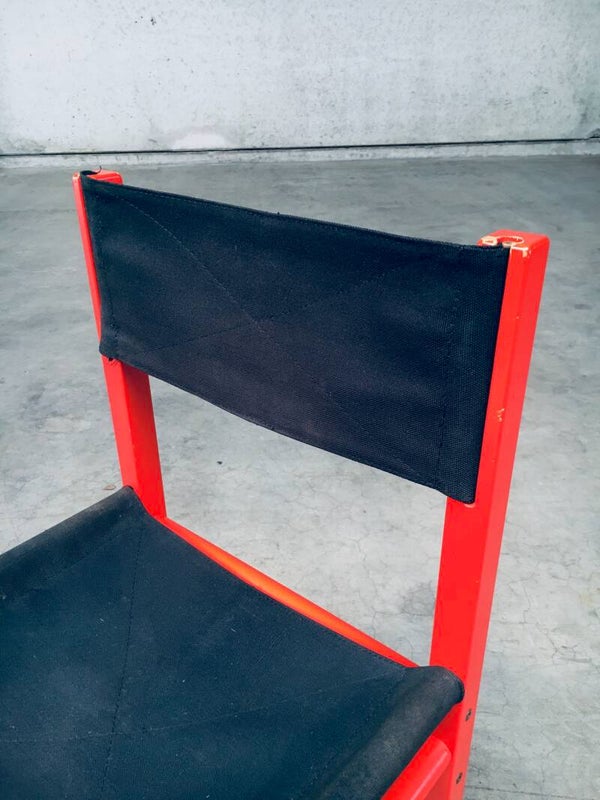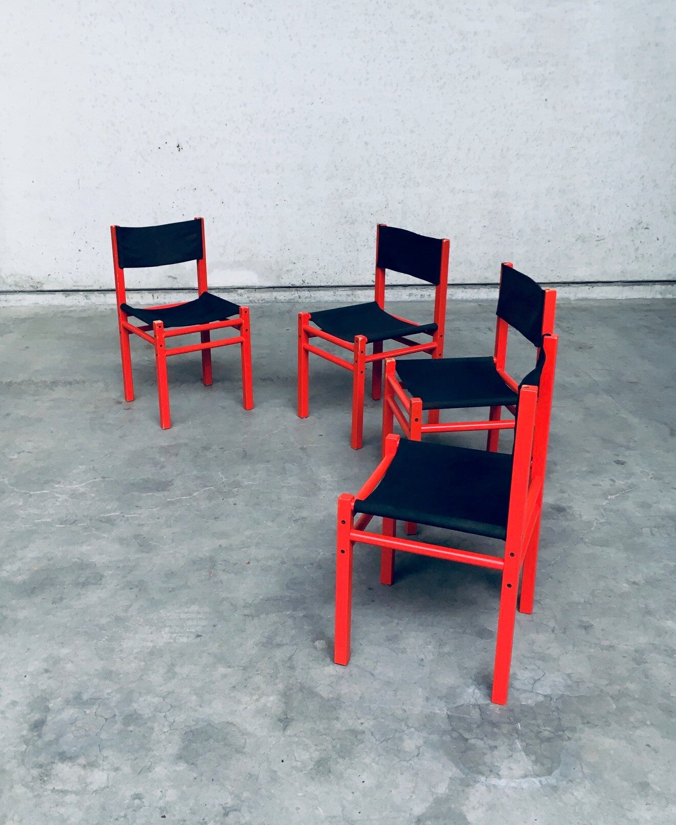 Vintage Midcentury Modernist Design Dining Chair set of 4. Made in Belgium, 1970's period. Red lacquer beech wood constructed frame with black/dark grey hopsack stitched fabric seat and back rest. Nice architectural in design and eclectic in use of color combination. All chairs have scratches and scuffs on the red lacquer and the black fabric has fading on most chairs. Overall good and sturdy condition. These chairs measure 80cm x 43cm x 43cm. Seat height 46cm.