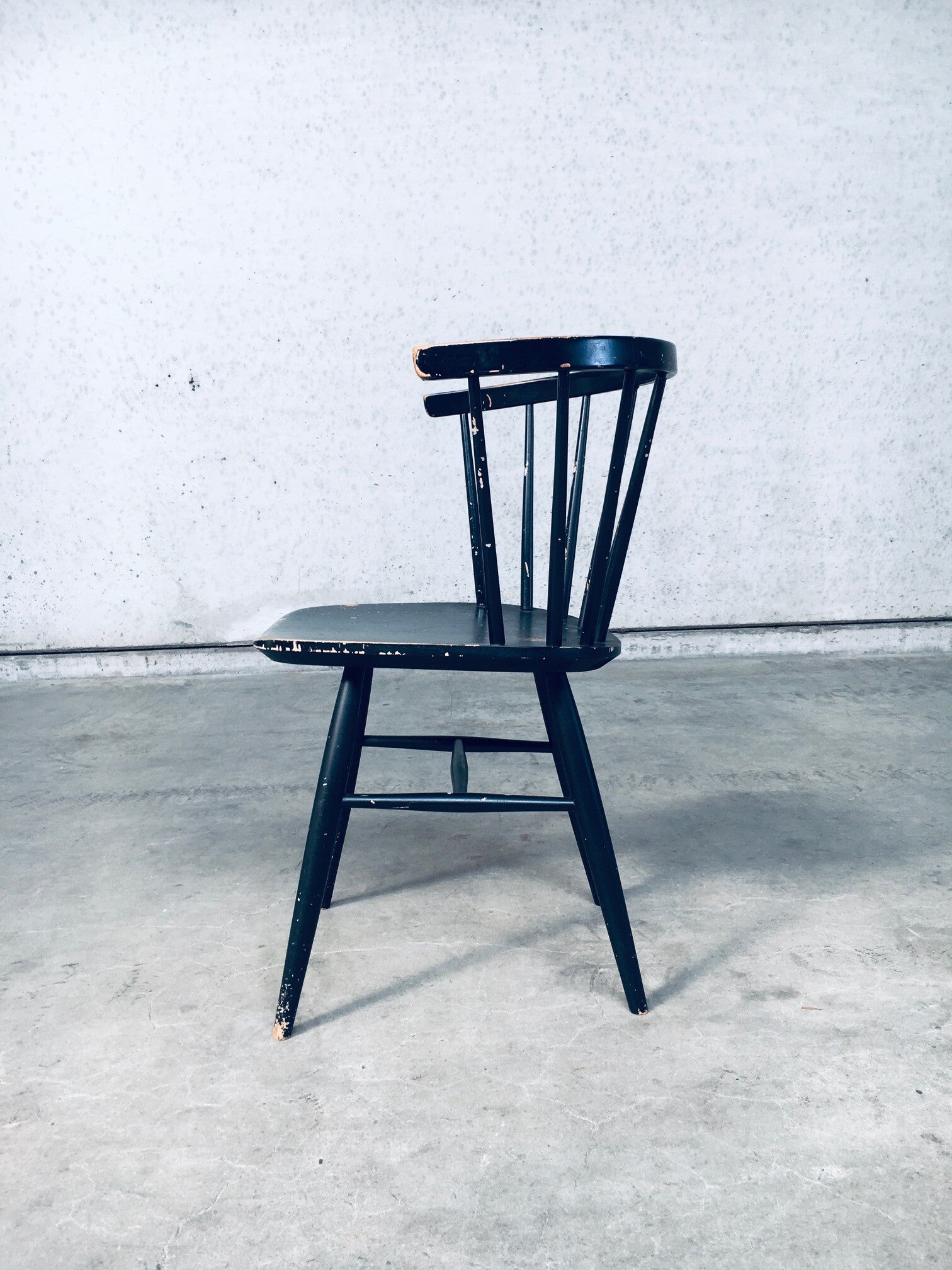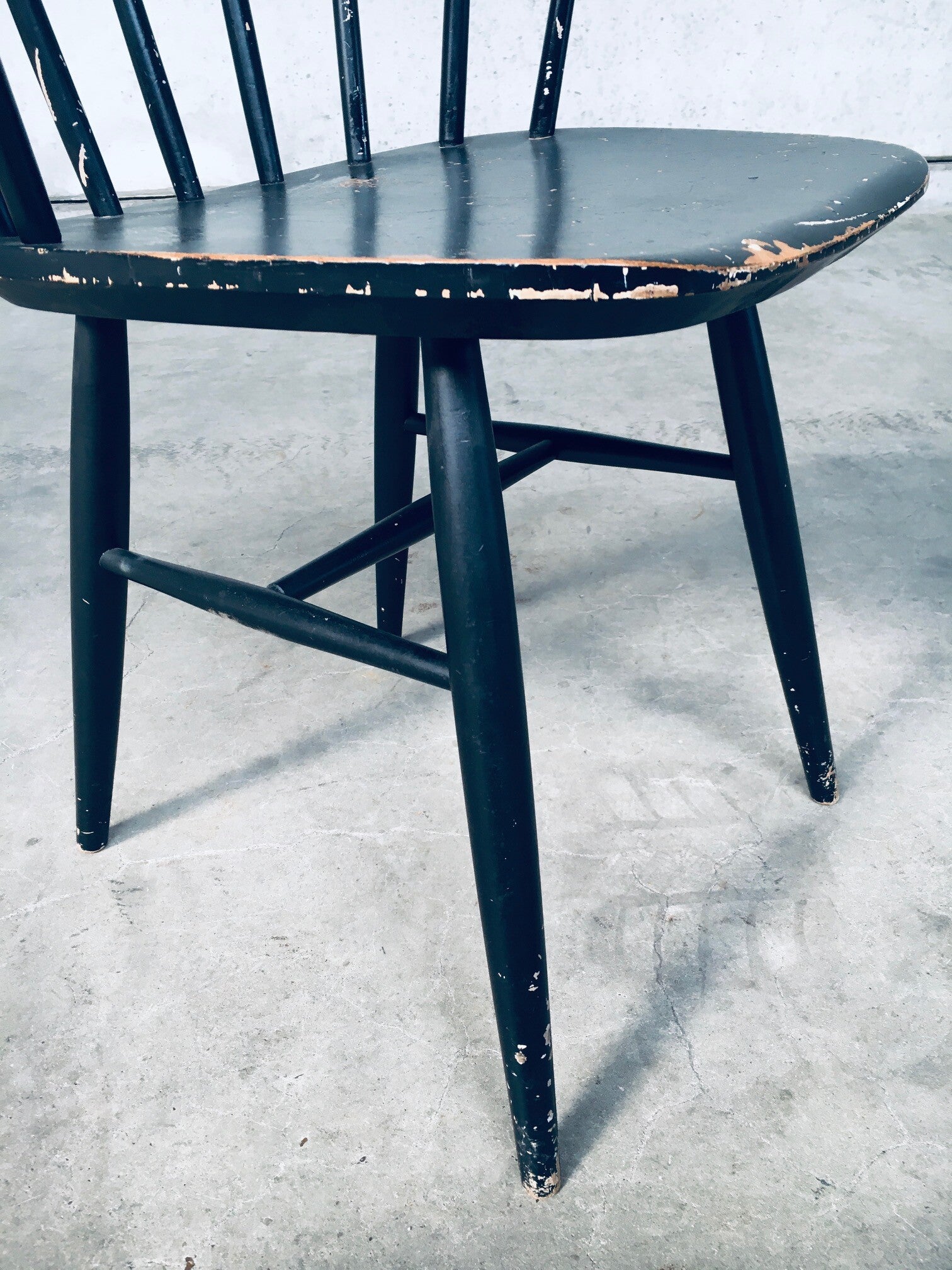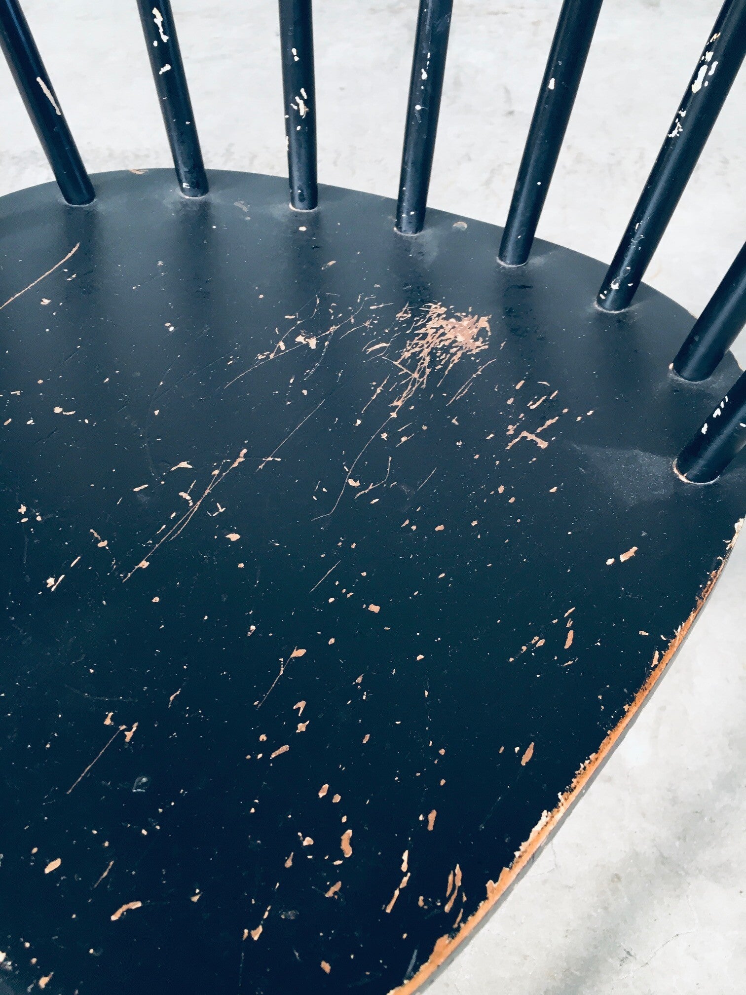 Vintage Midcentury Scandinavian Design Curved Spindle Back Side Chair. Made in Denmark, 1960's period. Beech constructed chair in black lacquer paint. Very nice shape on this side arm chair model. Highly patinated with lot's of paint loss and scratches. Overal in good and sturdy condition. Measures 77cm x 53cm x 50cm.