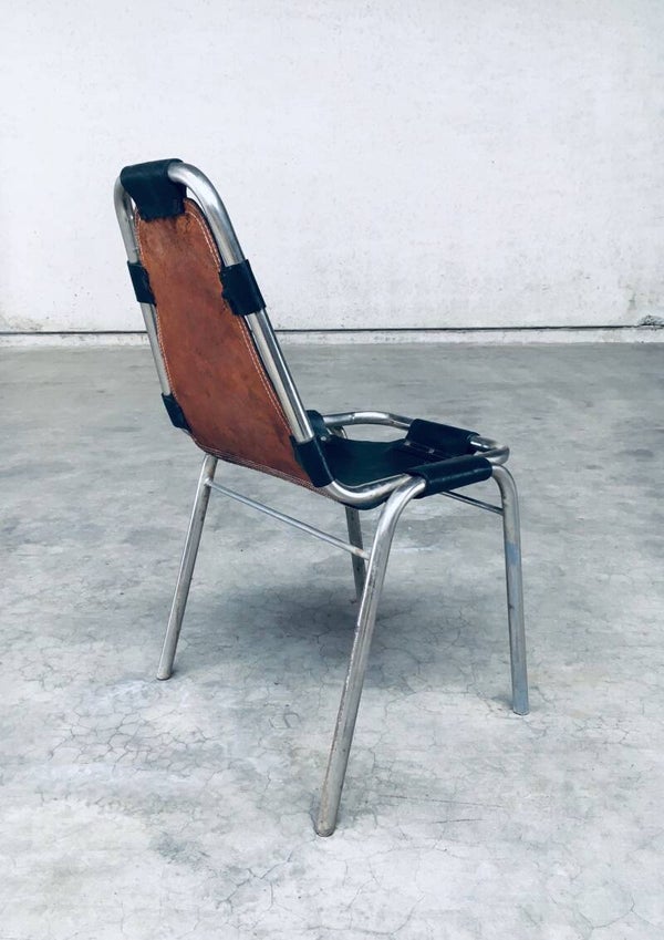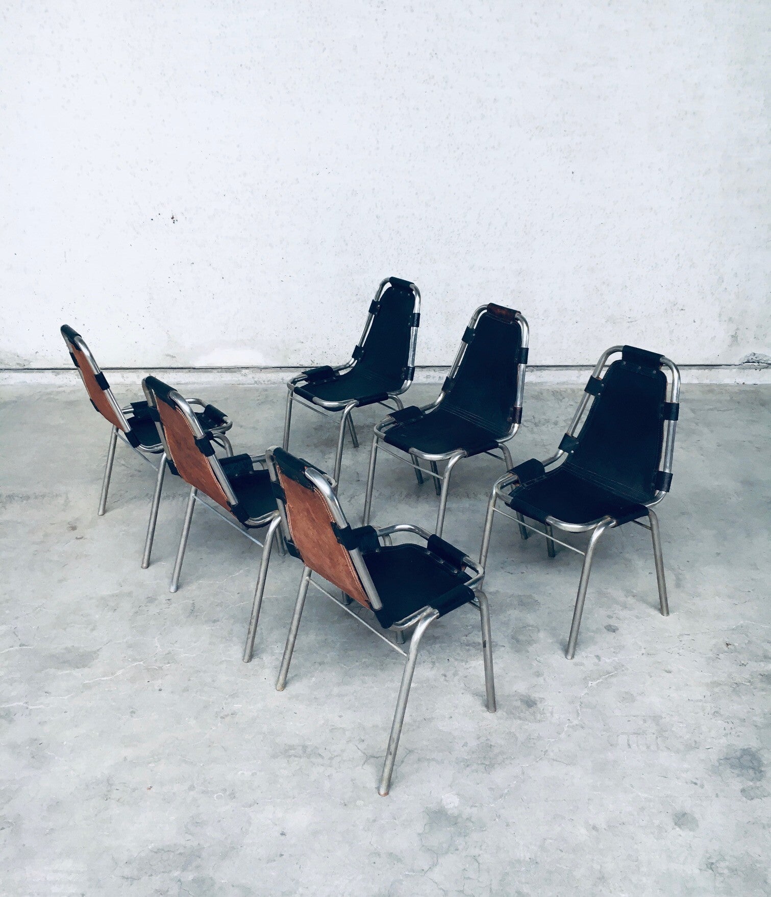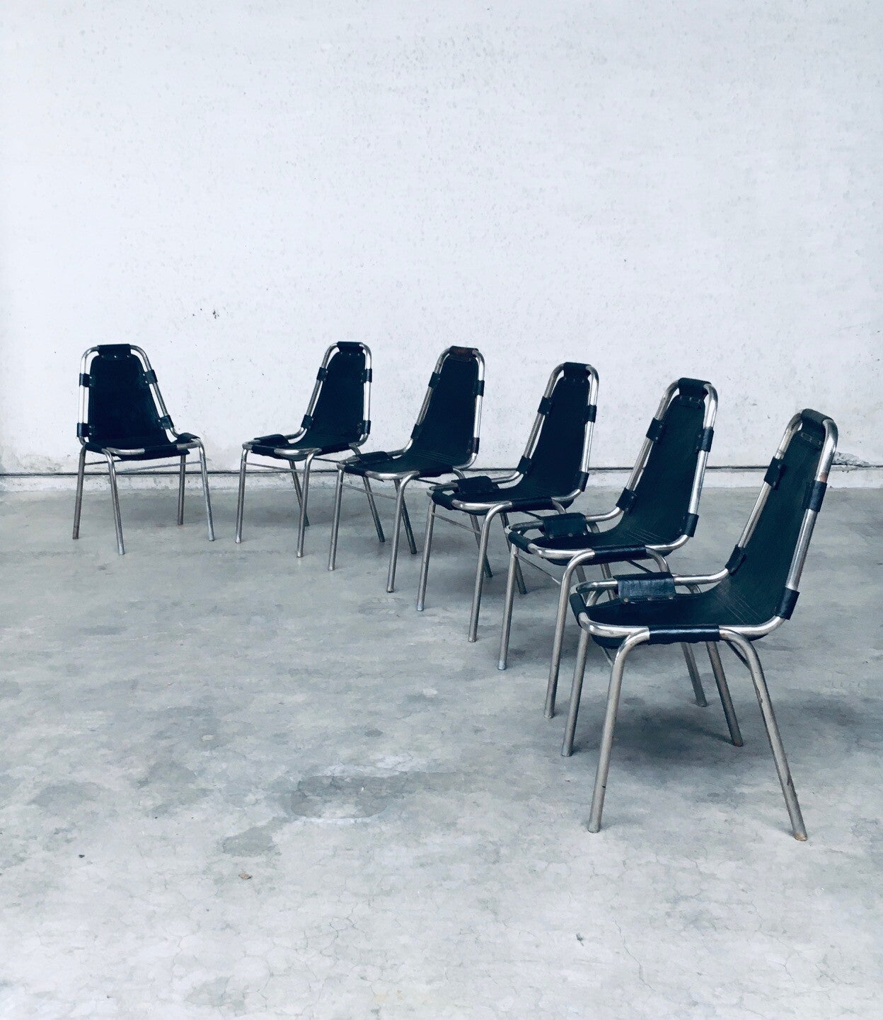Vintage Industrial Design Leather and Steel Dining Chair set of 6. Made in India, 1980's period. Leather on metal steel frame. These are stackable. The leather has been stained with thick black staining. On some chairs the brown leather shows thru. These are made after the famous chairs by Dal Vera selecetd by Charlotte Perriand for the Les Arcs Ski Resort in France. The quality of these chairs is far inferior to the originals. But they have a nice industrial looks with cool patina of the leather and on the steel. They are best used with a good cushion on the seat, as the leather has loosened over time. A cool set of chair in a great look. All chairs are in good, sturdy condition. Each chair measures 89cm x 51cm x 57cm - seat height 46cm.