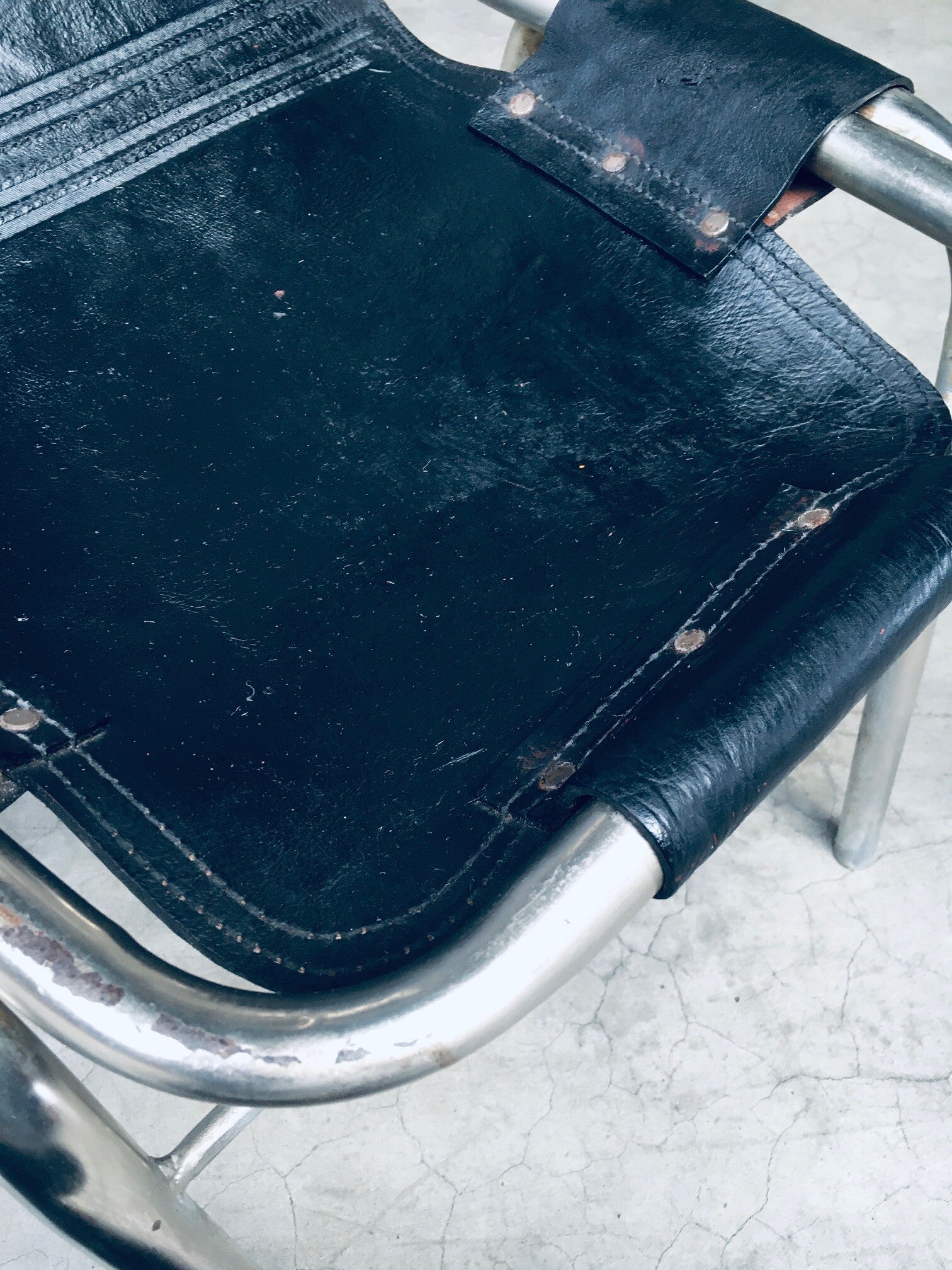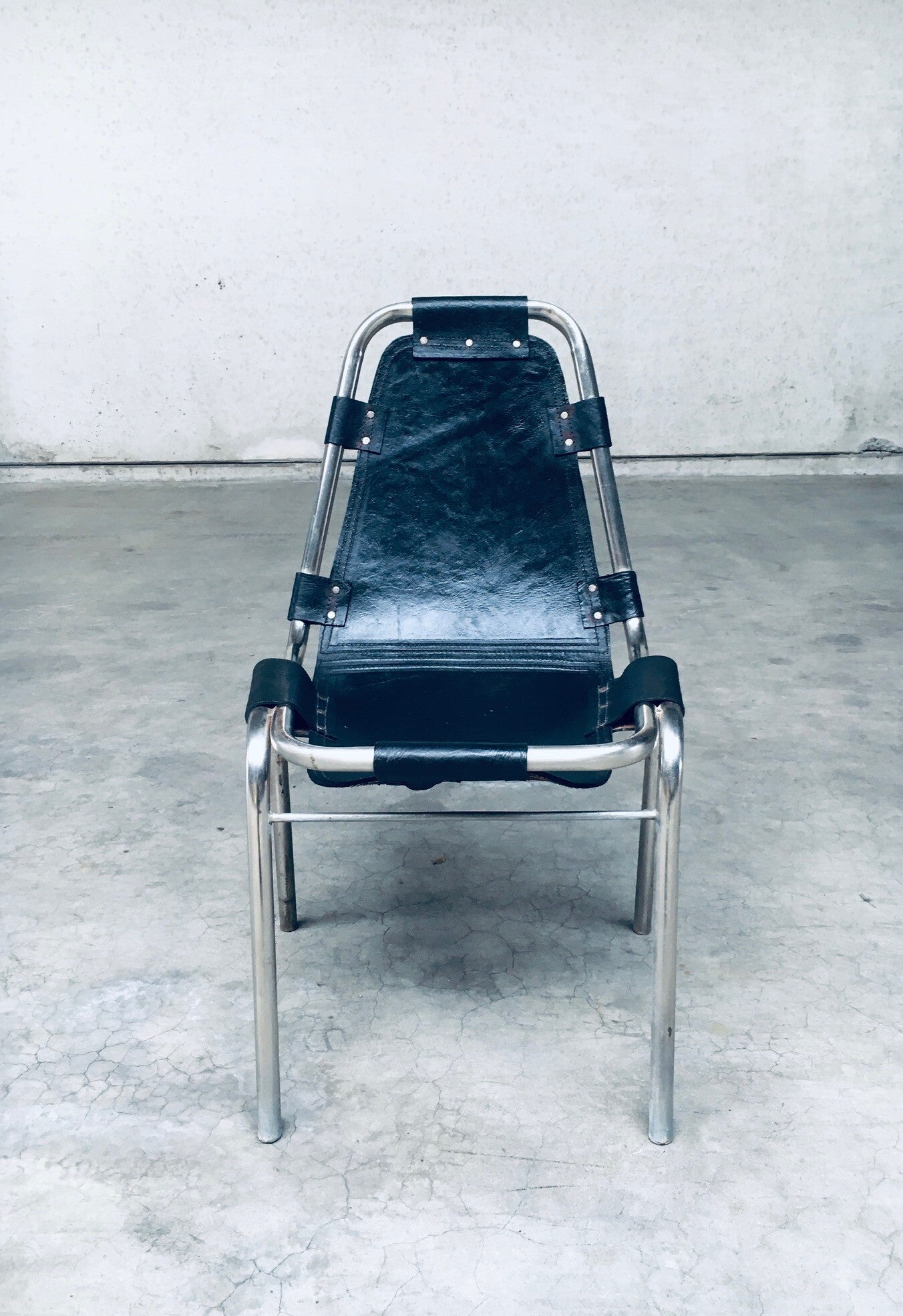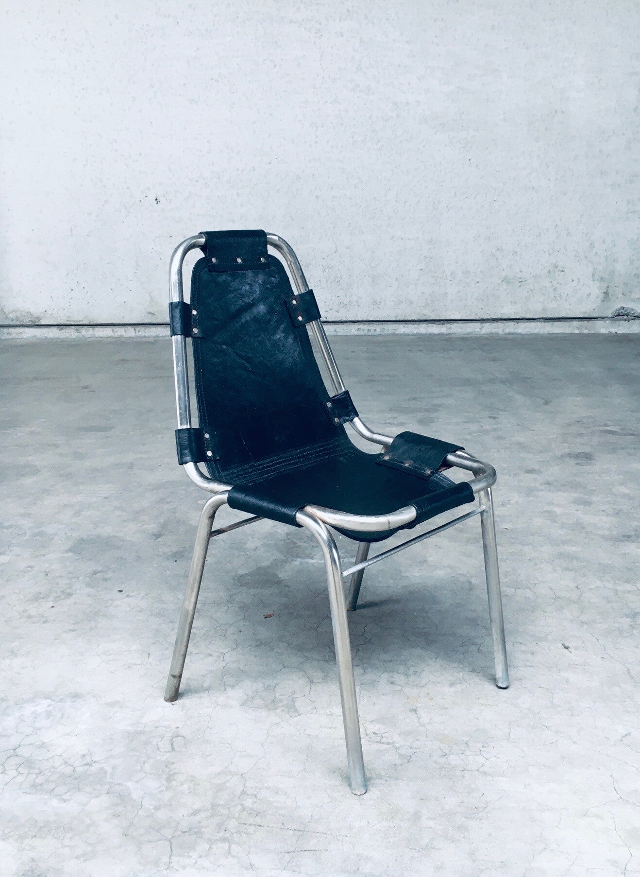 Vintage Industrial Design Leather and Steel Dining Chair set of 6. Made in India, 1980's period. Leather on metal steel frame. These are stackable. The leather has been stained with thick black staining. On some chairs the brown leather shows thru. These are made after the famous chairs by Dal Vera selecetd by Charlotte Perriand for the Les Arcs Ski Resort in France. The quality of these chairs is far inferior to the originals. But they have a nice industrial looks with cool patina of the leather and on the steel. They are best used with a good cushion on the seat, as the leather has loosened over time. A cool set of chair in a great look. All chairs are in good, sturdy condition. Each chair measures 89cm x 51cm x 57cm - seat height 46cm.