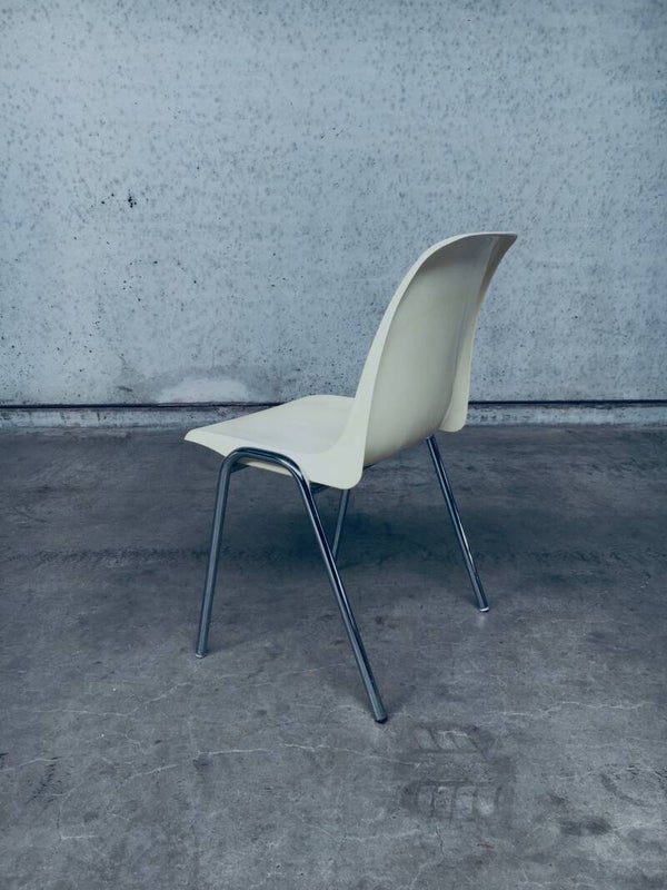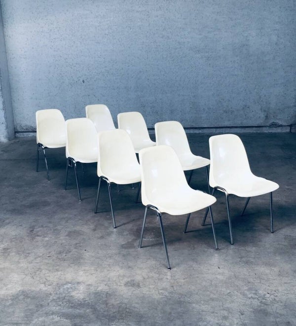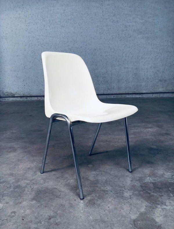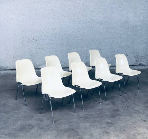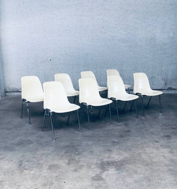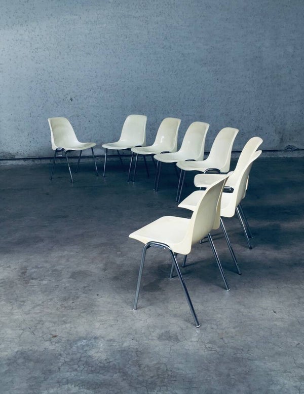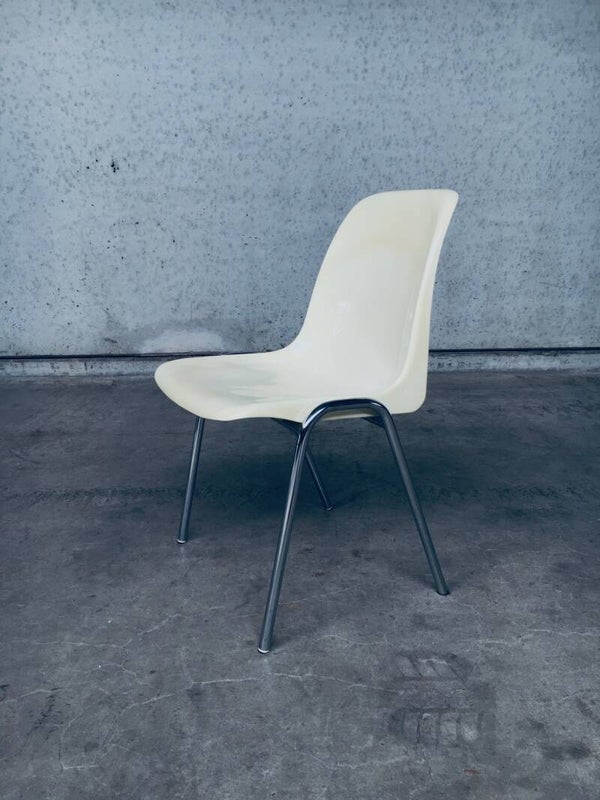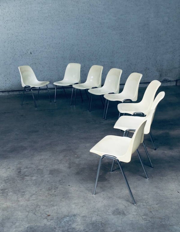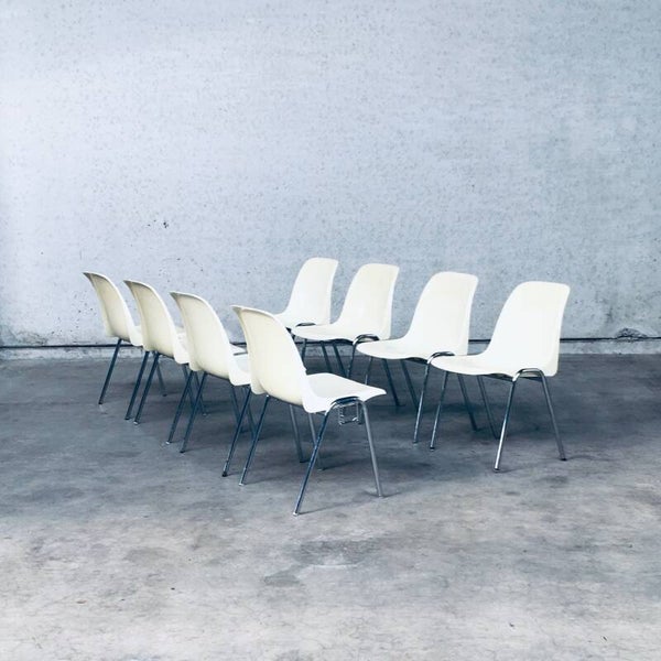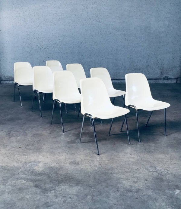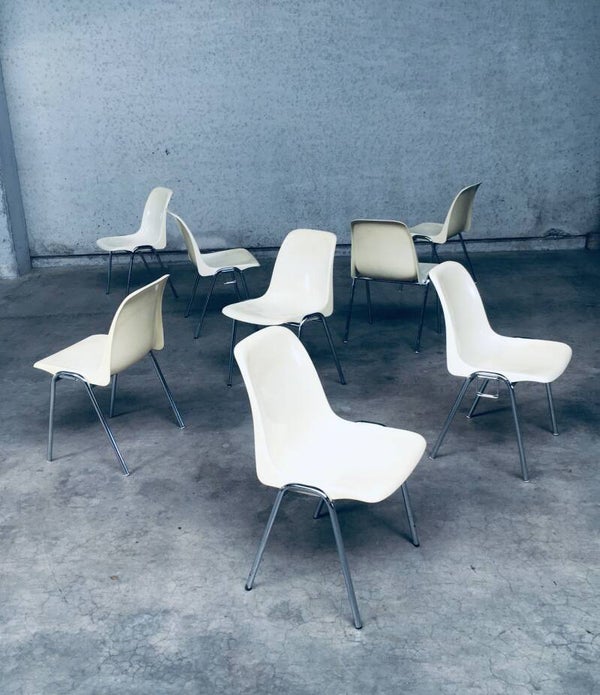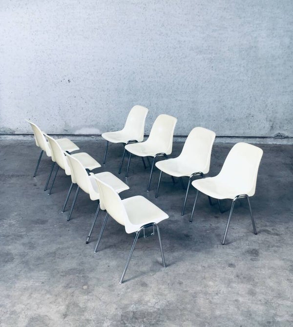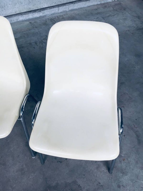 Vintage "ORLY" model stacking chairs by Bruno Pollak for Sulo. Made in Germany, 1970's period. Eggshell cream white plastic shells on chrome base. All chairs are in used condition, with wear, discoloration and markings on the plastic seats and chome base. Will be delivered with new black plastic covers for the feet. Each chair measures 80cm x 50cm x 50cm - Seat height 45cm.