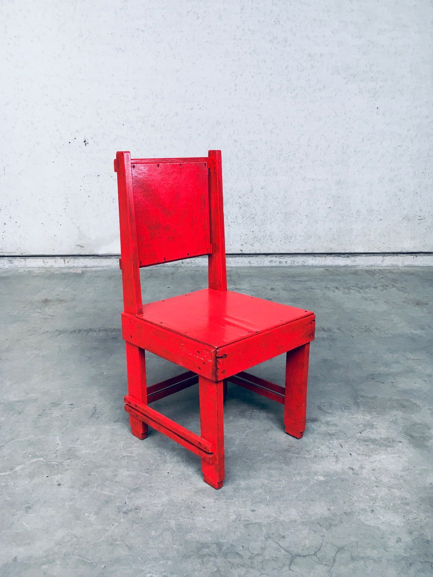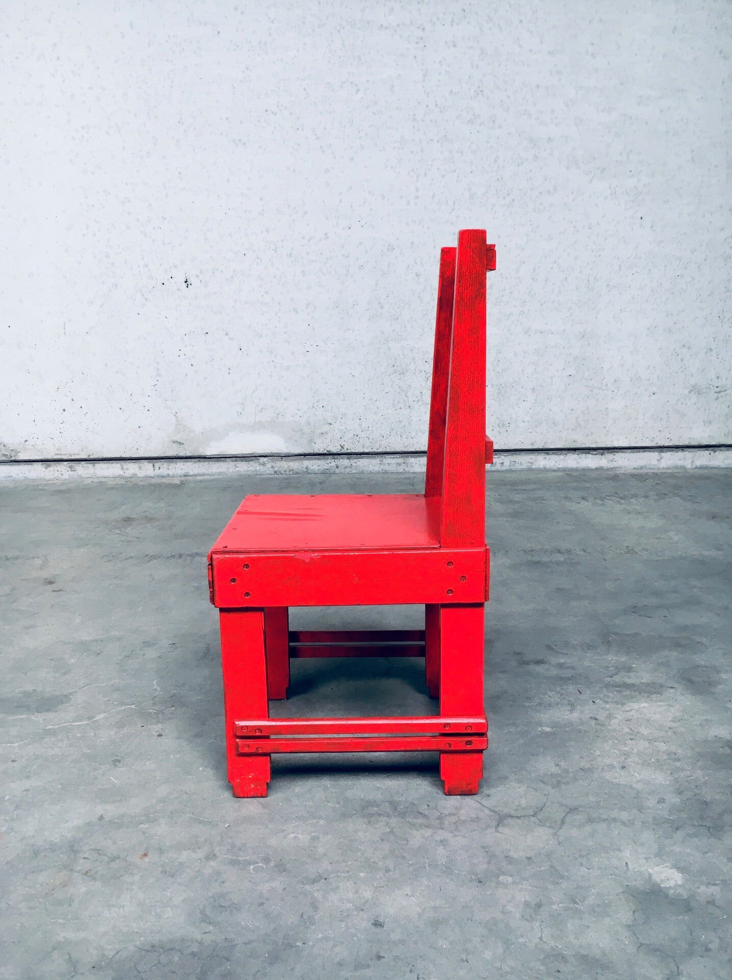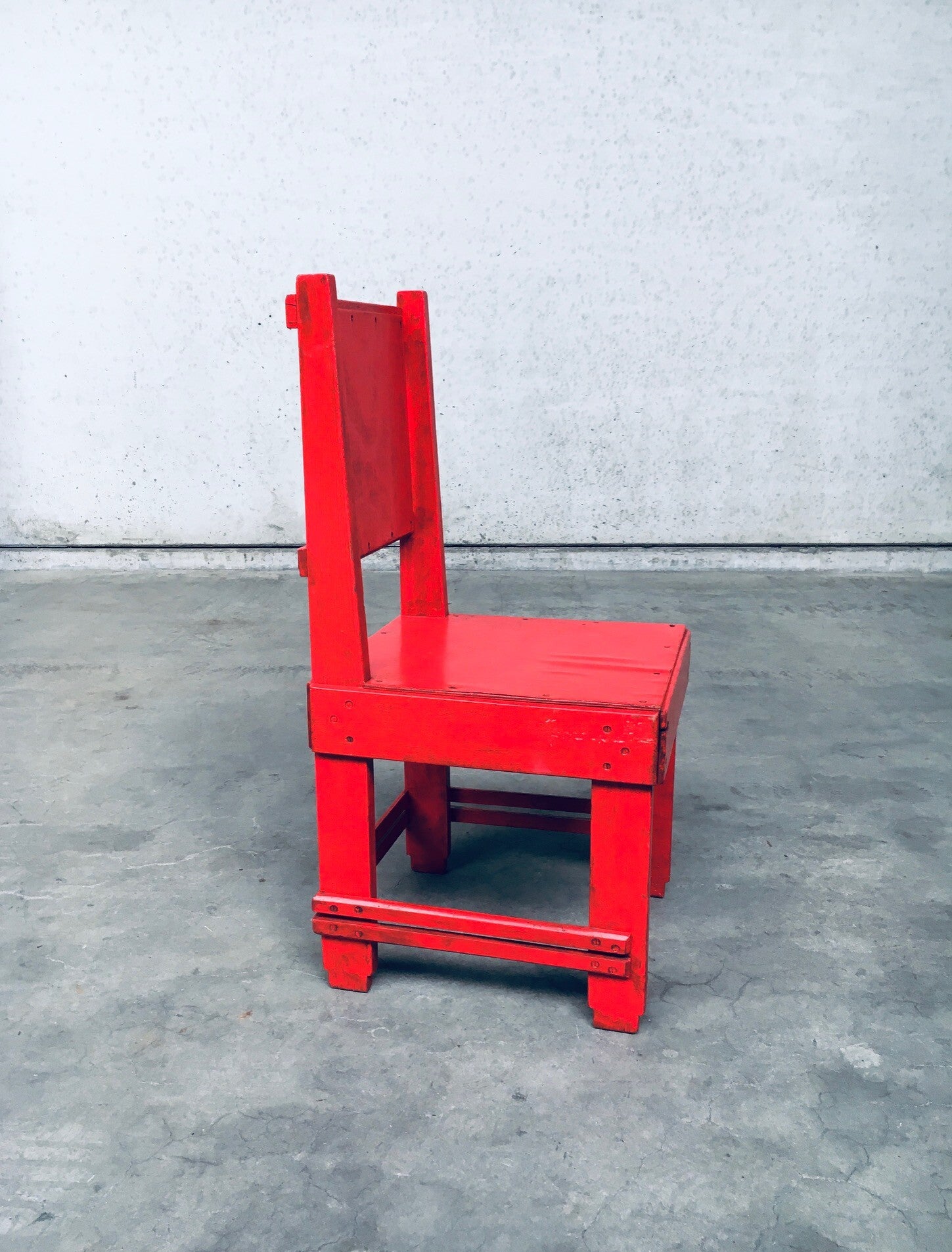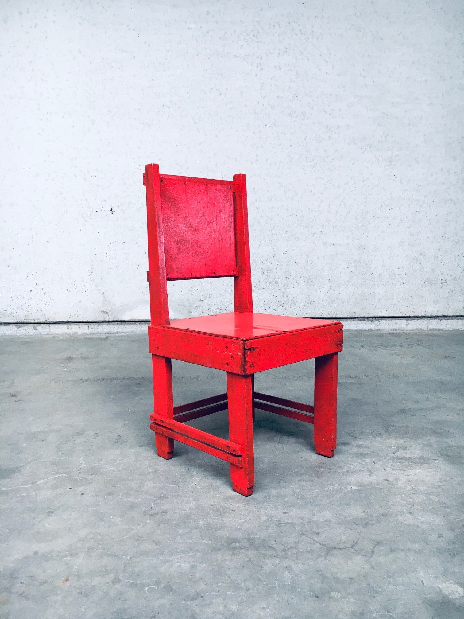 Very Rare Early 20th Century 'De Stijl Movement' Dutch Modernist Design Side Chair attributed to Jan Wils. Made in the Netherlands, 1920's / 30's period. Red painted oak, beech and plywood constructed chair. The red paint has been done in the 1950's according to the previous owner. This comes in good and sturdy overal condition. Measures 94cm x 45,5cm x 47cm - Seat height 44,5cm.