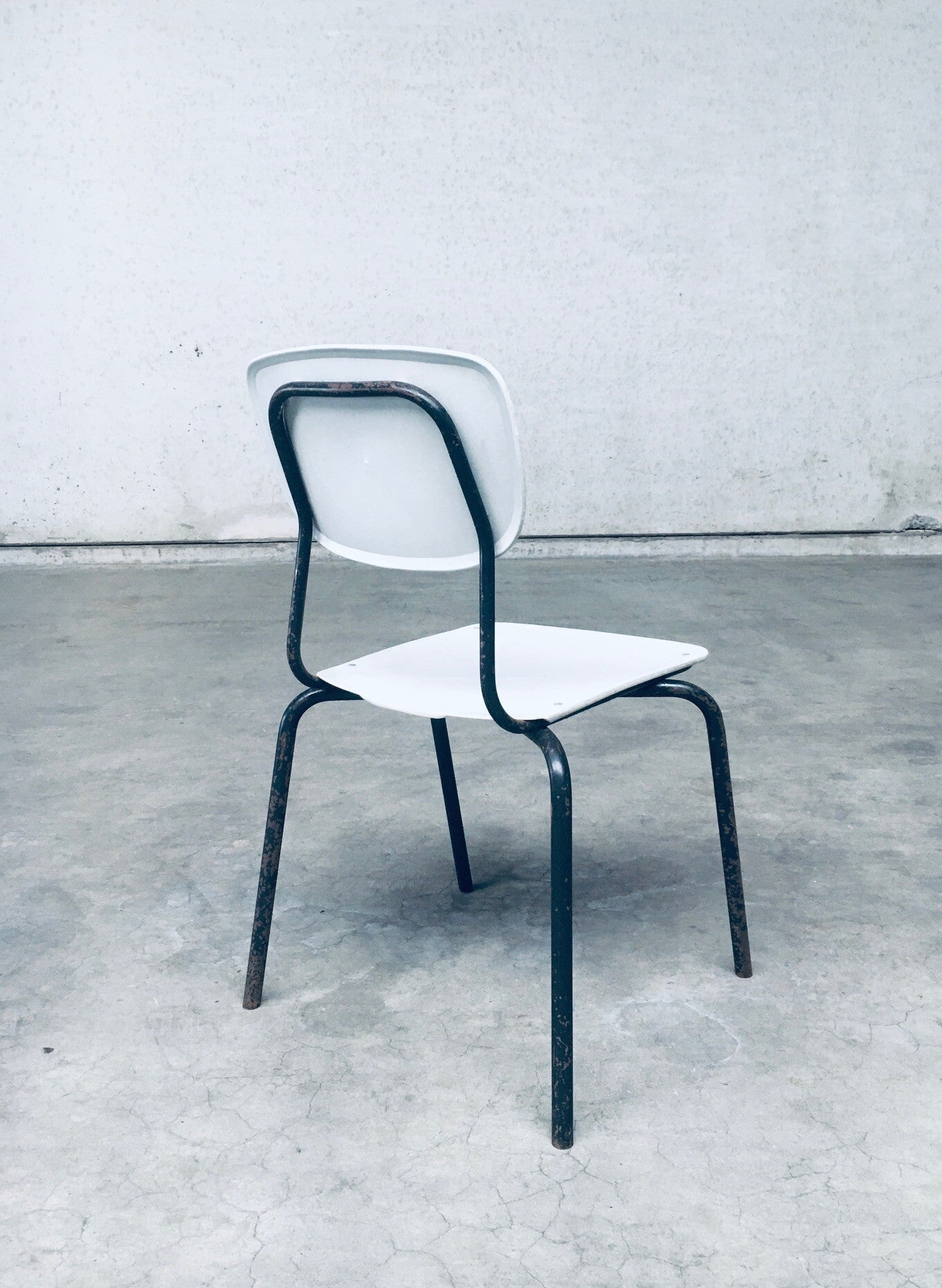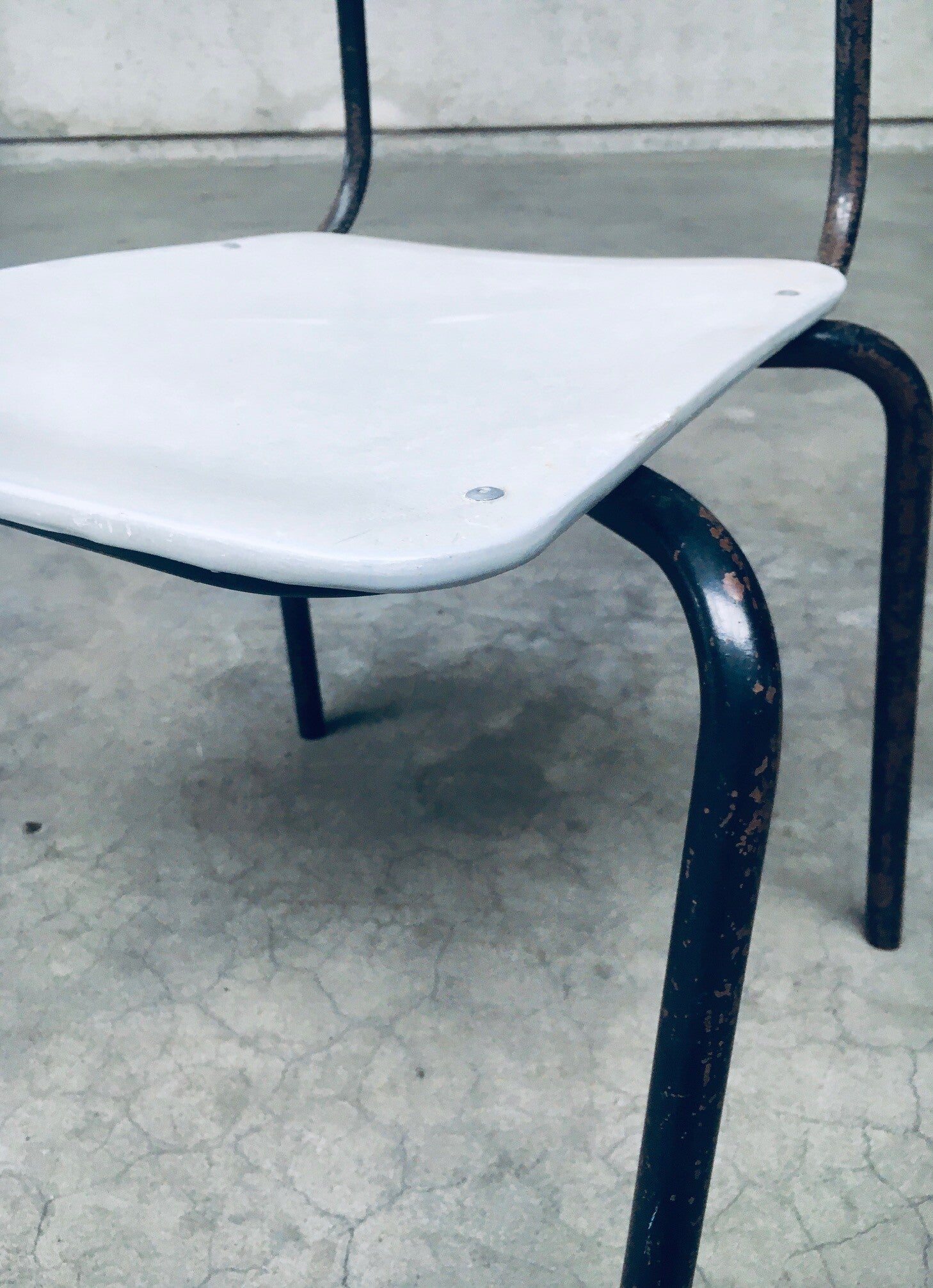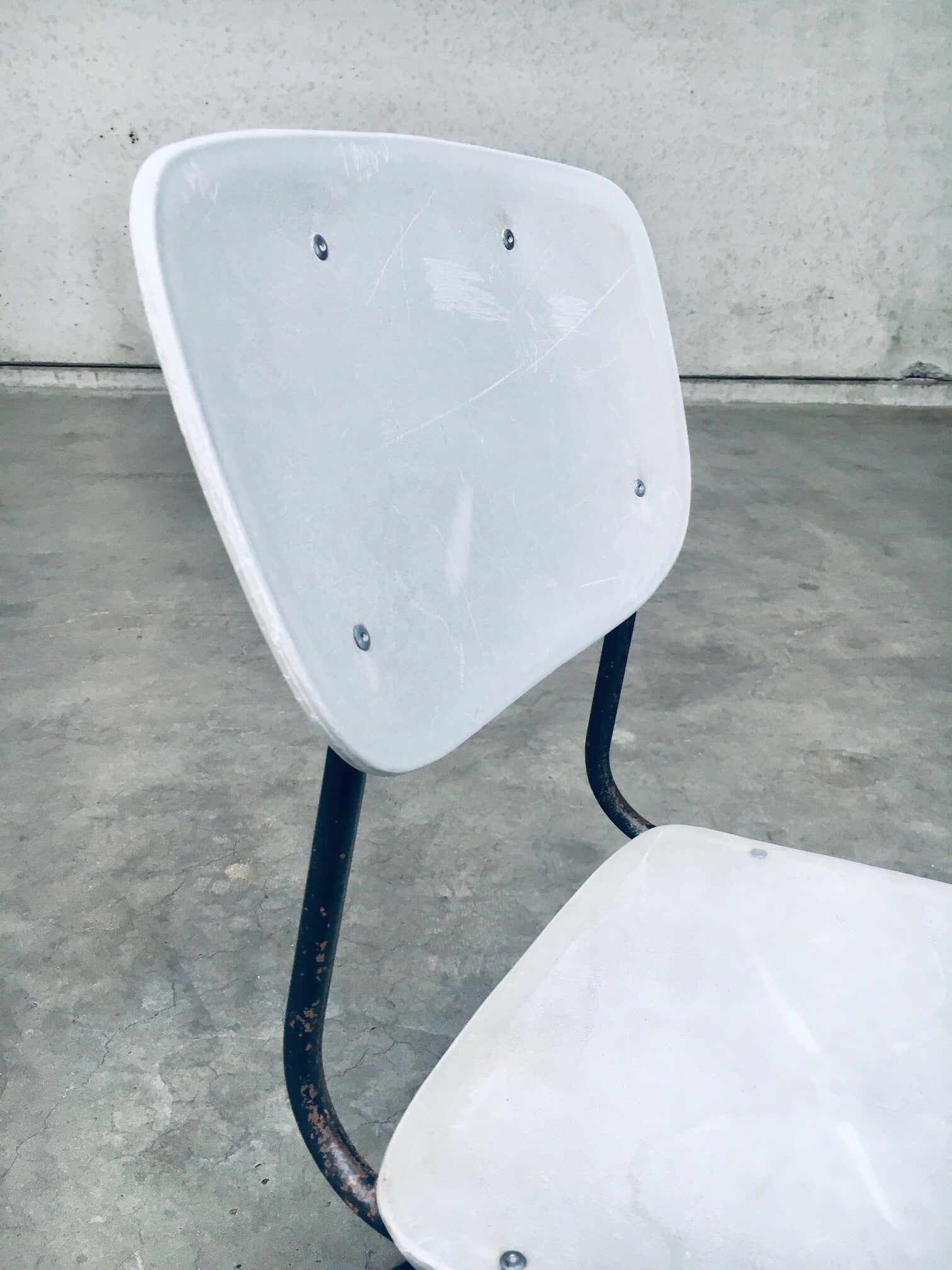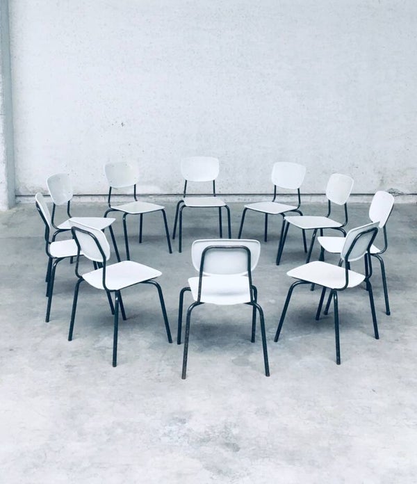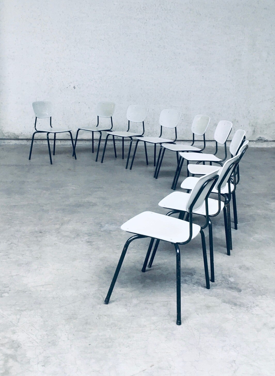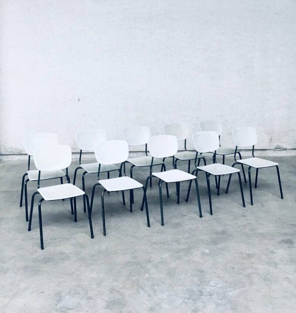 Vintage Midcentury Modern Industrial Design Stacking Chair set of 10 pieces. Made in the Netherlands, 1960's period. Designed in the manner of Willy Van Der Meeren. These have no maker markings. Grey plastic seat and backrest on black tubular metal frame. All chairs are in rough, used and patinated condition. All plastic seats and backrests have scratches, discolorations and obvious signs of their use and age. The black lacquered metal frames all have rustspots and paint loss. But they are all in very sturdy, original condition. And are very neat for use in an industrial style designed interior or workspace. Each chair measures 82,5cm x 48cm x 49cm. Seat height is 44cm.