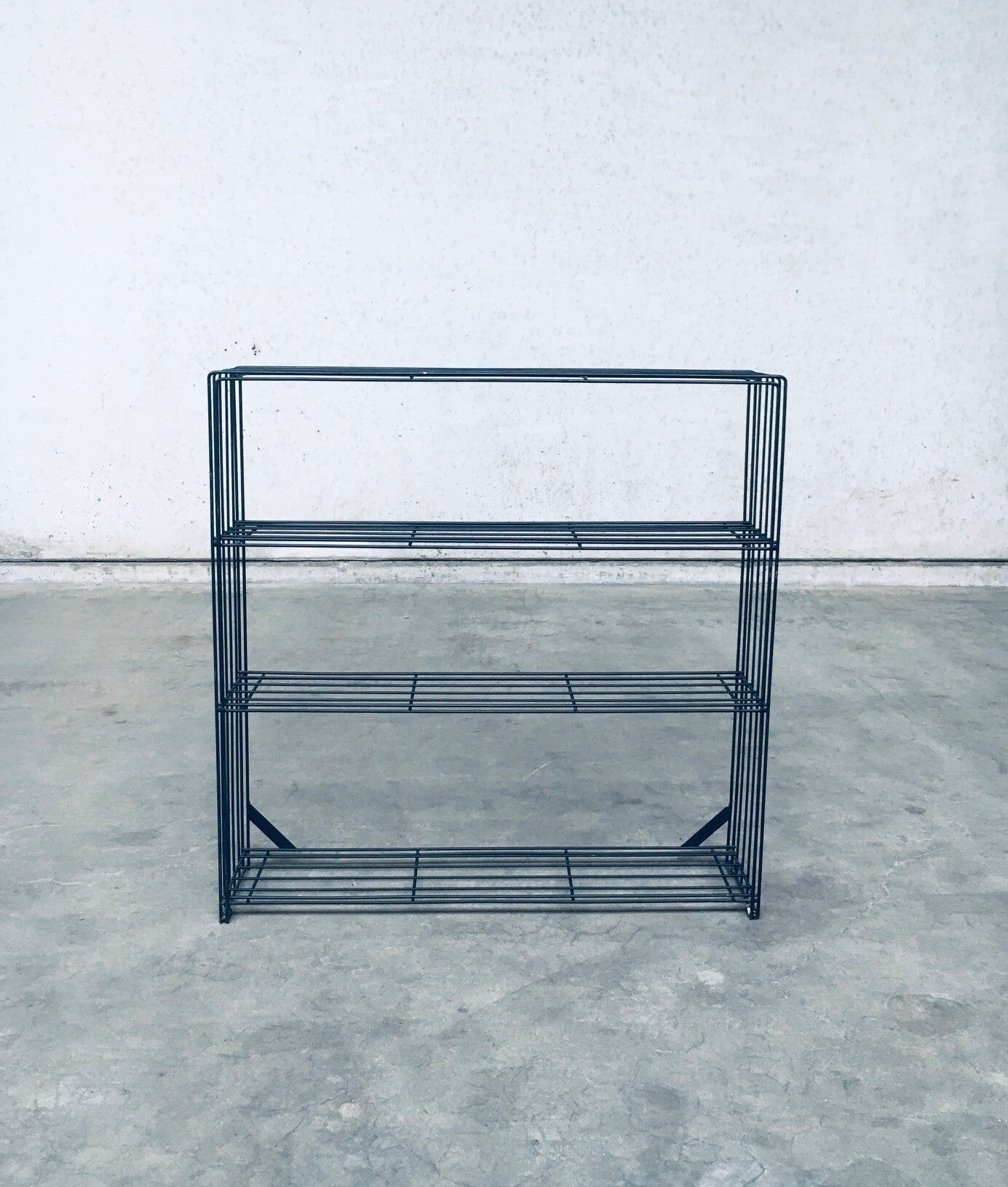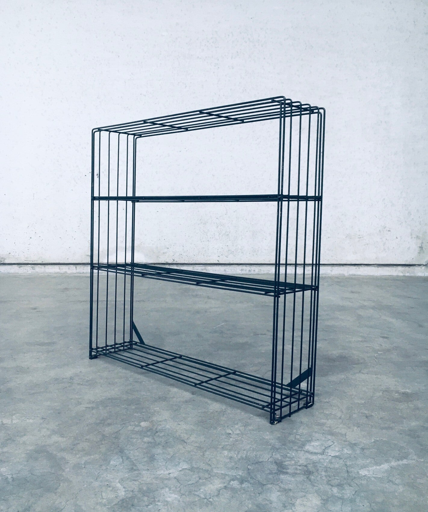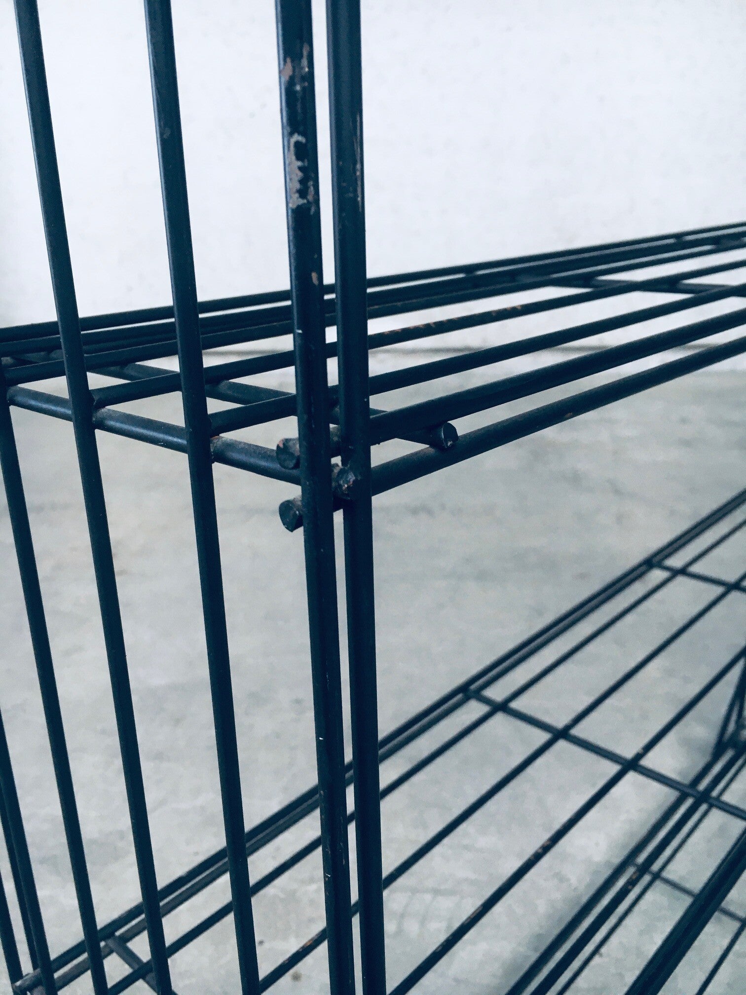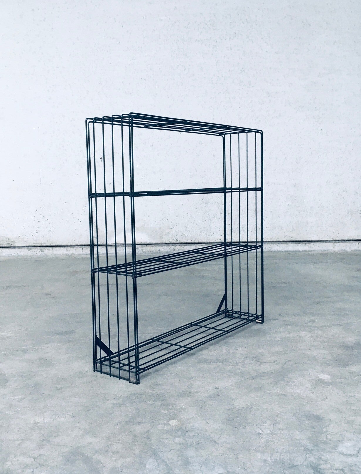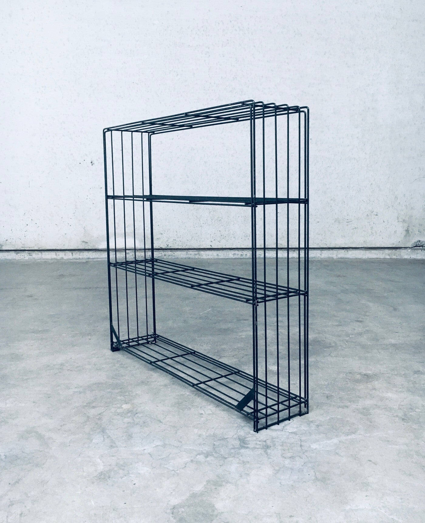 Vintage Midcentury Modern Dutch Industrial Design Storage Rack by Tjerk Reijenga for Pilastro. Made in the Netherlands, 1958. Minimalist and architectural in design. Storage rack, display shelves or book case. Black lacquered metal wire frame construction. This comes in very good, all original condition. Measures 101cm x 100cm x 23,5cm.