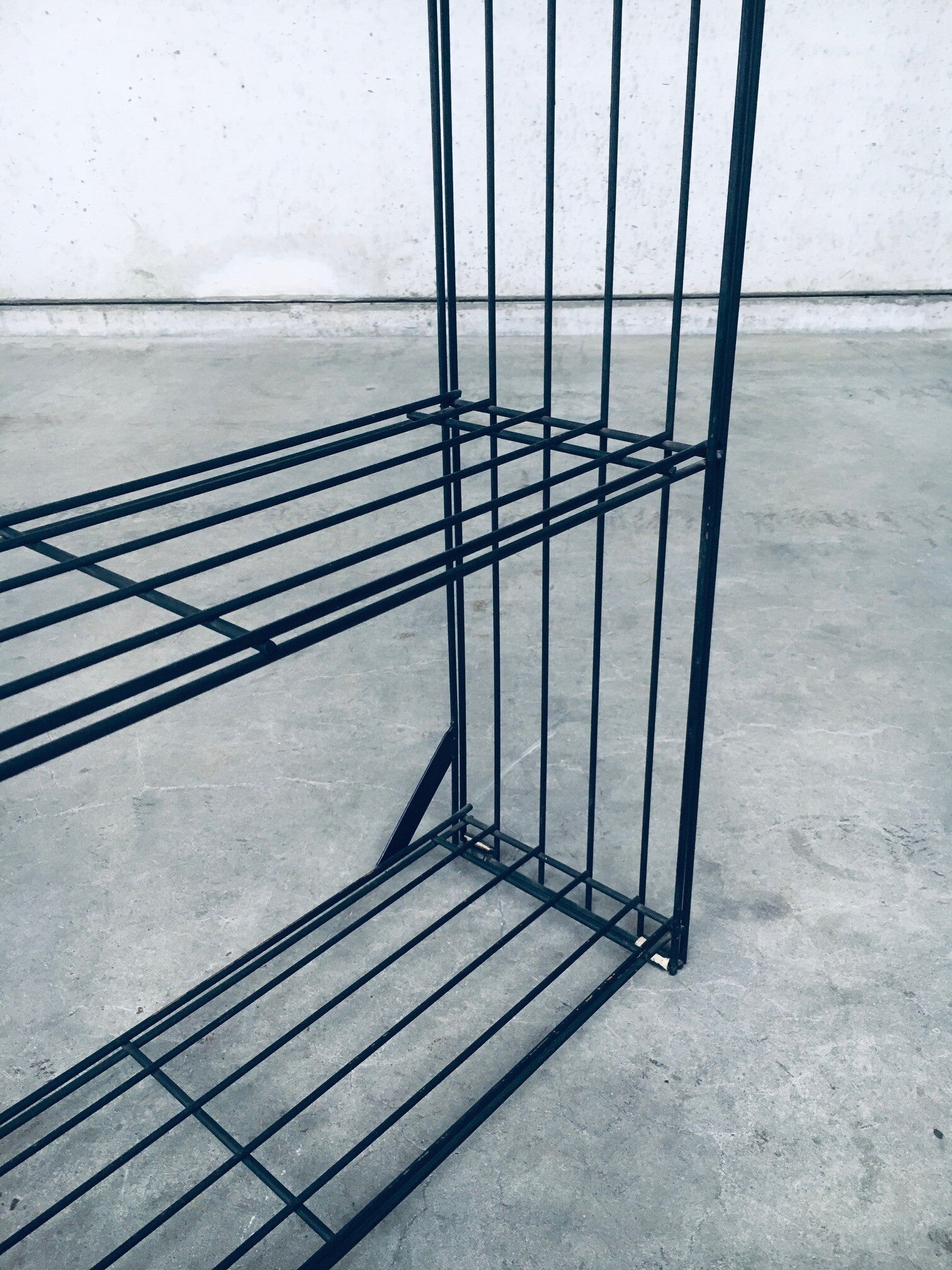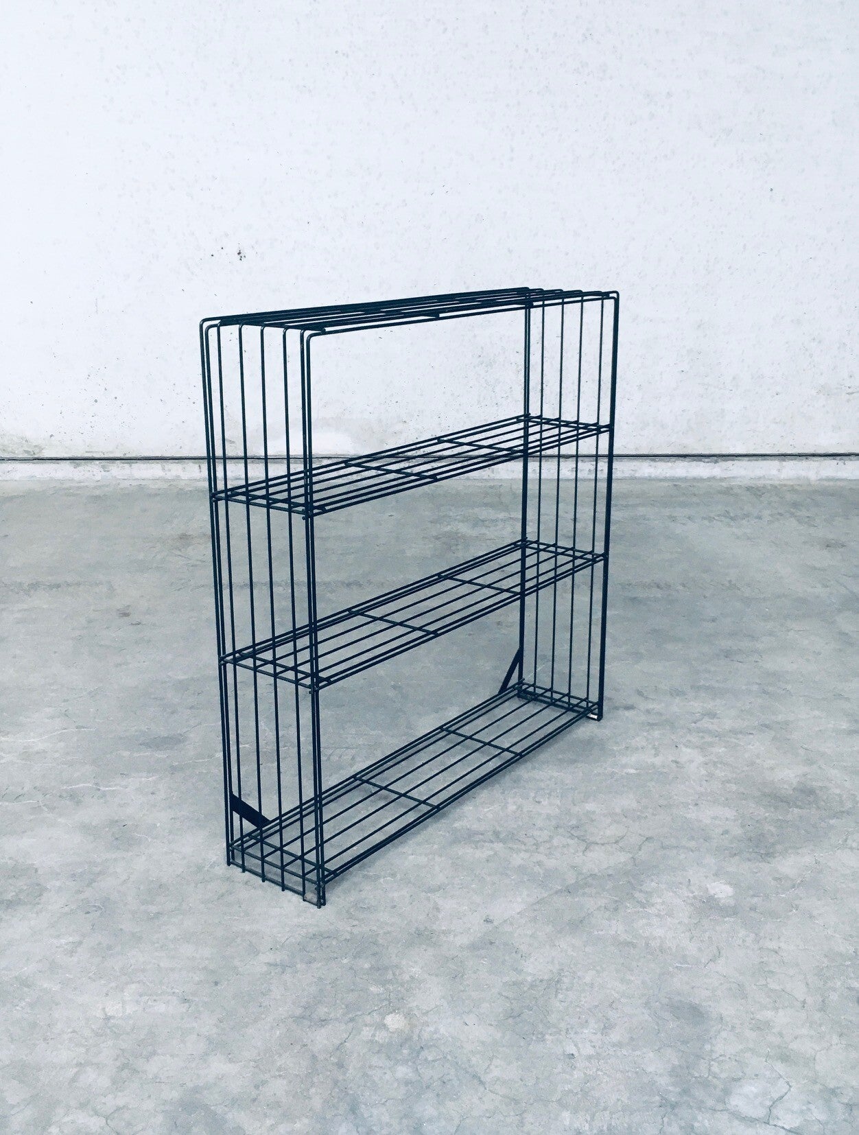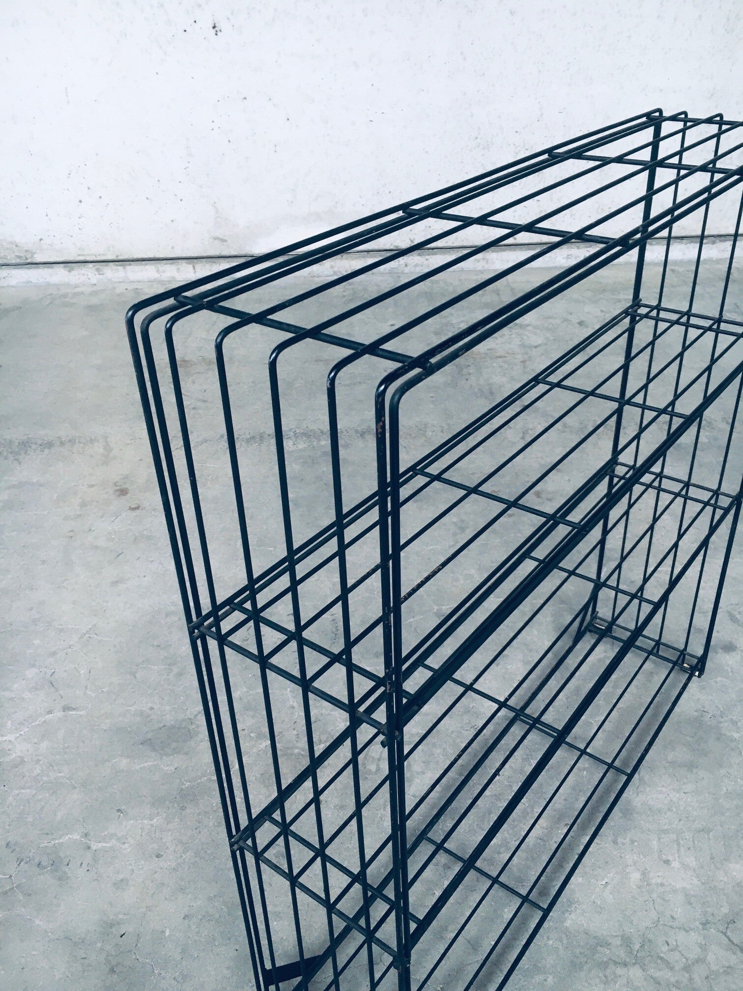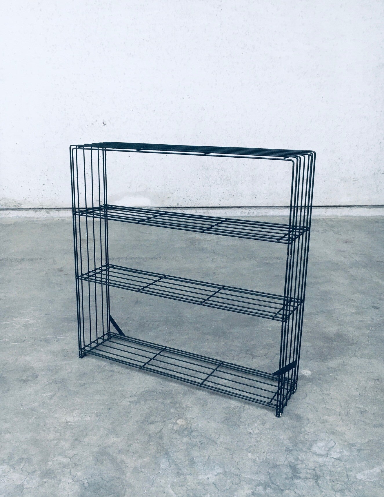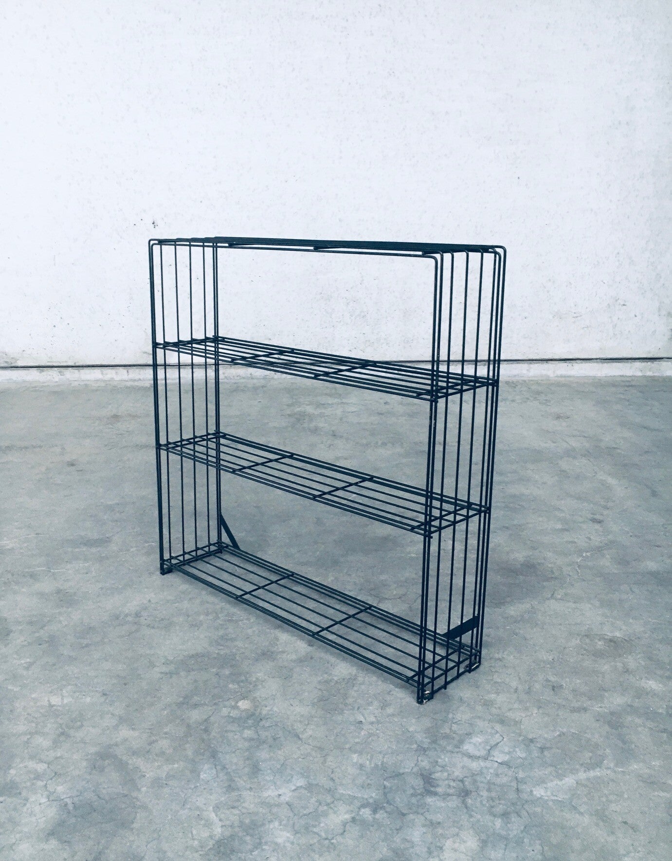 Vintage Midcentury Modern Dutch Industrial Design Storage Rack by Tjerk Reijenga for Pilastro. Made in the Netherlands, 1958. Minimalist and architectural in design. Storage rack, display shelves or book case. Black lacquered metal wire frame construction. This comes in very good, all original condition. Measures 101cm x 100cm x 23,5cm.