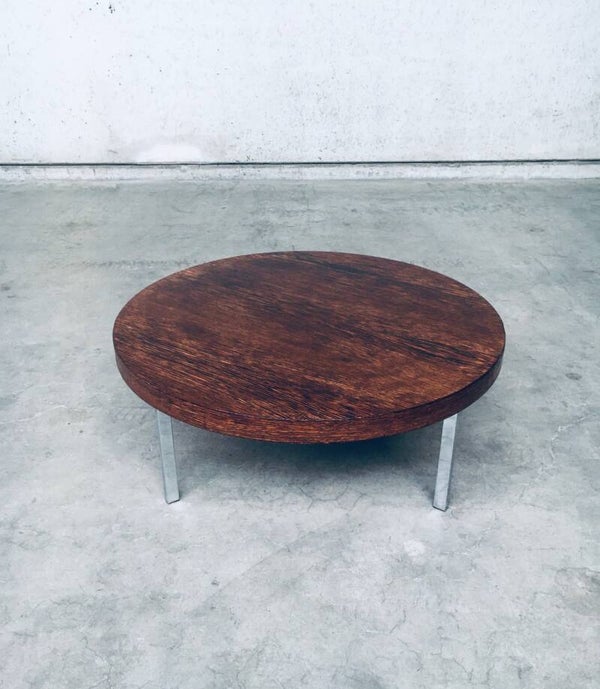 Vintage Midcentury Modern Dutch Design Round Tripod Wenge Coffee Table. Made in the Netherlands, 1960's period. Wenge wood veneer on chrome tripod feet. Minimalist design on this smaller size round coffee or side table. This comes in very good, all original condition with normal signs of it's use and age. This measures 41cm x 89cm x 89cm.