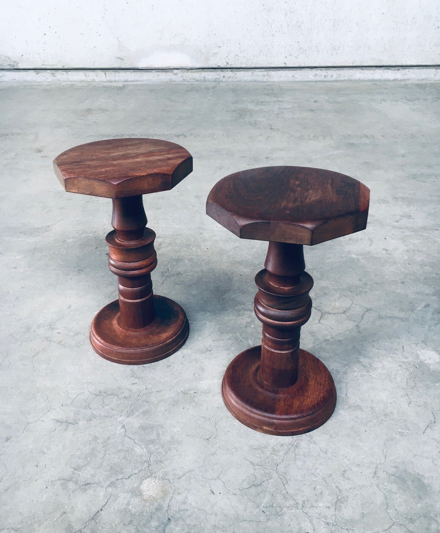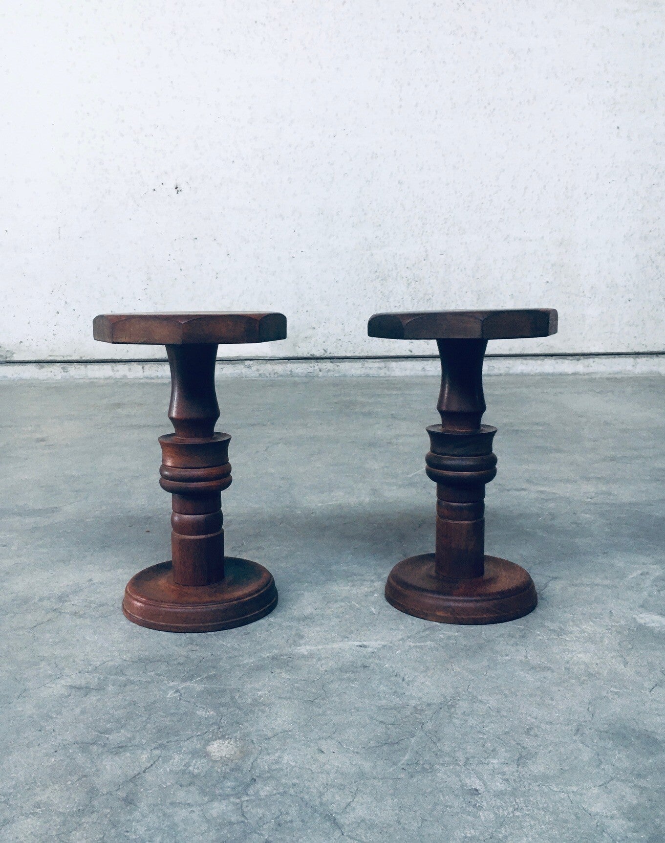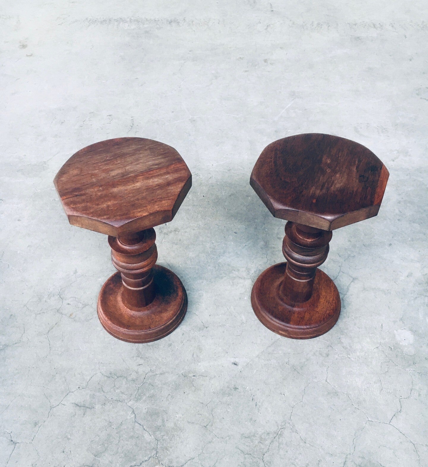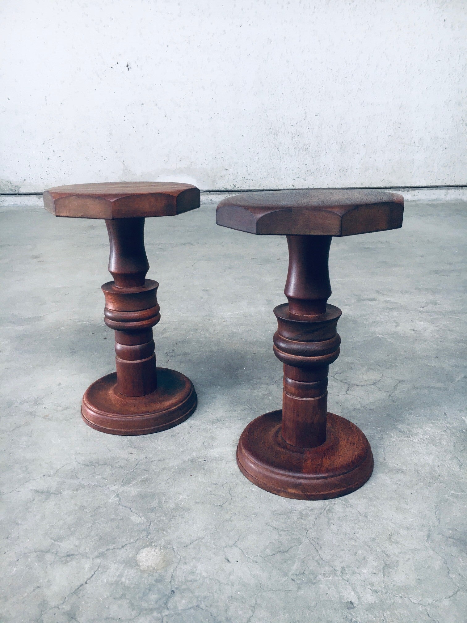 Brutalist Design Hand Crafted Art Populaire Side table / plant stool set in the style of Charles Dudouyt Designs. Made in France, 1940's period. Solid wood constructed and hand turned side tables with octagonal top. They both come in very good condition, with minor wear from their age and use. Each side table measures 44,5cm x 26,5cm x 26,5cm.