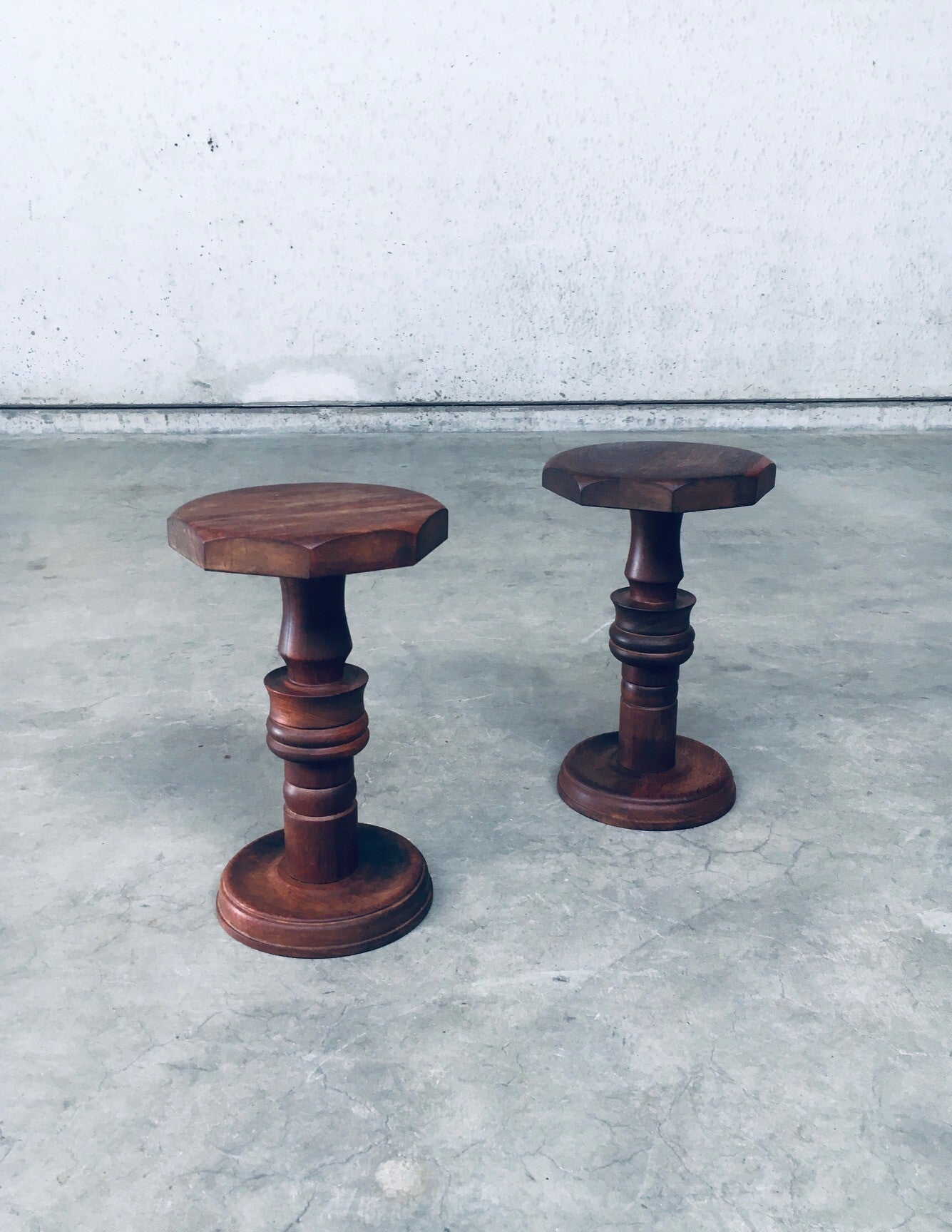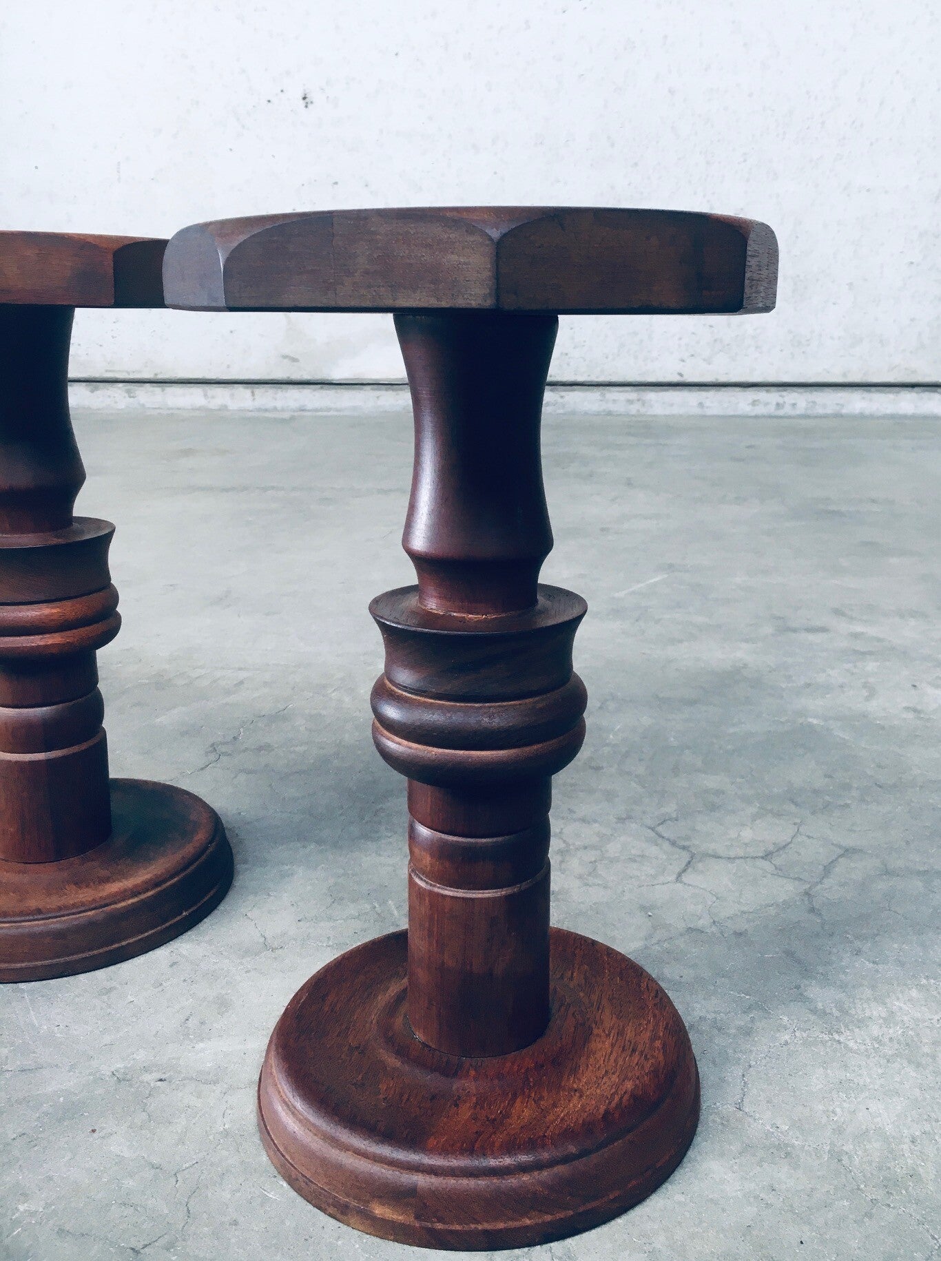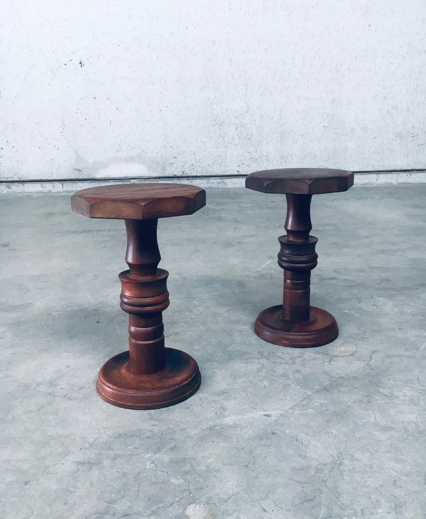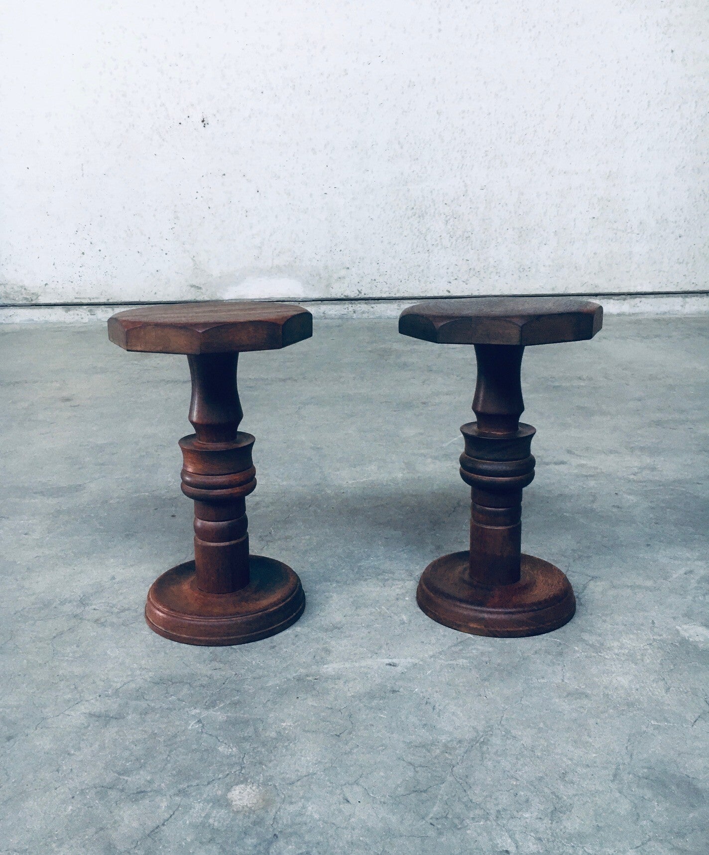 Brutalist Design Hand Crafted Art Populaire Side table / plant stool set in the style of Charles Dudouyt Designs. Made in France, 1940's period. Solid wood constructed and hand turned side tables with octagonal top. They both come in very good condition, with minor wear from their age and use. Each side table measures 44,5cm x 26,5cm x 26,5cm.