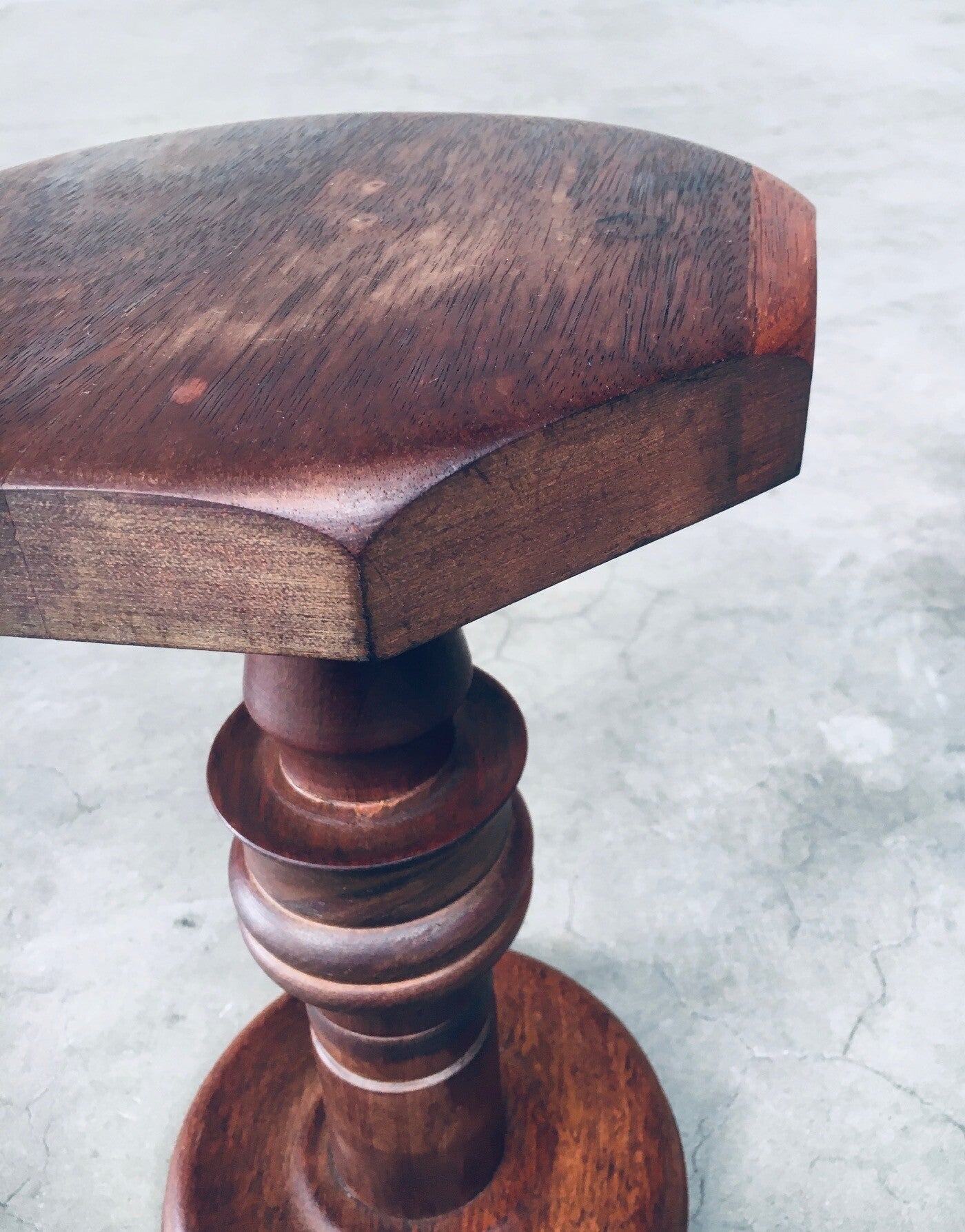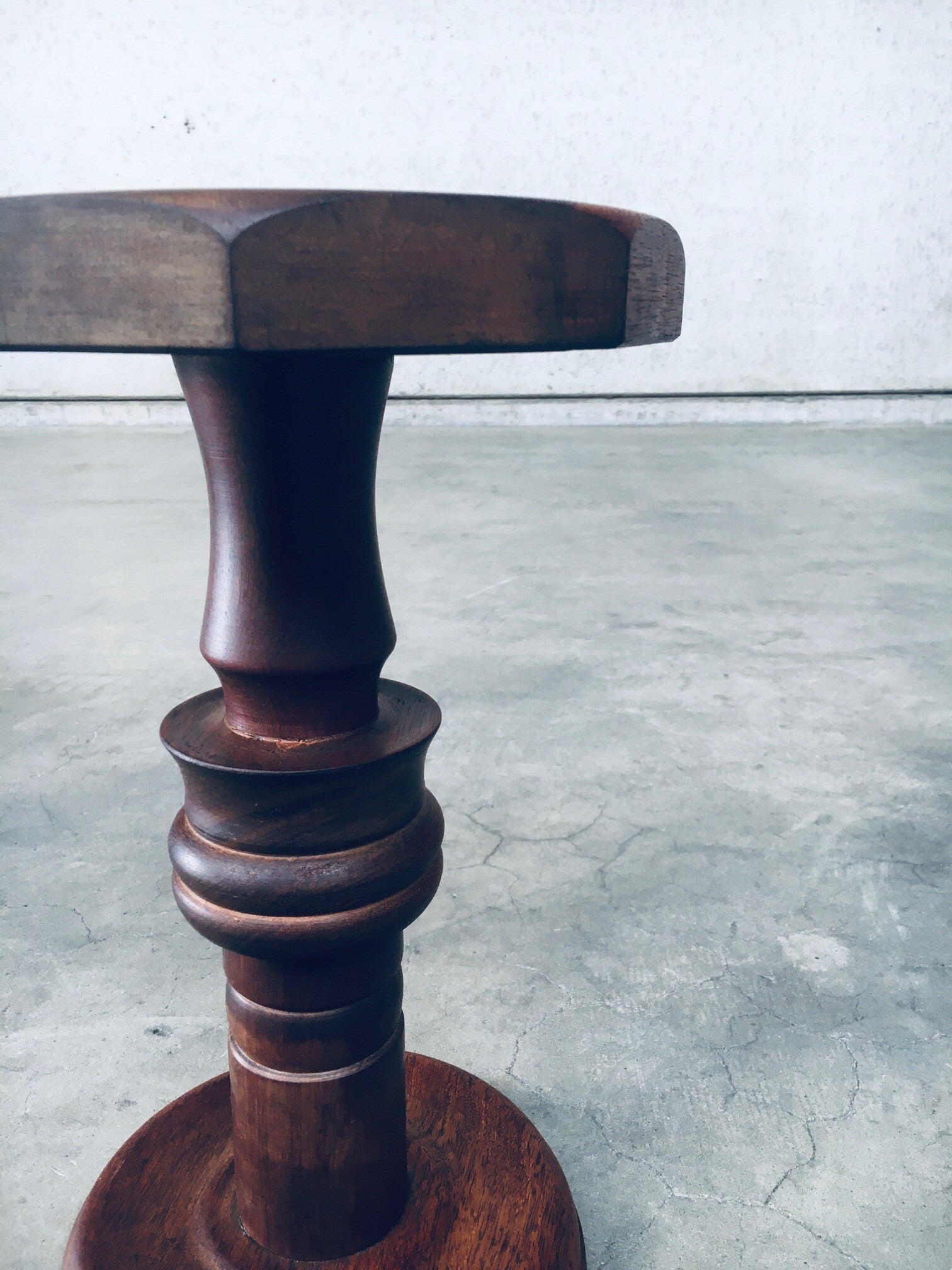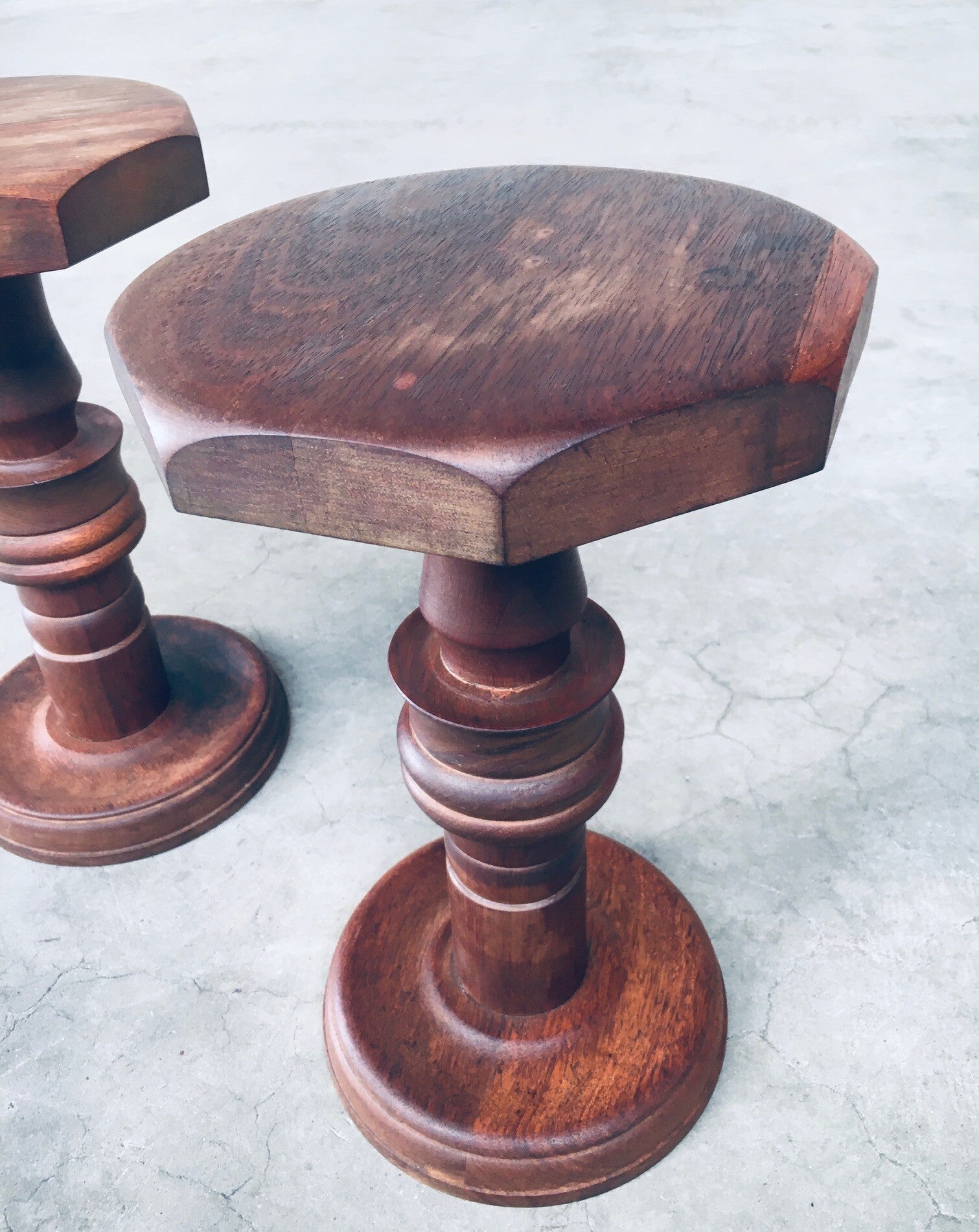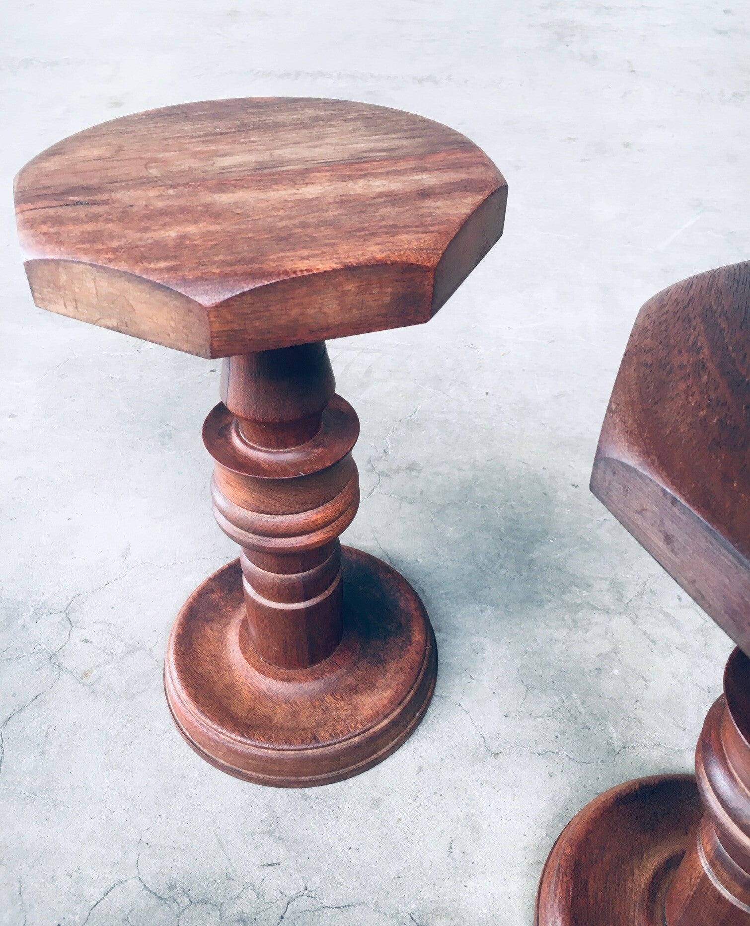 Brutalist Design Hand Crafted Art Populaire Side table / plant stool set in the style of Charles Dudouyt Designs. Made in France, 1940's period. Solid wood constructed and hand turned side tables with octagonal top. They both come in very good condition, with minor wear from their age and use. Each side table measures 44,5cm x 26,5cm x 26,5cm.