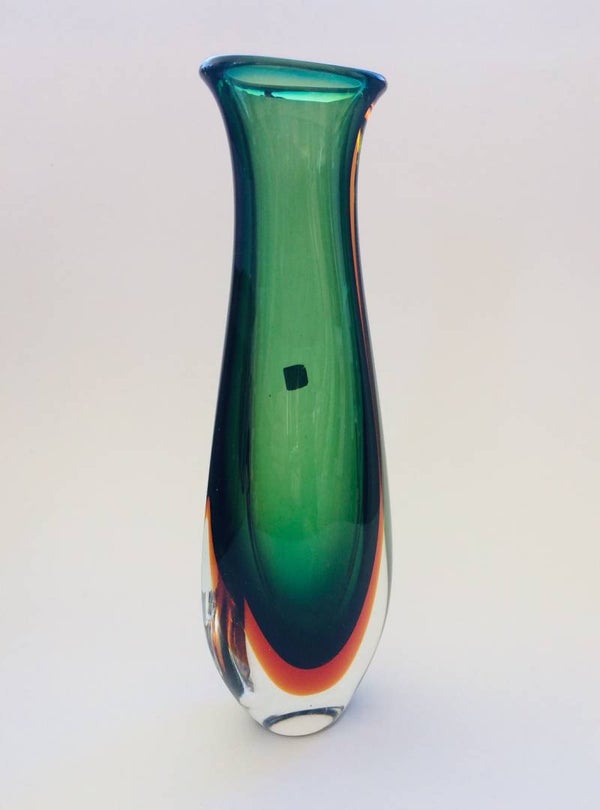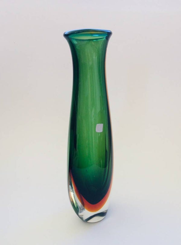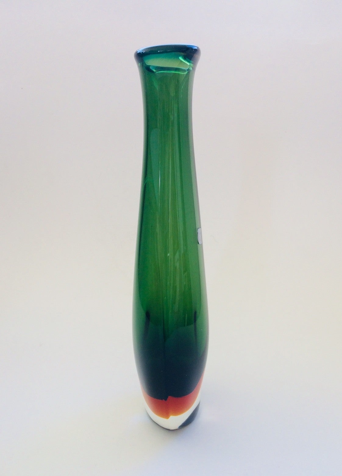 Vintage Midcentury Modern Design Large Art Glass Stem Vase by Flavio Poli, Sommerso Murano, Italy 1960's. In perfect condition. 36cm high x 11,5cm x 7,5cm. Green & Amber layered under clear glass. With original sticker.