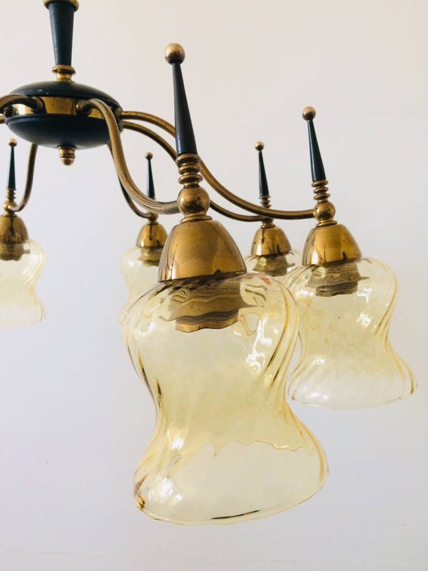 Vintage Midcentury Modern Design 1950's Atomic Age brass & glass large chandelier hanging lamp. 8 Lights with amber glass covers. In very good condition for it's age. Total height, including chain: about 80cm x 60cm x 60cm.