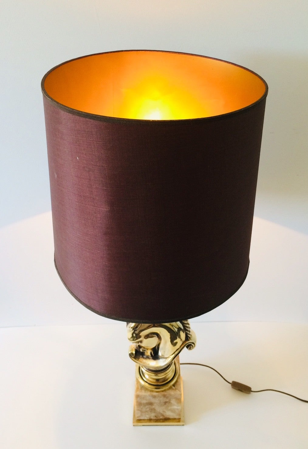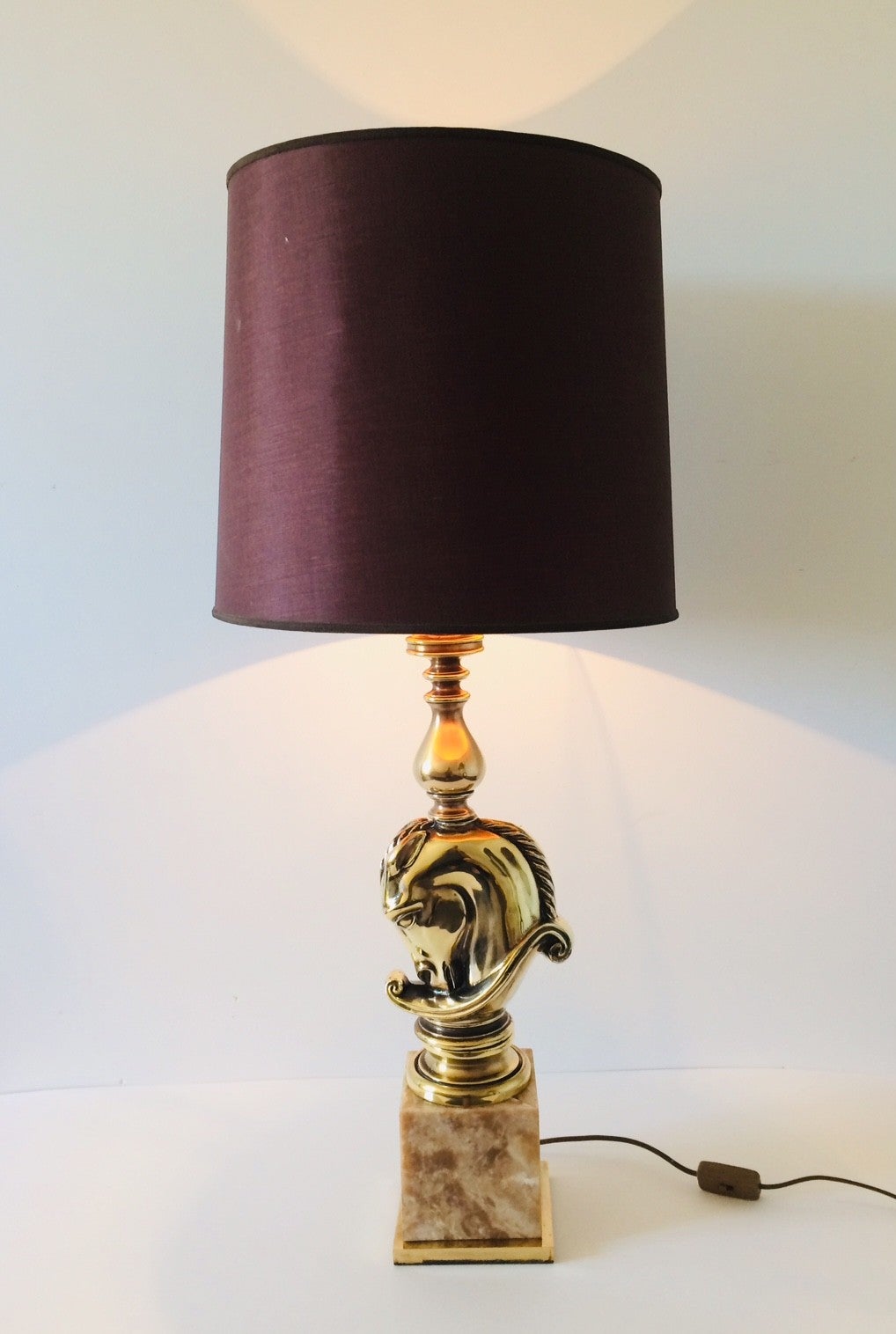 Vintage Midcentury Modern Hollywood Regency Style Design large brass horse head table lamp by Deknudt, Belgium, 1970's. Impressive brass structure with square onyx base. Complete with brown shade with gold interior. The brass parts are slightly loose on each other. In good original condition. 91cm x 40cm x 40cm.