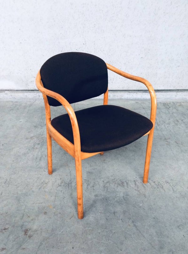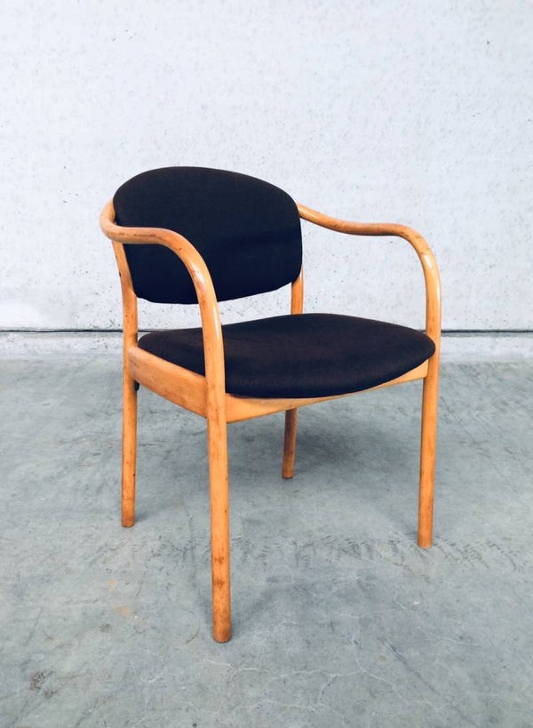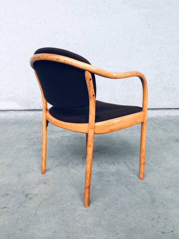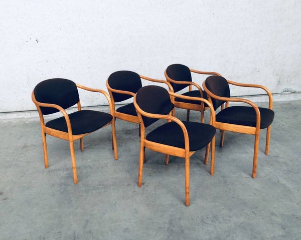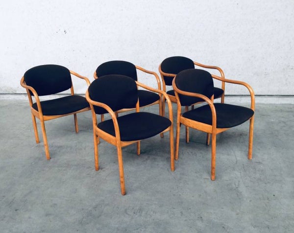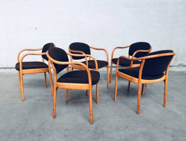 Vintage original Design set of 5 Dining Chairs by Thonet, marked Thonet 82. Made in 1982. Chairs are in good condition, one has a cigarette burn in fabric. All others are fine. Original brown fabric.