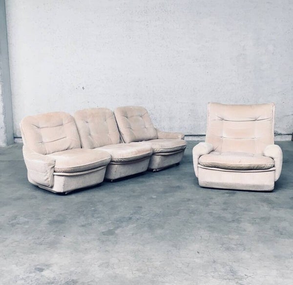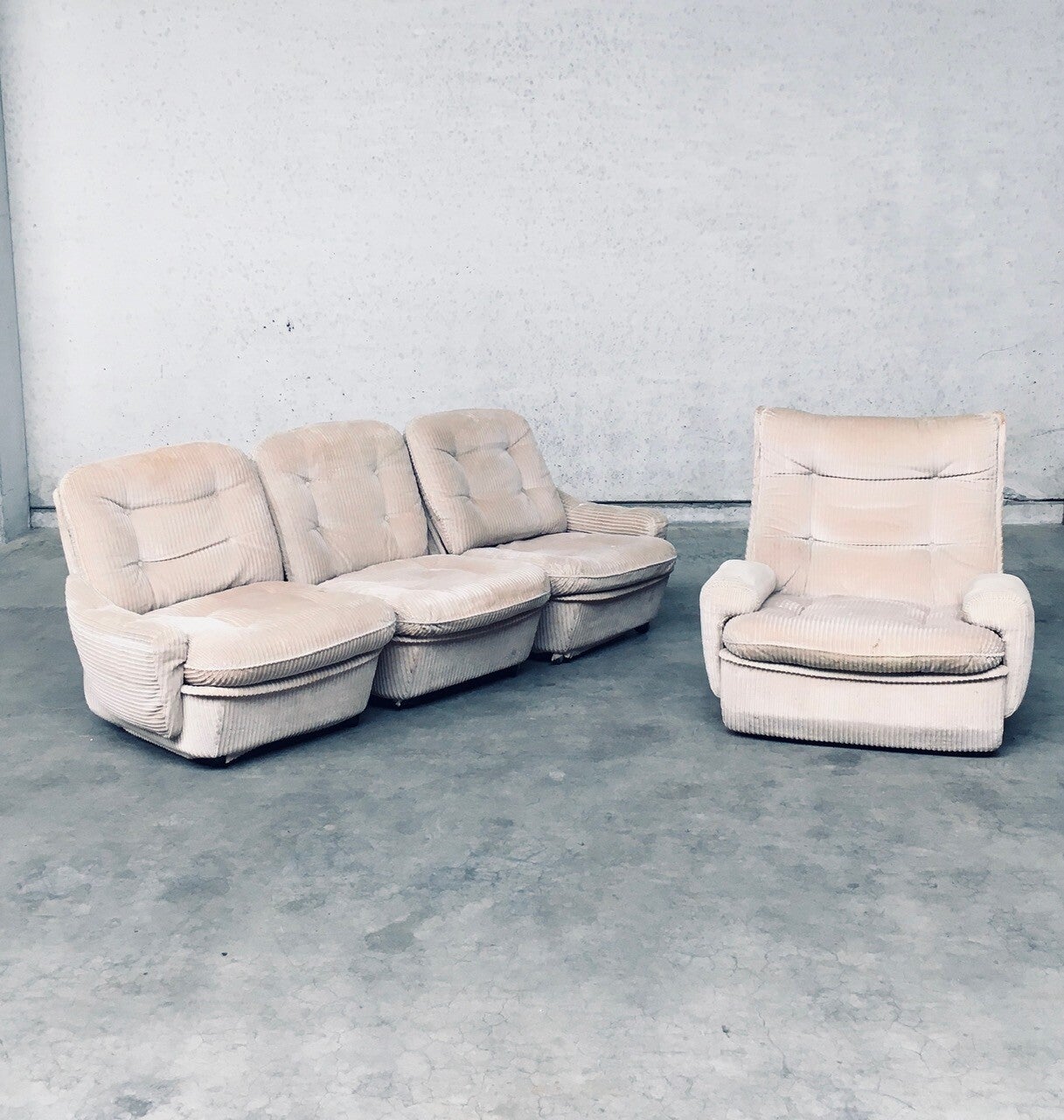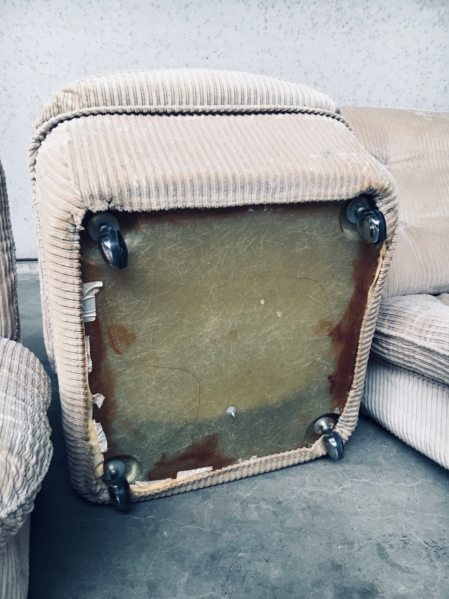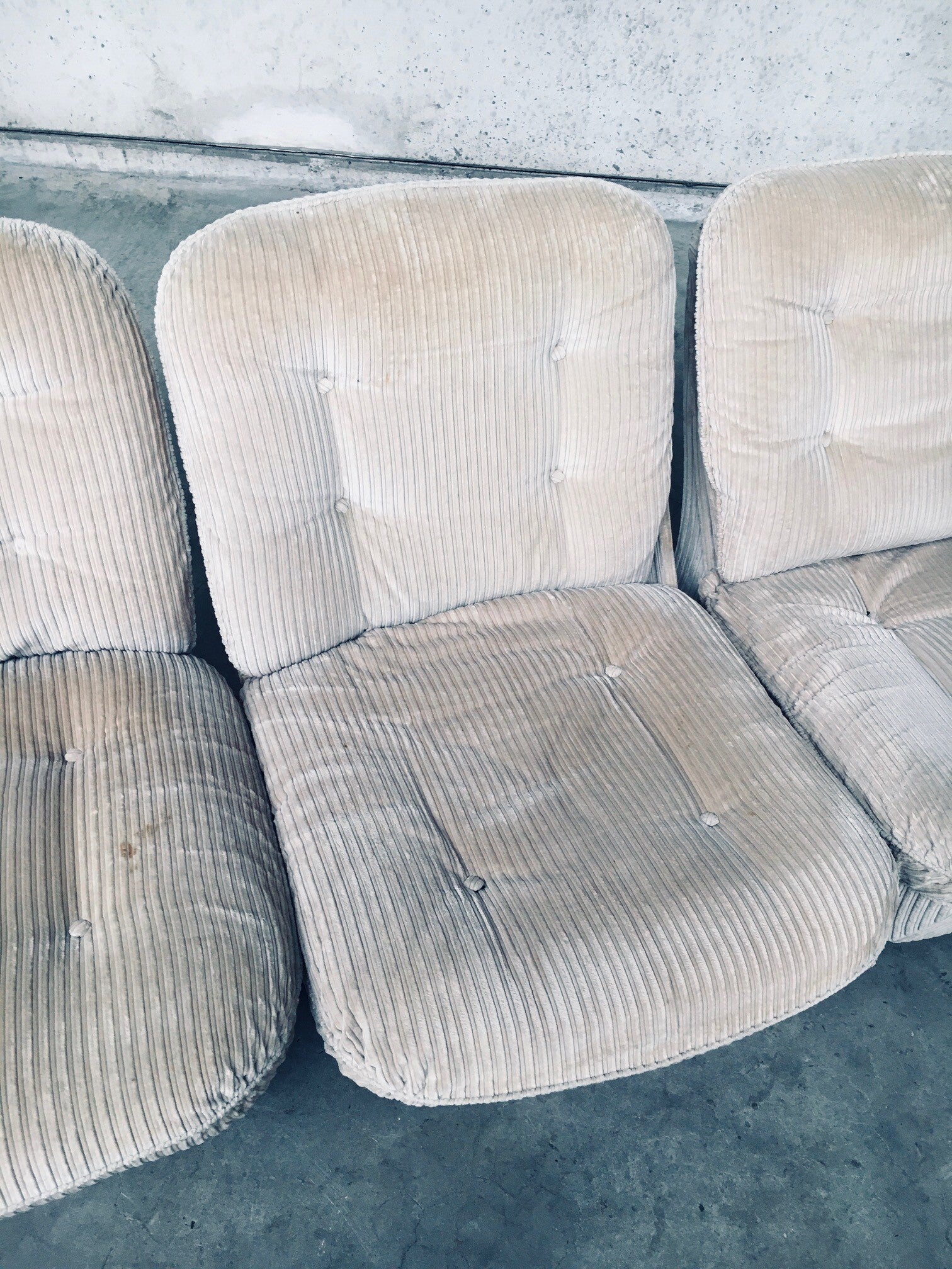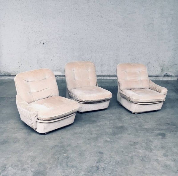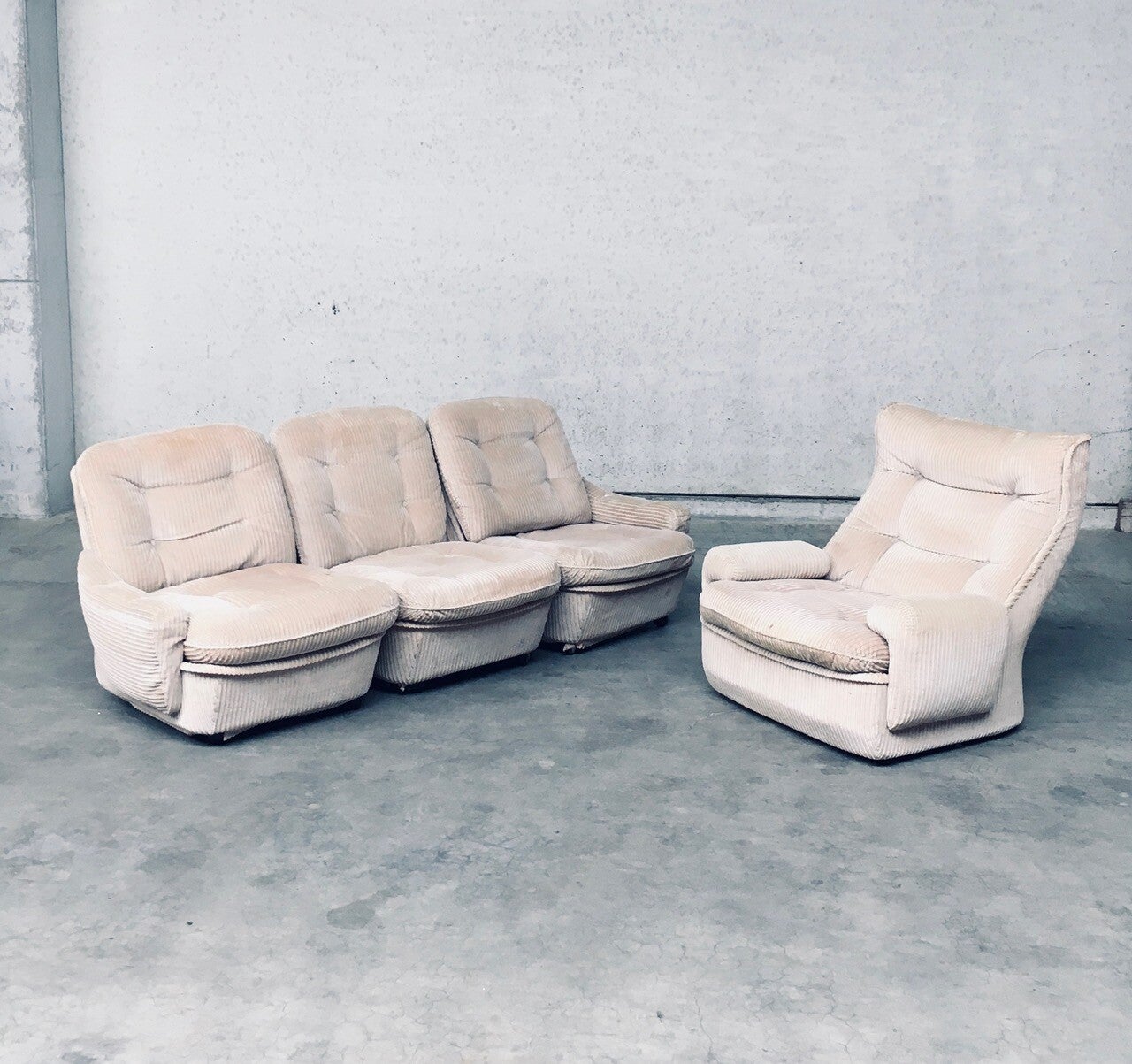 Vintage Midcentury Modern French Design "ORCHID" Modular Sofa & Armchair set by Michel Cadestin for Airborne. Made in France, 1970's period. Sectional sofa with 3 seperate seats that are held together with metal clamps (included) and 1 high back arm chair / lounge chair. Model Orchidée. These are all in their original beige velour fabric. All have the original Airborne label. Fiberglass frame on all chairs with caster wheels. The fabric on all seats is worn, has stains, some minor tears and is in very well used condition. The modular sofa measures 84cm x 220cm x 90cm in total. The lounge chair measures 89cm x 95cm x 90cm.