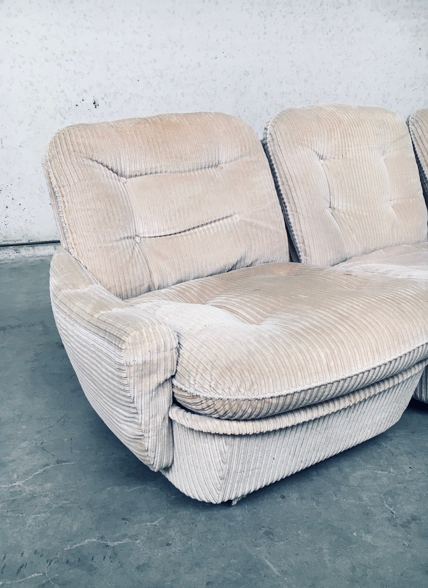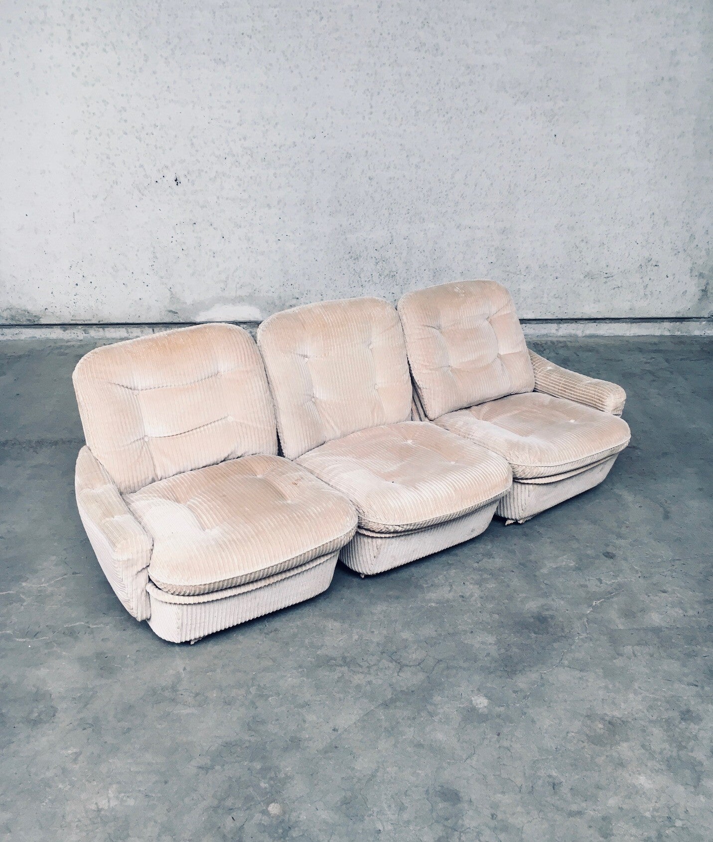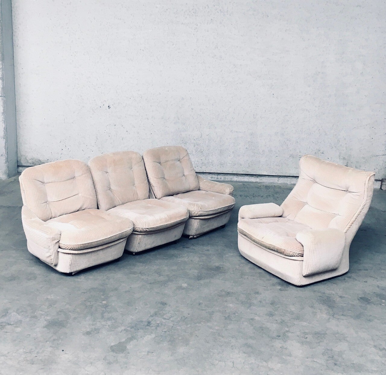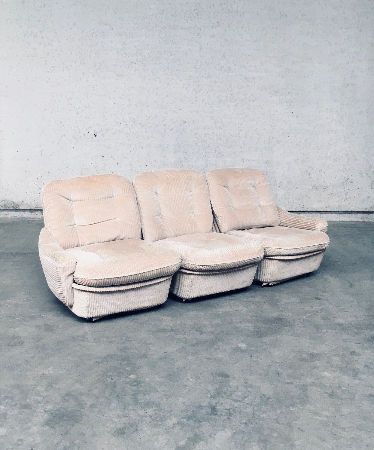 Vintage Midcentury Modern French Design "ORCHID" Modular Sofa & Armchair set by Michel Cadestin for Airborne. Made in France, 1970's period. Sectional sofa with 3 seperate seats that are held together with metal clamps (included) and 1 high back arm chair / lounge chair. Model Orchidée. These are all in their original beige velour fabric. All have the original Airborne label. Fiberglass frame on all chairs with caster wheels. The fabric on all seats is worn, has stains, some minor tears and is in very well used condition. The modular sofa measures 84cm x 220cm x 90cm in total. The lounge chair measures 89cm x 95cm x 90cm.