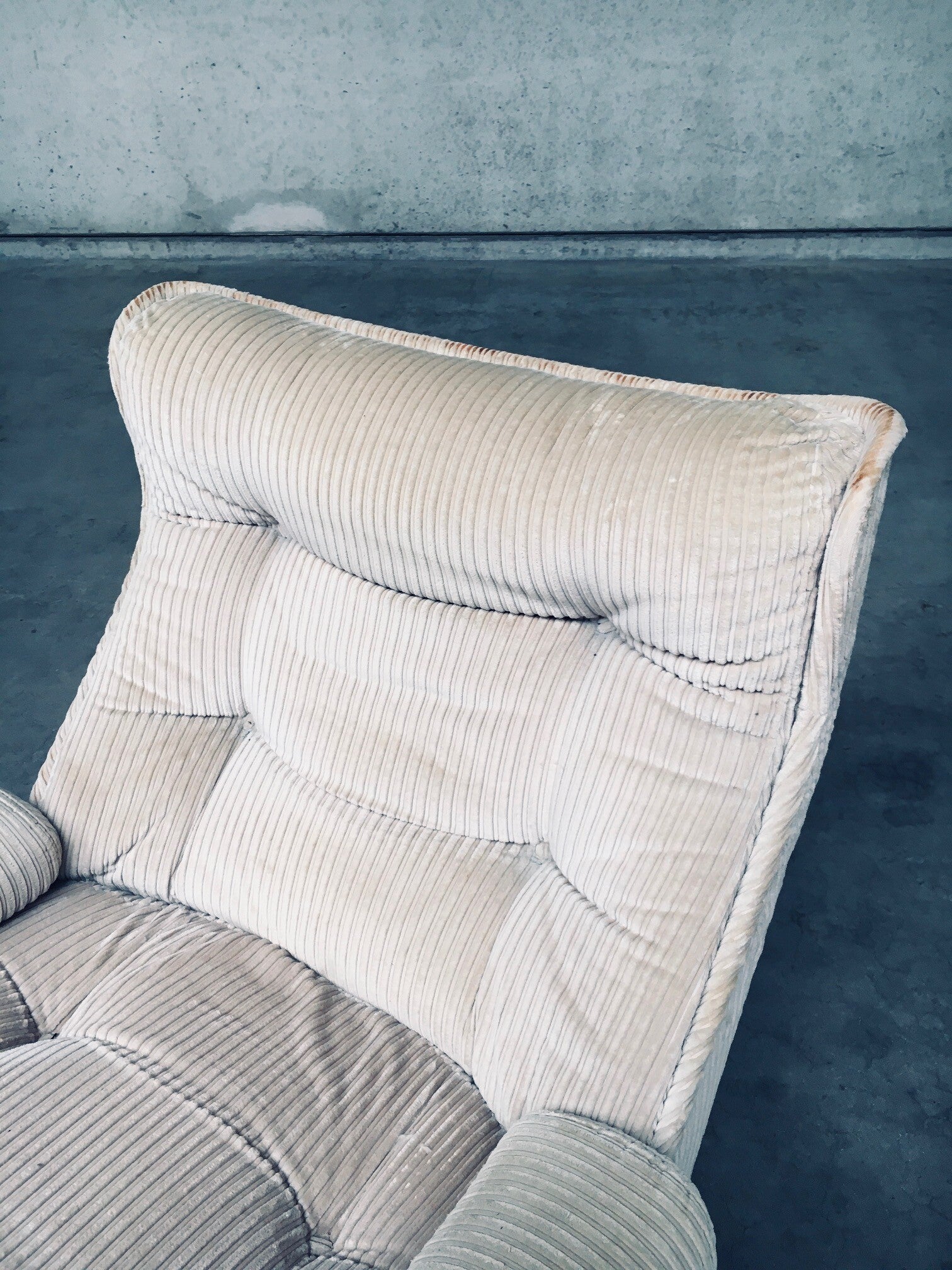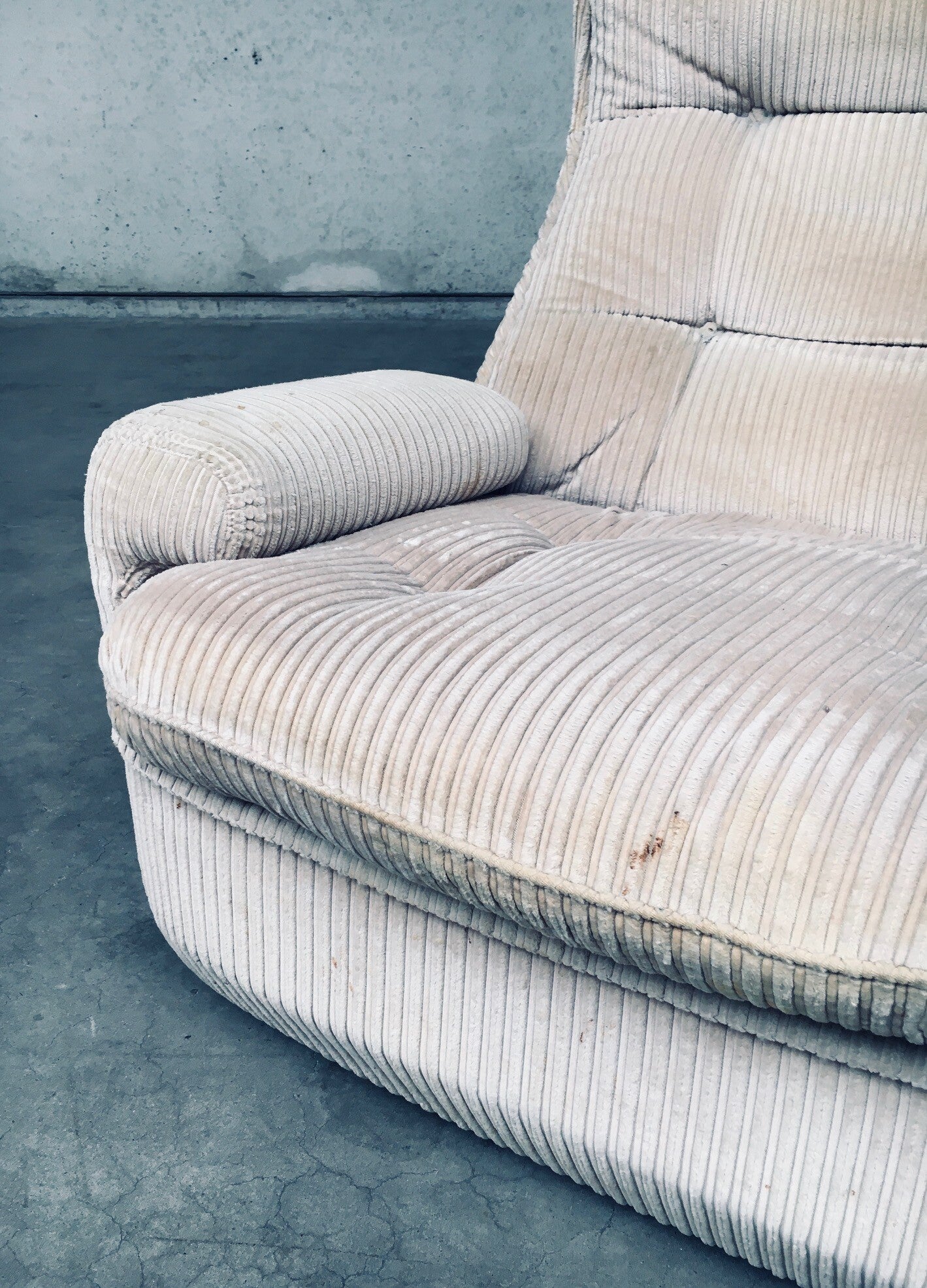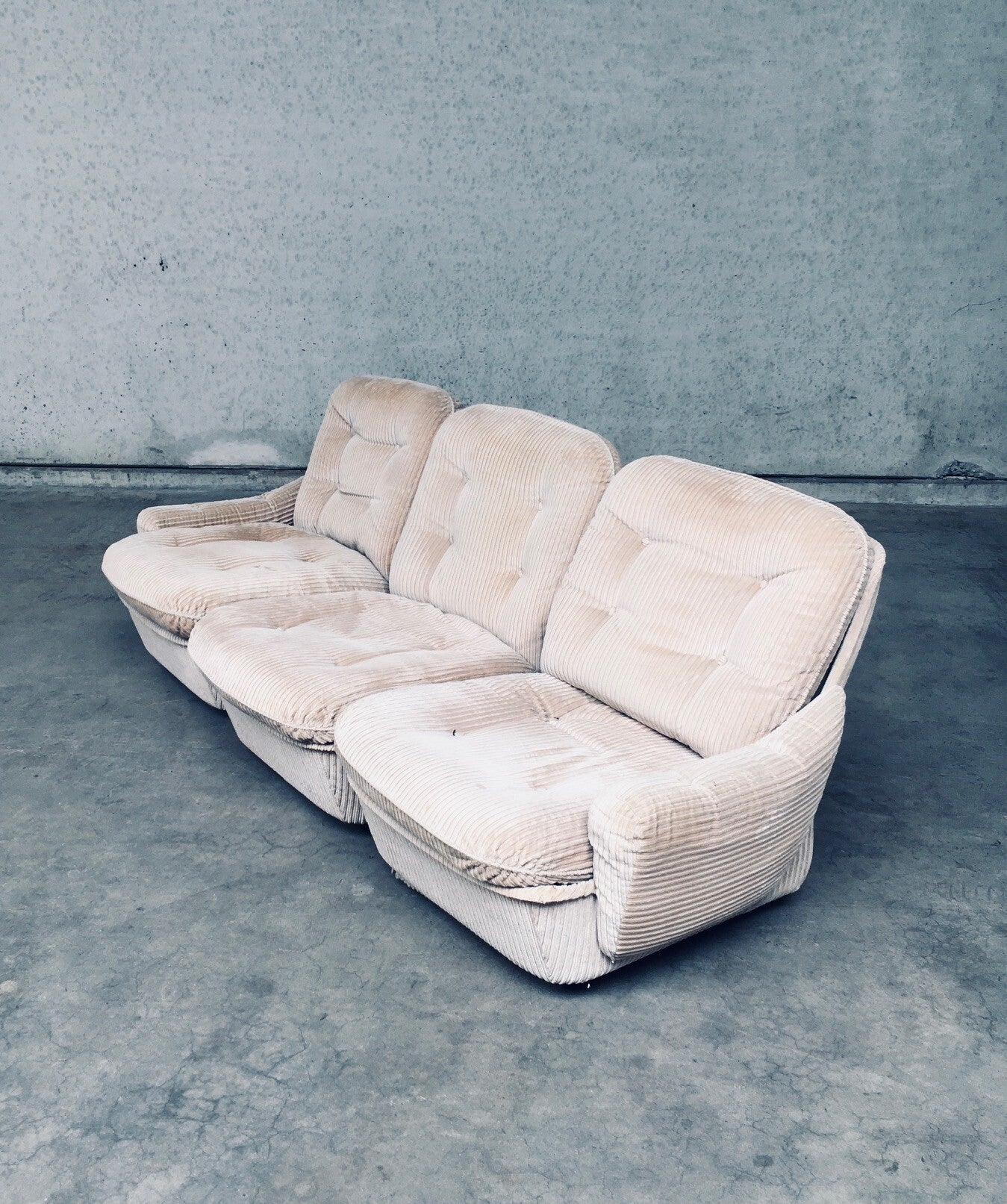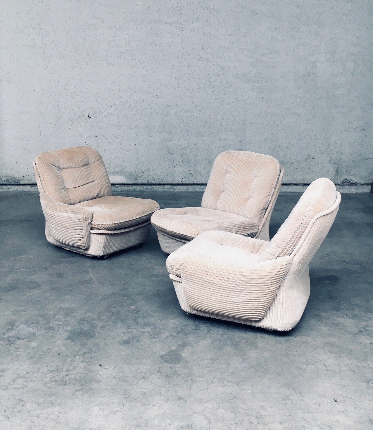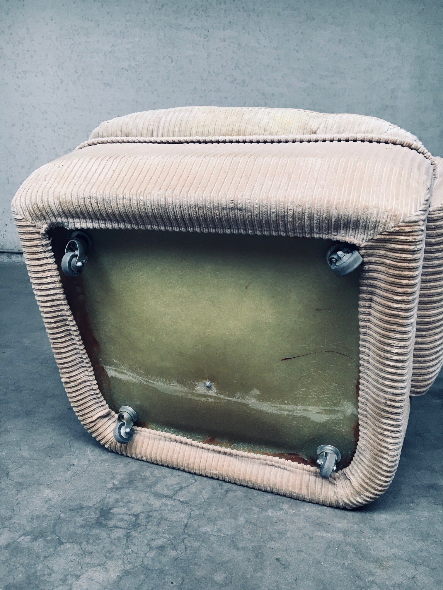Vintage Midcentury Modern French Design "ORCHID" Modular Sofa & Armchair set by Michel Cadestin for Airborne. Made in France, 1970's period. Sectional sofa with 3 seperate seats that are held together with metal clamps (included) and 1 high back arm chair / lounge chair. Model Orchidée. These are all in their original beige velour fabric. All have the original Airborne label. Fiberglass frame on all chairs with caster wheels. The fabric on all seats is worn, has stains, some minor tears and is in very well used condition. The modular sofa measures 84cm x 220cm x 90cm in total. The lounge chair measures 89cm x 95cm x 90cm.