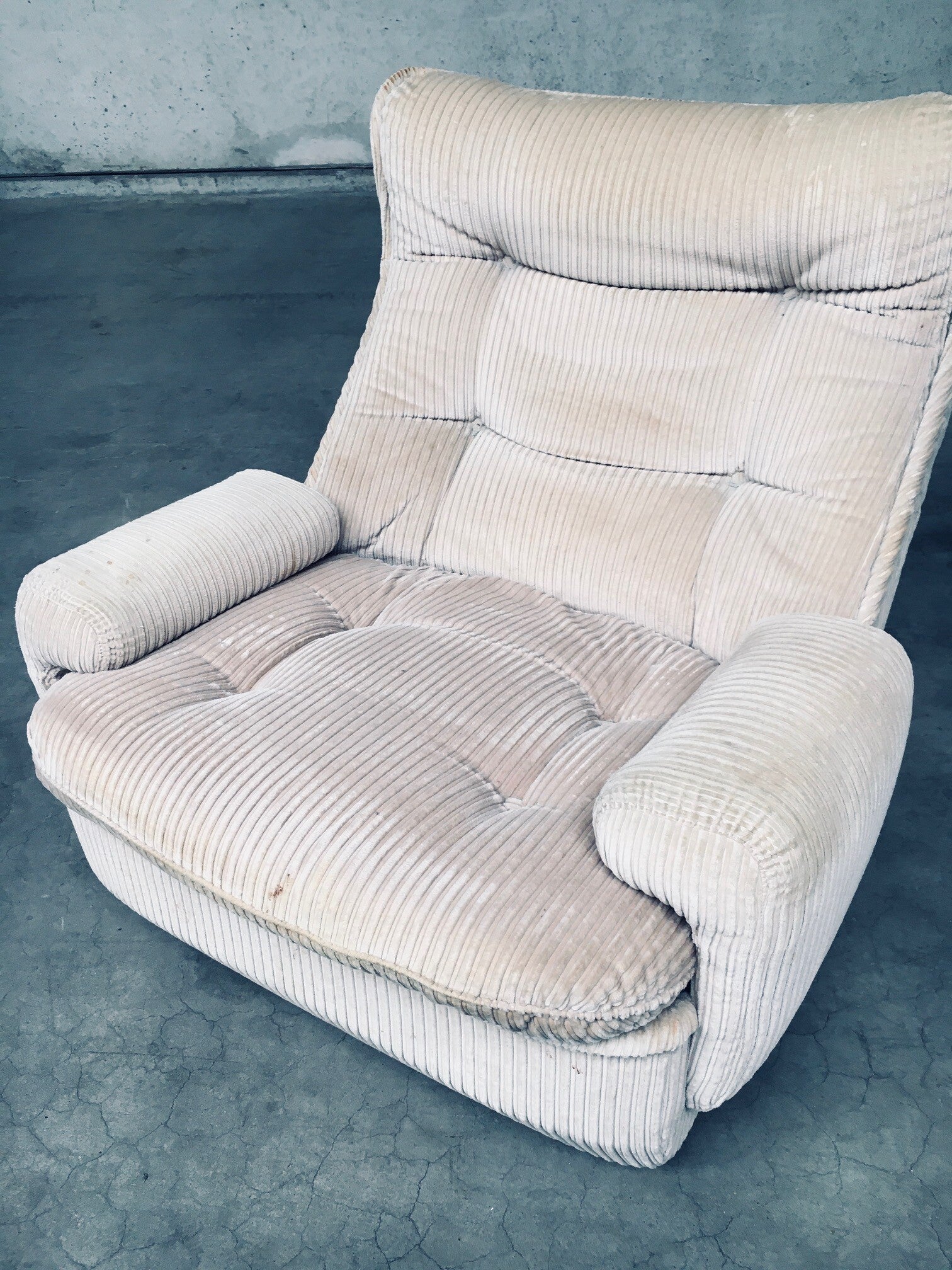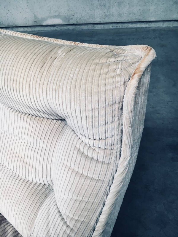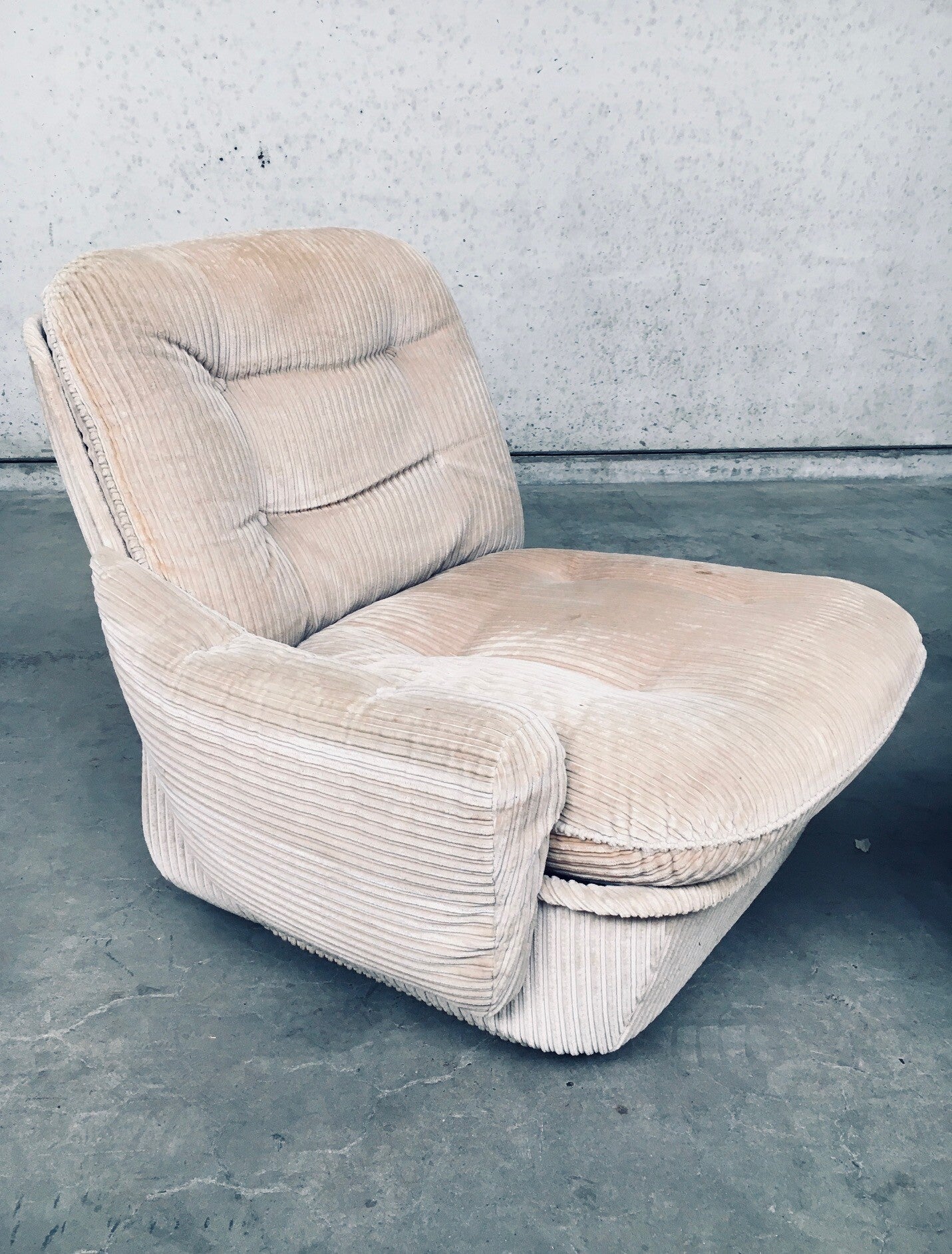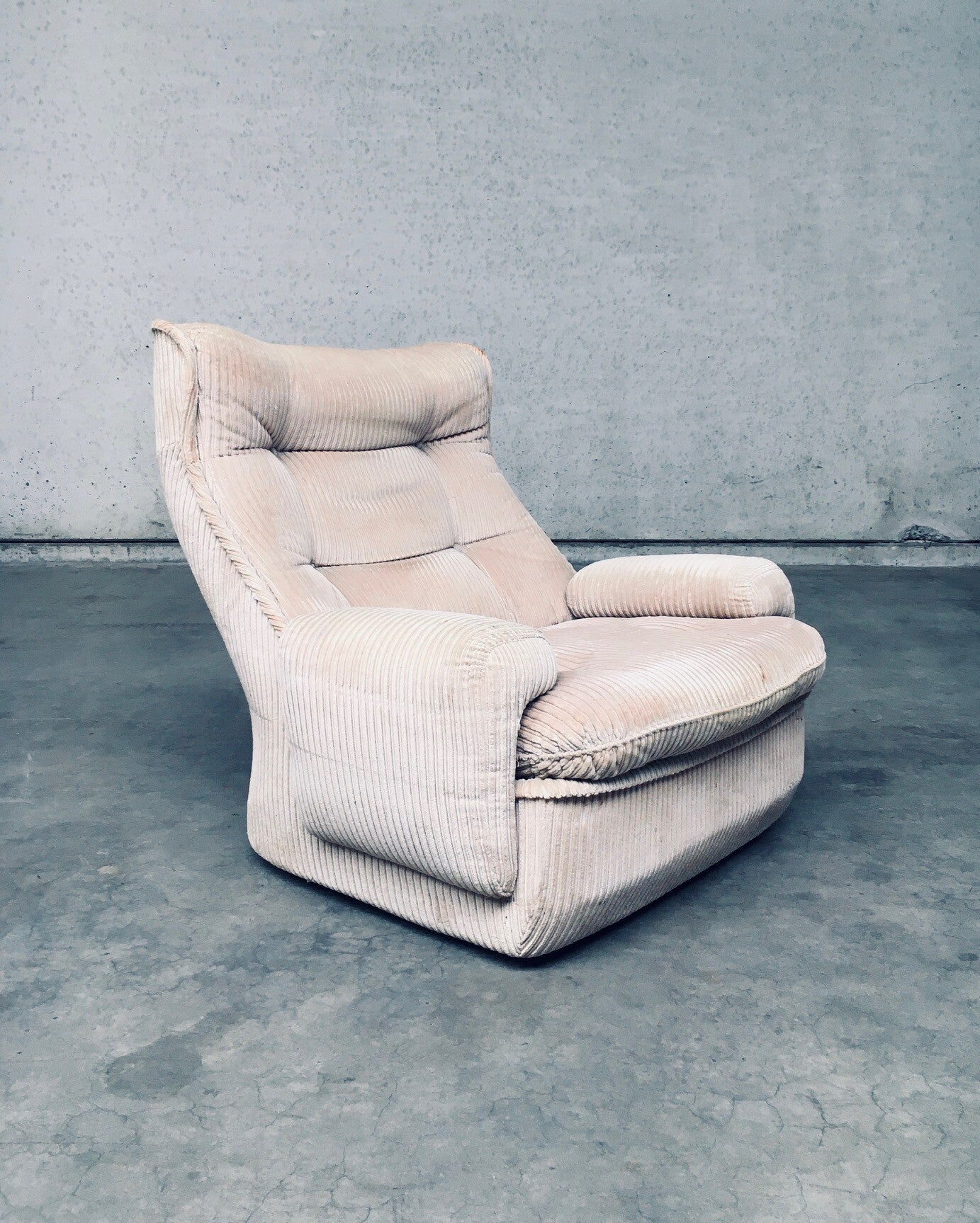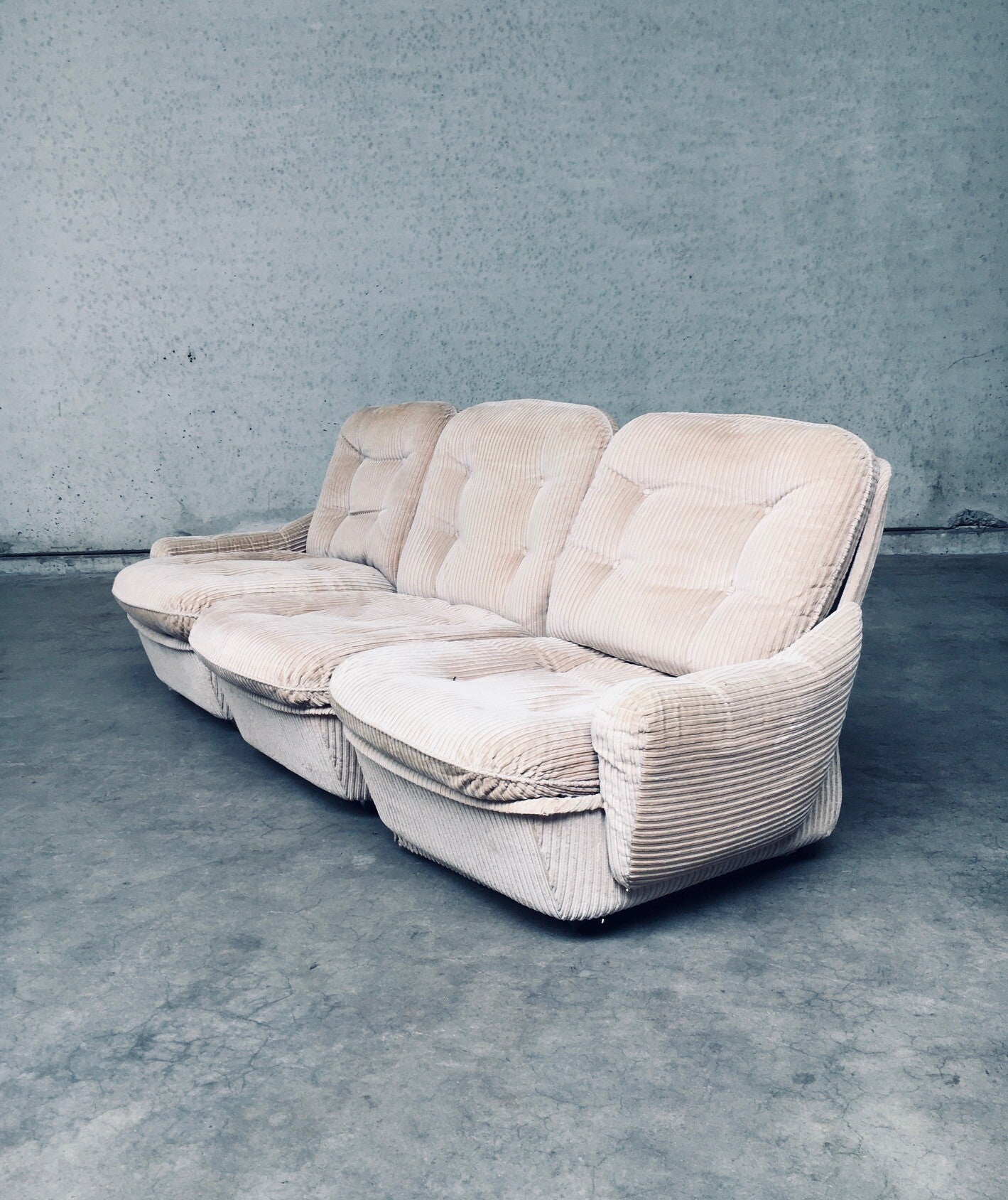 Vintage Midcentury Modern French Design "ORCHID" Modular Sofa & Armchair set by Michel Cadestin for Airborne. Made in France, 1970's period. Sectional sofa with 3 seperate seats that are held together with metal clamps (included) and 1 high back arm chair / lounge chair. Model Orchidée. These are all in their original beige velour fabric. All have the original Airborne label. Fiberglass frame on all chairs with caster wheels. The fabric on all seats is worn, has stains, some minor tears and is in very well used condition. The modular sofa measures 84cm x 220cm x 90cm in total. The lounge chair measures 89cm x 95cm x 90cm.