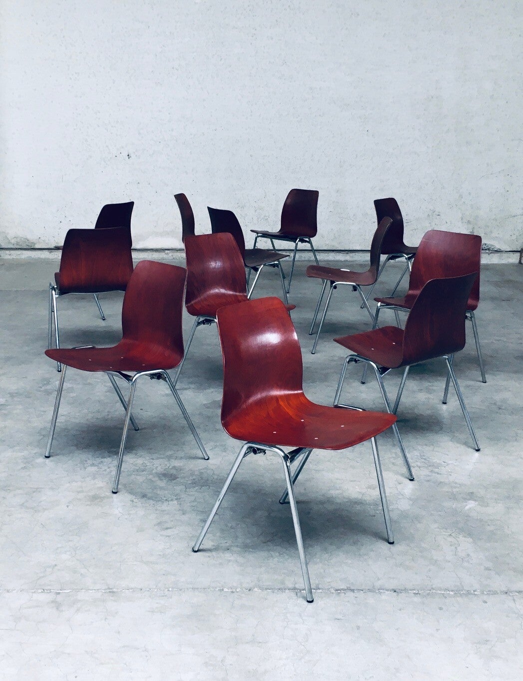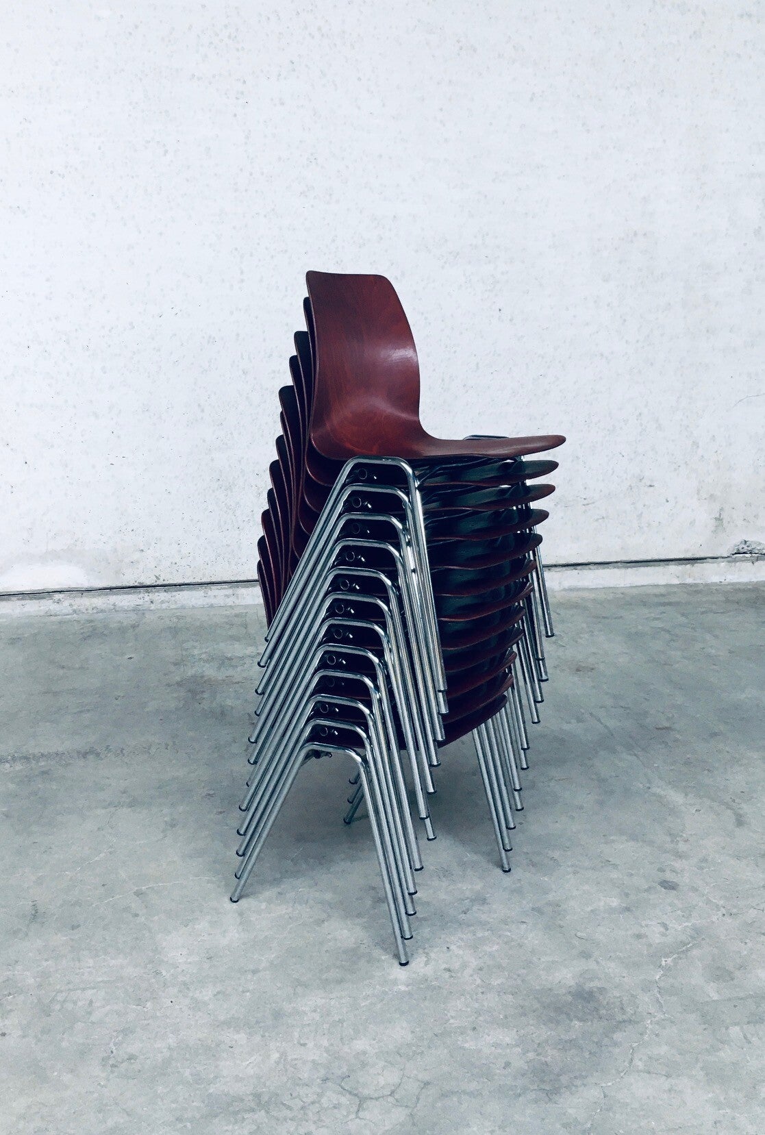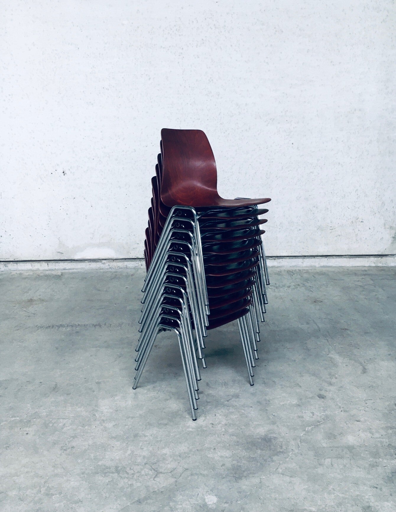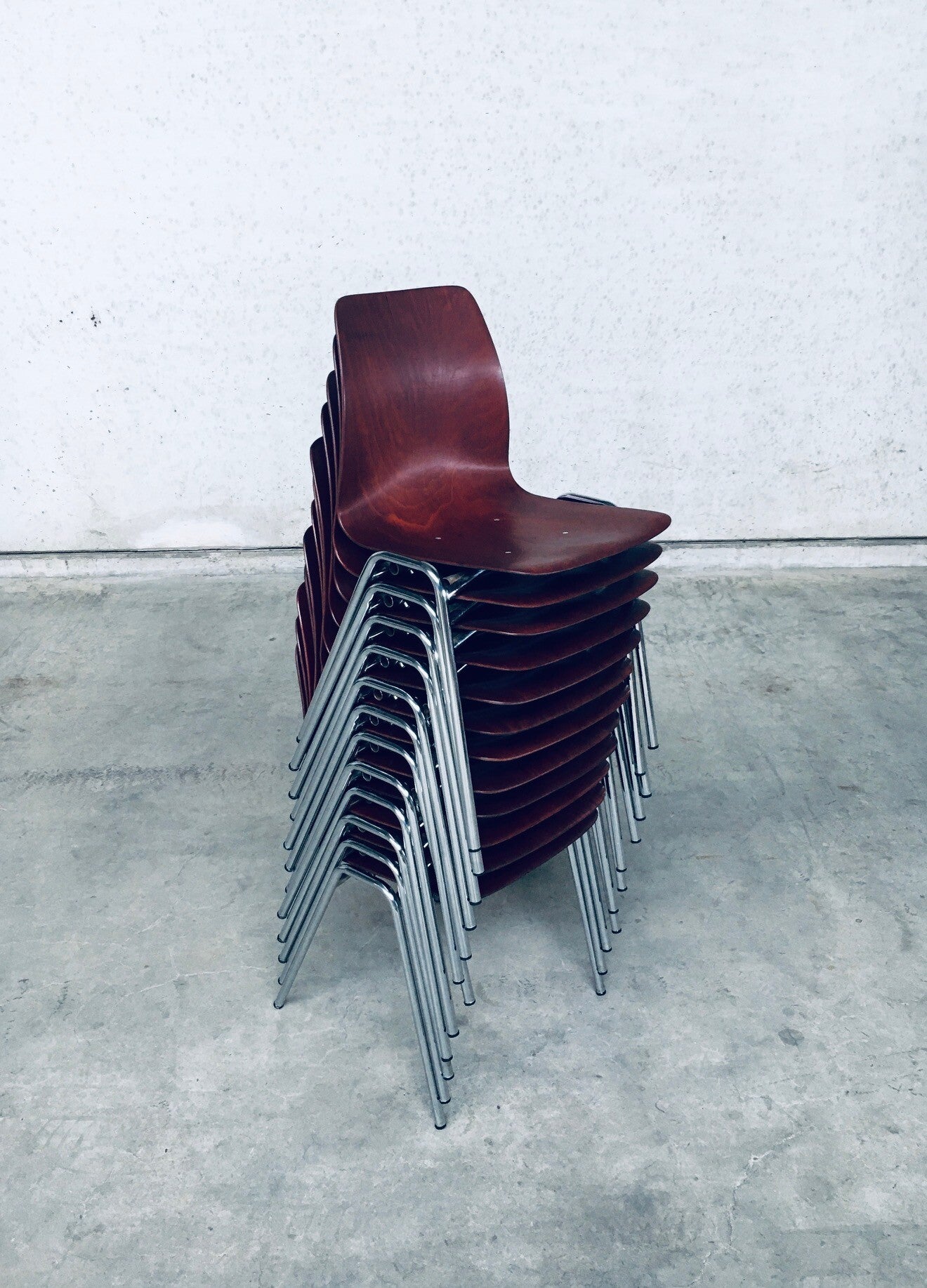 Vintage Midcentury Modern German Design Stacking Chairs by Elmar Flötotto for Pagholz. Made in Germany, 1960's / 70's period. Set of 12 chairs which can be stacked in one stack. Pagwood / Molded Plywood on chromed steel frame. They all have new feet inner covers. All come in good condition. With normakl wear for their age and use. Each chair measures 77,5cm x 47cm x 49cm. Seat height: 46cm.