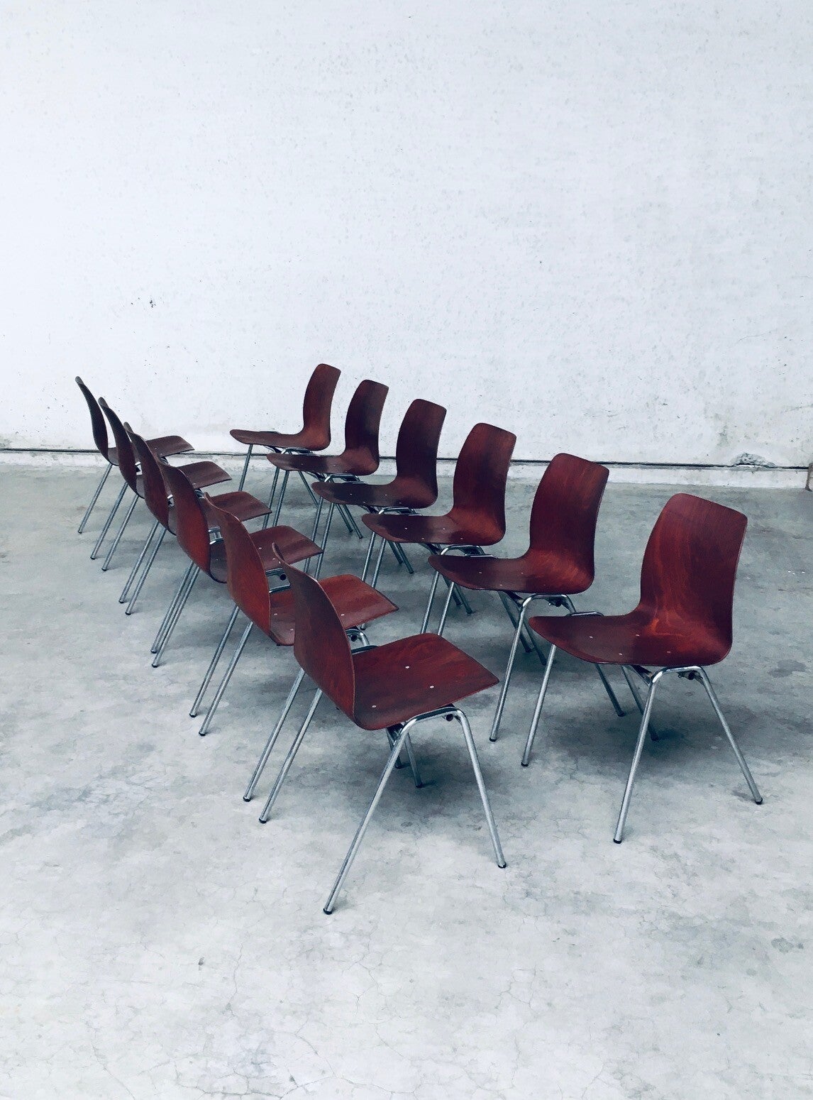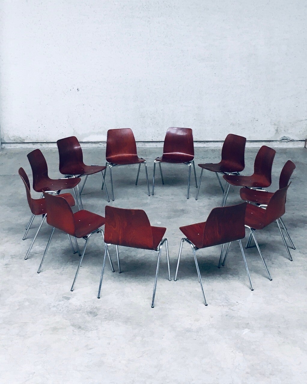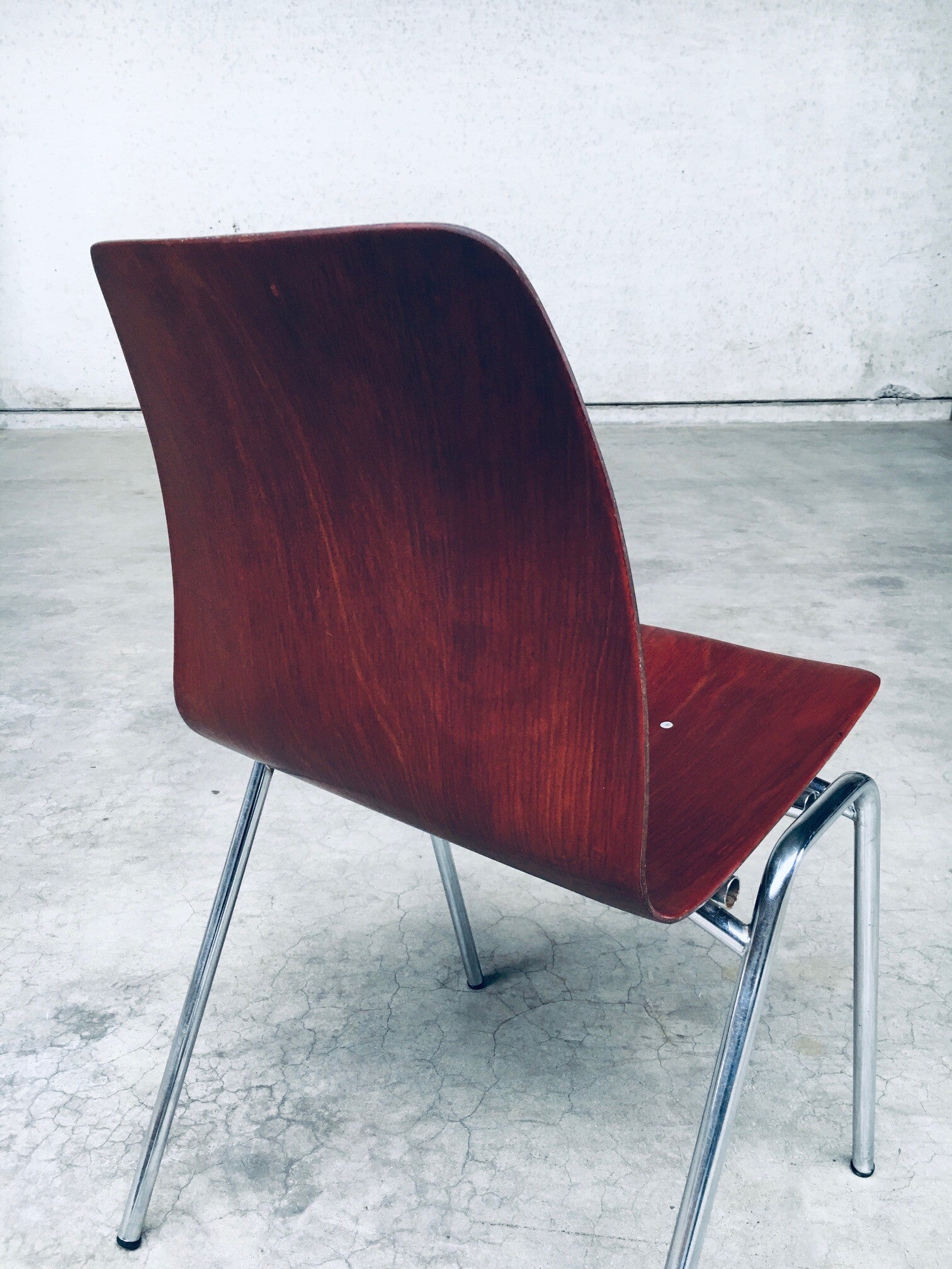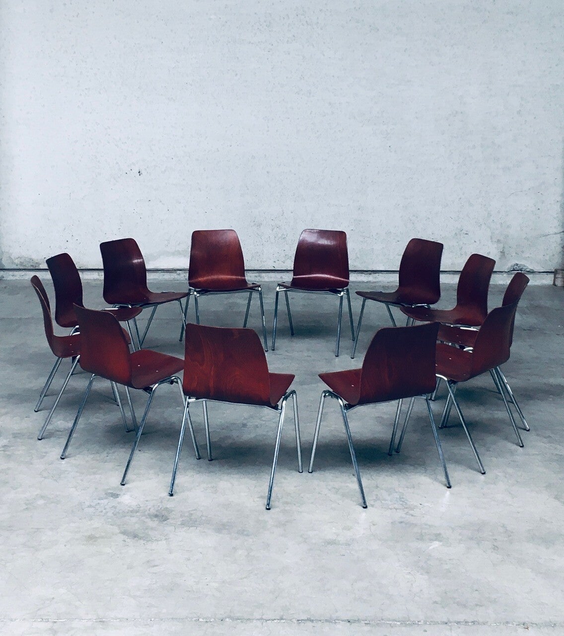 Vintage Midcentury Modern German Design Stacking Chairs by Elmar Flötotto for Pagholz. Made in Germany, 1960's / 70's period. Set of 12 chairs which can be stacked in one stack. Pagwood / Molded Plywood on chromed steel frame. They all have new feet inner covers. All come in good condition. With normakl wear for their age and use. Each chair measures 77,5cm x 47cm x 49cm. Seat height: 46cm.