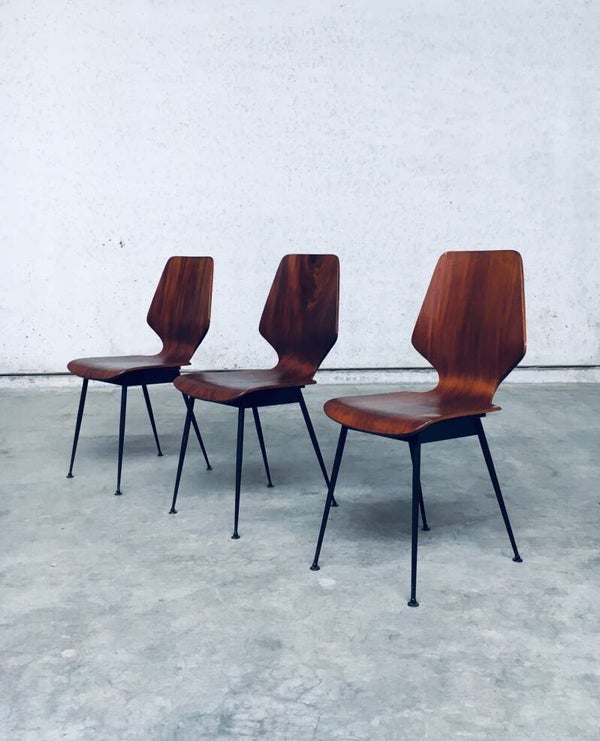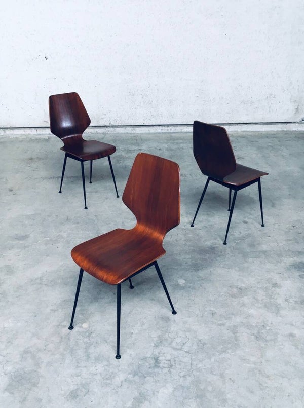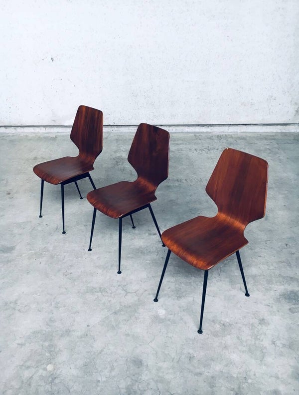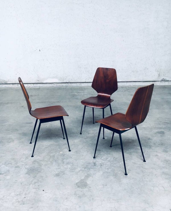 Vintage Midcentury Modern Italian Design Plywood Side Chairs attributed to Carlo Ratti for Legni Curvati. Made in Italy, 1950's period. Set of 3 chairs. Plywood veneer chairs in a pallisander look with black mat lacquered metal base on round movable feet. These have been slightly refinished on the wood veneer. The plywood seats are in good condition, but the bendwood has lost it's tension for about 50%. They are now very flexible and missing sturdyness for everyday use. Useable as sidechairs as they have a great design and look. One chair has a small break in one of it's front legs, does not affect it's sturdyness for sitting on it. Each chair measures 88cm x 39cm x 50cm.