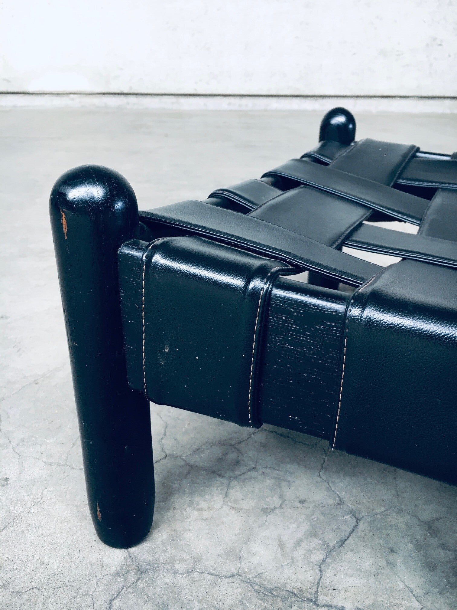 Brazilian Style Brutalist Design Black Stained Wood & Black Leather Straps Low Hocker / Ottoman. Made in Belgium in the 1970's. Black stained wood frame with thick leather crossed straps. Add your cushion to complete the look you want. This comes in very good condition, with minor signs of it's age and use. Measures 28cm x 55cm x 55cm.