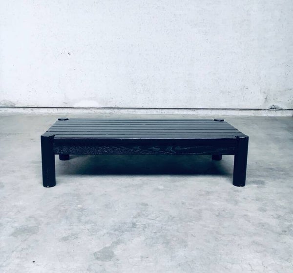 Brutalist Dutch Design Black Stained Oak Coffee Table. Made in the Netherlands, 1960's / 70's period. Heavy and solid coffee table in black stained oak. 4 pilar legs with thick planks as top. Robust in design and production. This comes in good condition with minor signs showing it's age and use. Measures 40,5cm x 160cm x 80cm.