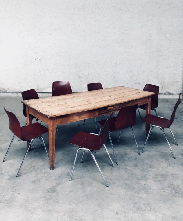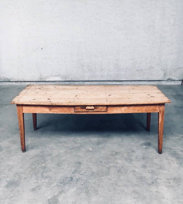 French Country Design Pine Dining Table with a single drawer. Made in France, 1930's / 40's period. Solid pine constructed table with a single drawer that has almost the same lenght as the width of the table. Well used table which shows in it's surface. Paled top with lot's of holes by woodworm (inactive) all over the table top and legs. A very nice patina all over the table. It also has bended in the middle from it's age and use which gives it a lot of character. This is still very sturdy and good to use anywhere. Measures 74,5cm x 197cm x 80cm.