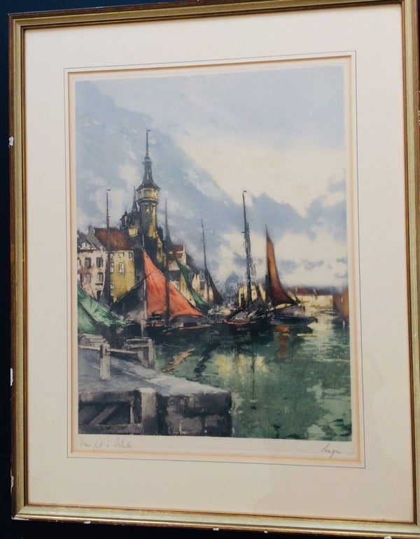 Original Color Etching Art Print by F.J. Luigini 'Vieux Port à Ostende' Early 1900's