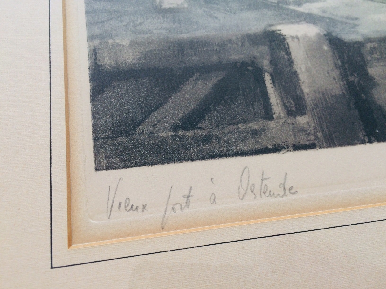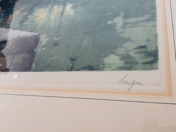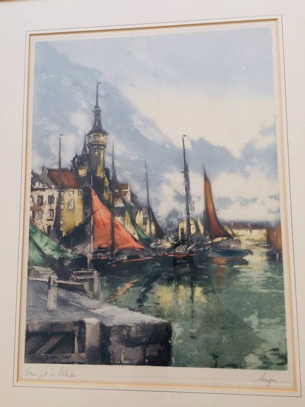 An original Color Etching Art print by F.J. Luigini; Vieux Port à Ostende. Made by Ferdinand Jean Luigini (1870 - 1943) in the early 1900's. Signed by artist. Artist is born 5th of mai 1870 in France. Painter and etching maker of landscapes & portrets in Paris. Exposititions in Salon des Artistes Francais & Nationale des Beaux-Arts in London. He has won several Art prizes. Framed under glass, frame has some chips on border. In very good condition. Frame size: 76,5cm x 60cm.