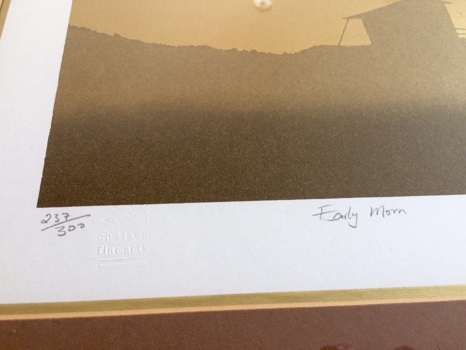 Original Art Lithograph print "Early Morn" by Cleave Cunningham. Signed and numbered by artist, 237/300. Stamped by Chelsea FineArts. Framed under glass in metal frame. In very good condition. Frame size: 44cm x 55cm.