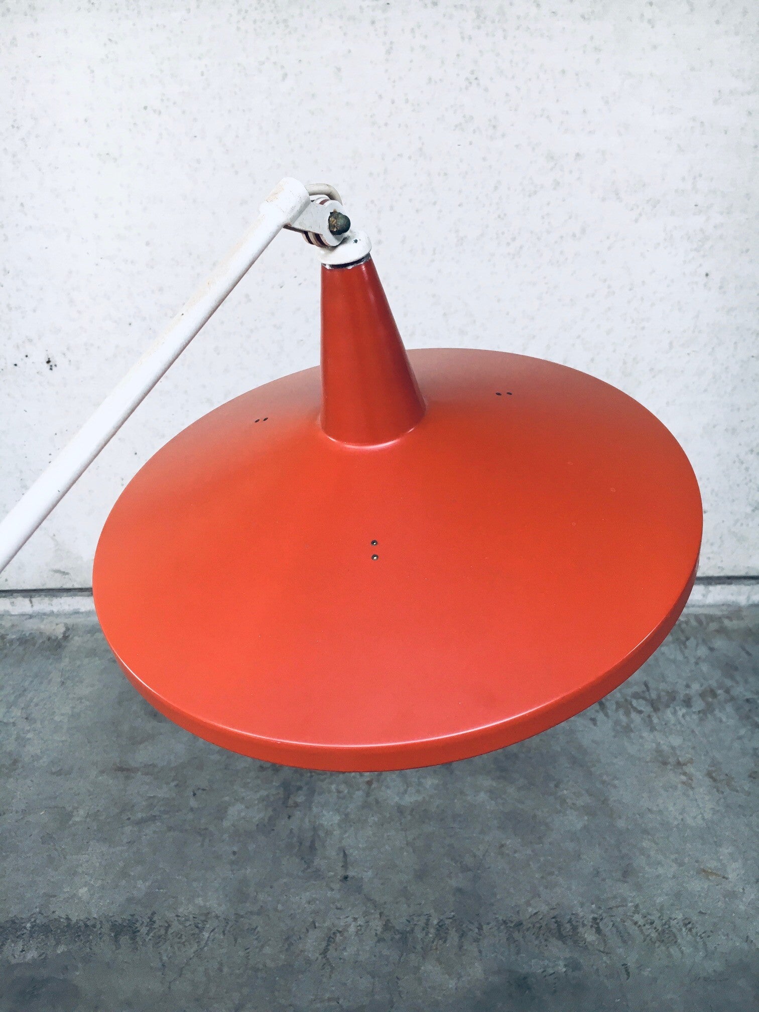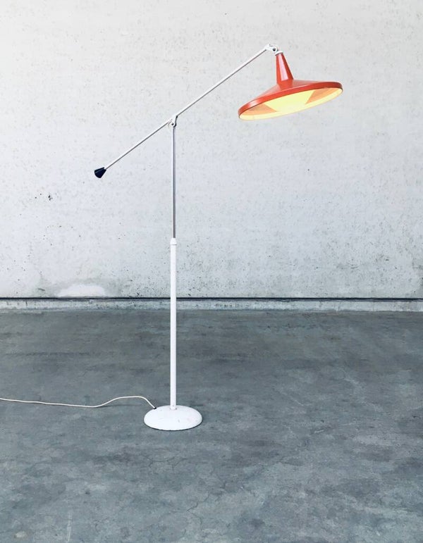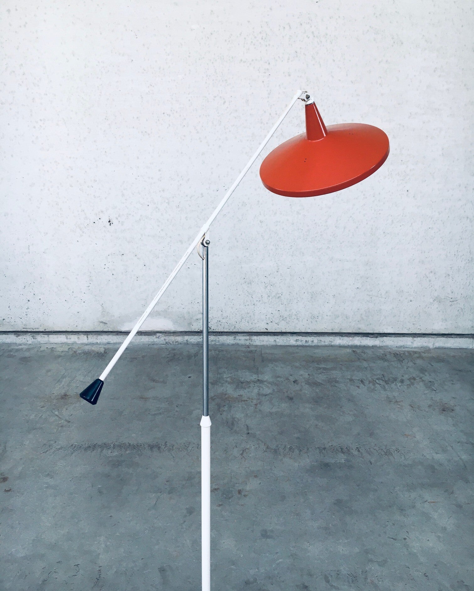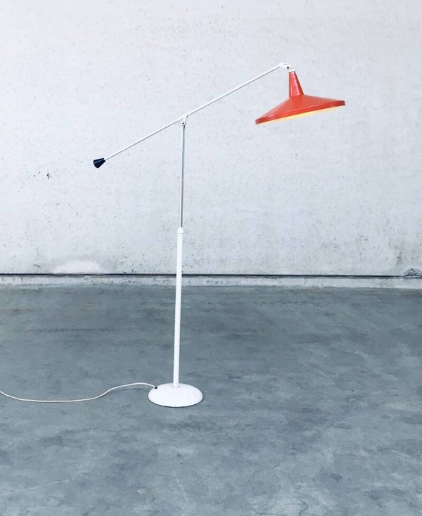 Vintage Midcentury Modern Dutch Design "PANAMA" Model 6350 Floor Lamp in red designed by Wim Rietveld for Gispen. Made in the Netherlands, 1957. Cream white coated base and adjusting rod with red shade. The lamp can be adjusted in height by tilting the rod with original rubber handle. This lamp is all original, including it's original plastic difuser. Comes in very good condition with wear from it's age and use. Measures (in normal position, pic. 1) 165cm x 120cm x 40cm.