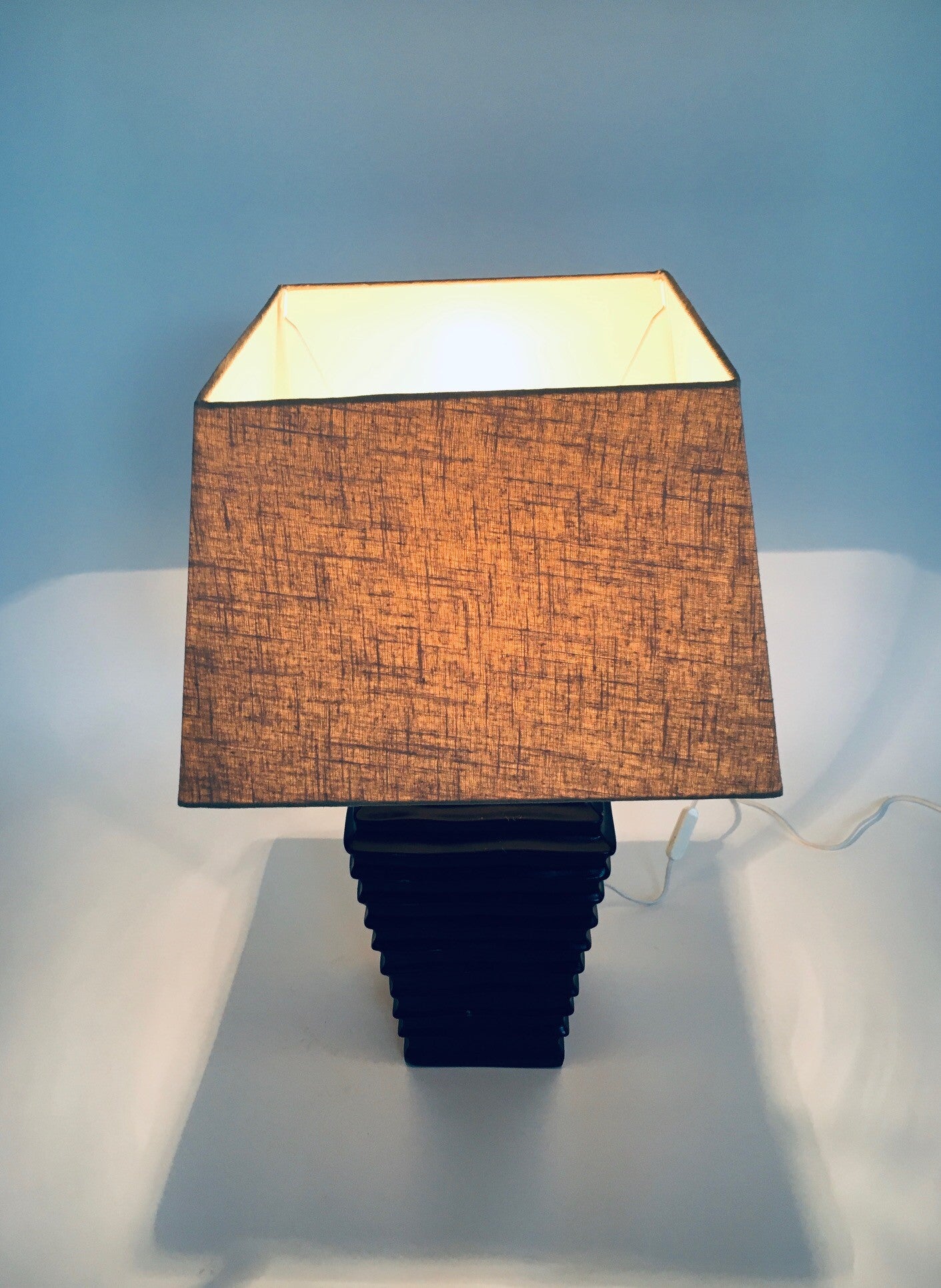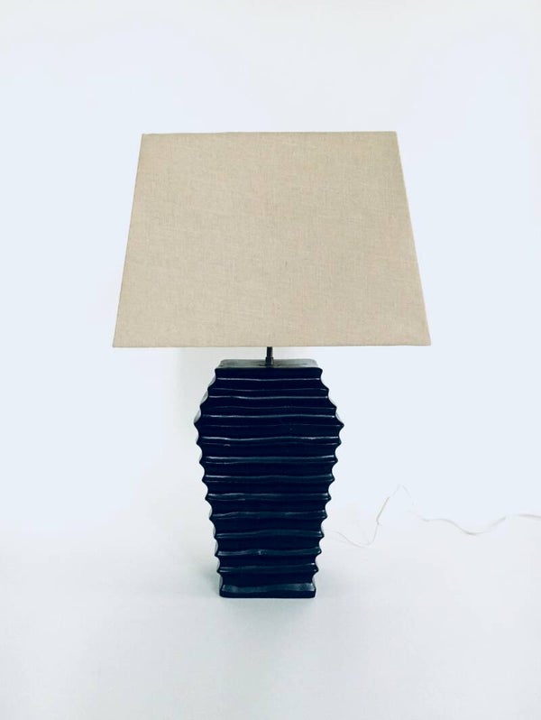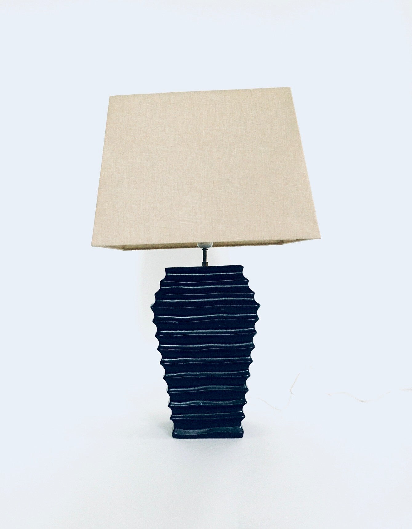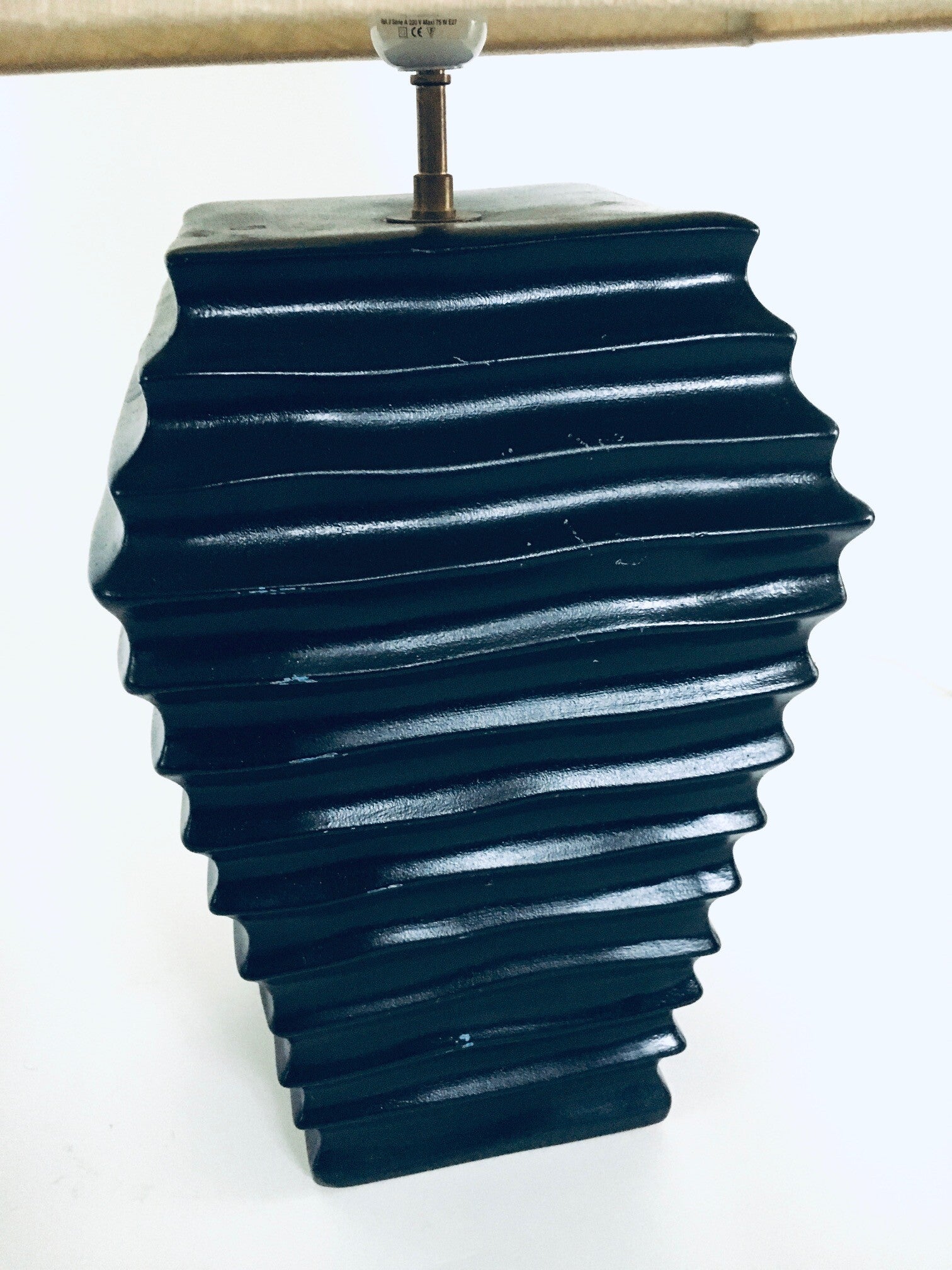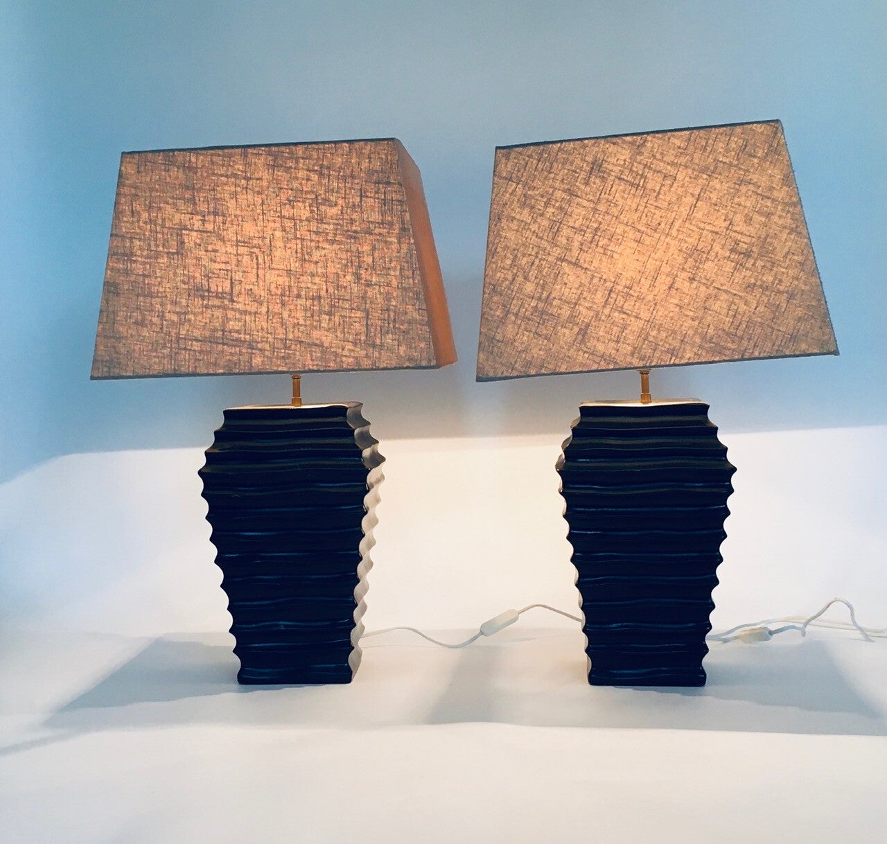 Vintage Design Ceramic Table Lamp set. Made in Spain, 1970's period. Black painted white clay molded lamp base with brass trims and newer shades. These come in very good condition, with minor wear to the base and shades. Each lamp measures: 45cm x 21,5cm x 21,5cm - including the lamp shade: 66cm x 40cm x 40cm.