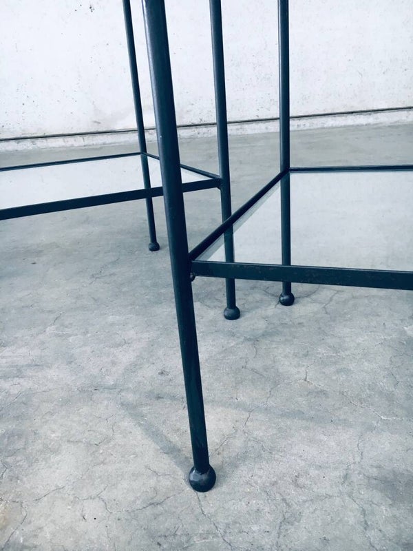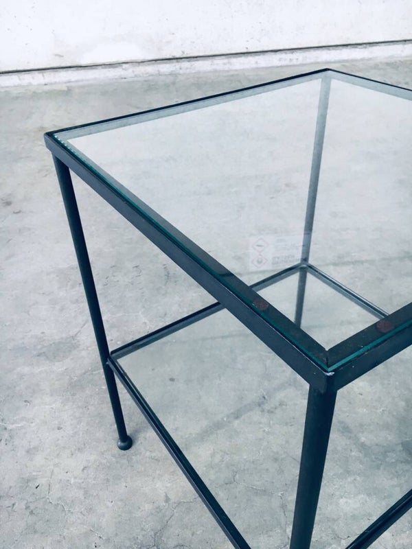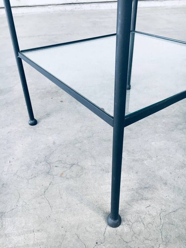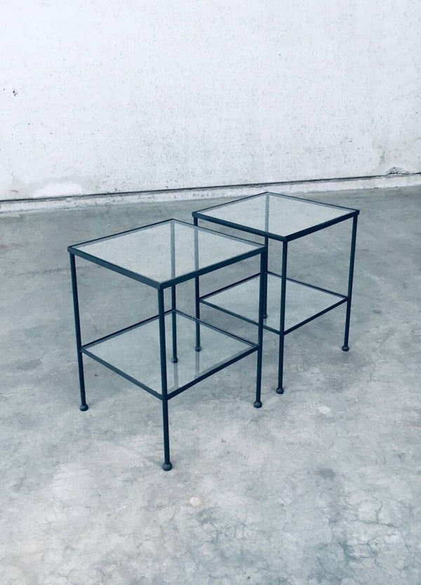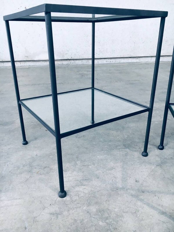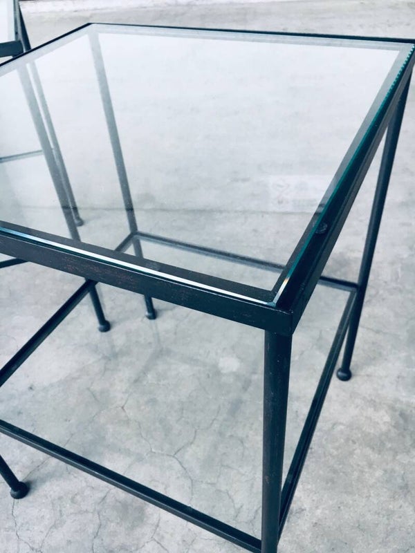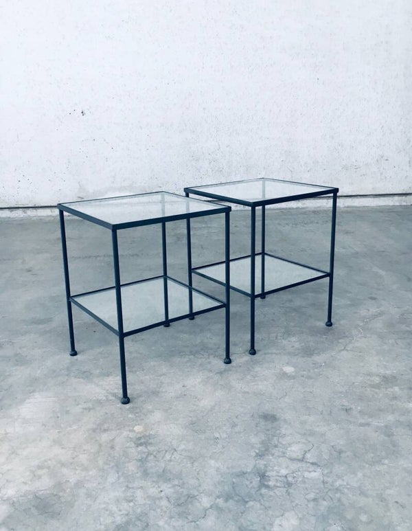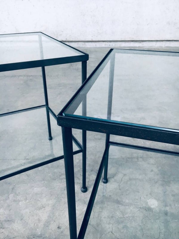 Minimalist Design Two Tier Side Table Set / 2. Made in Belgium, 1960's period. Side table, bedside table or sofa end table set. These are made in black lacquered steel with clear glass inlay and nice steel ball shaped feet. These have really nice proportions with an airy feel. Both come in very good condition. They are handmade and differ slightly. Each measures 66,5cm x 50cm x 50cm.