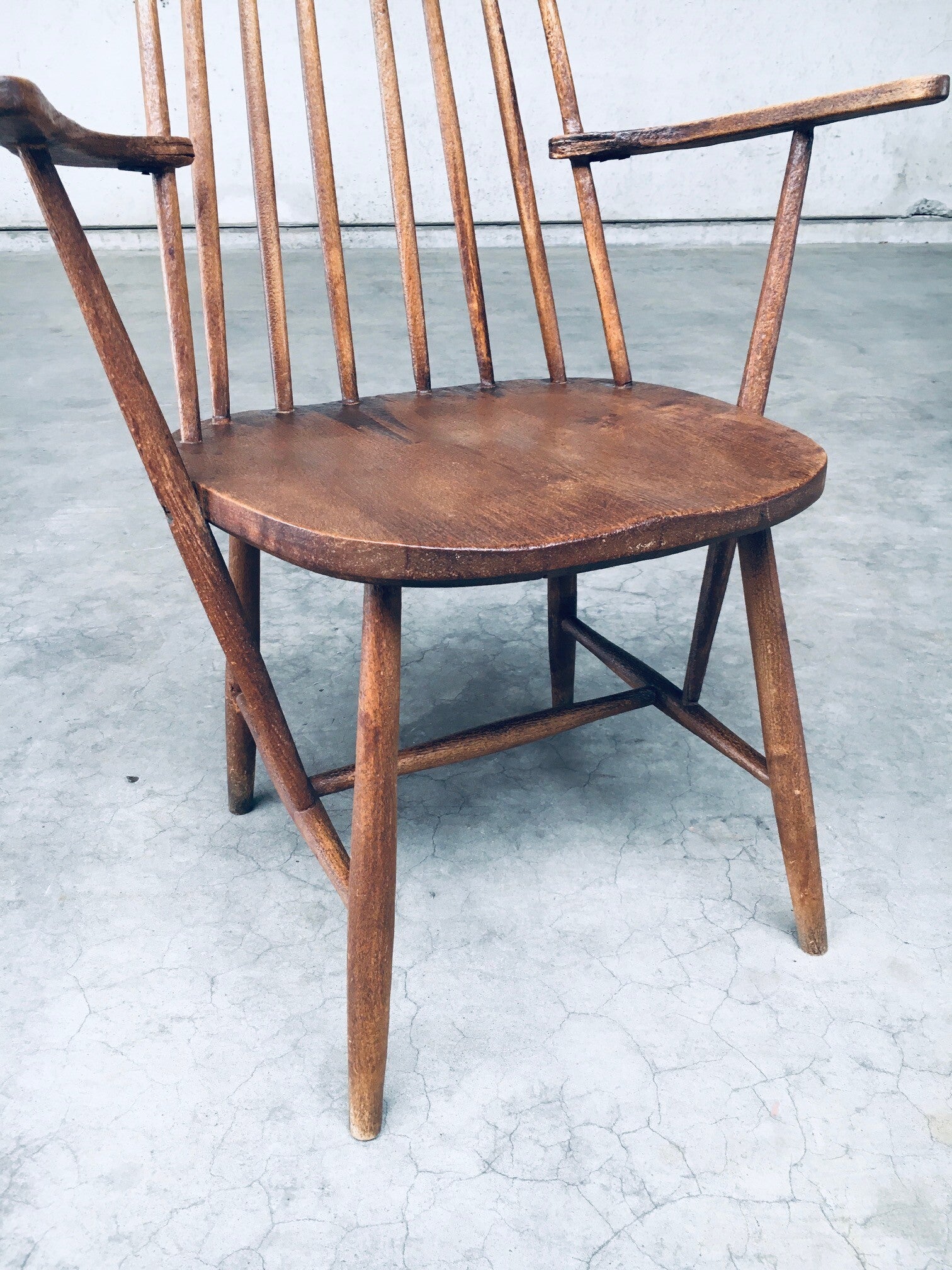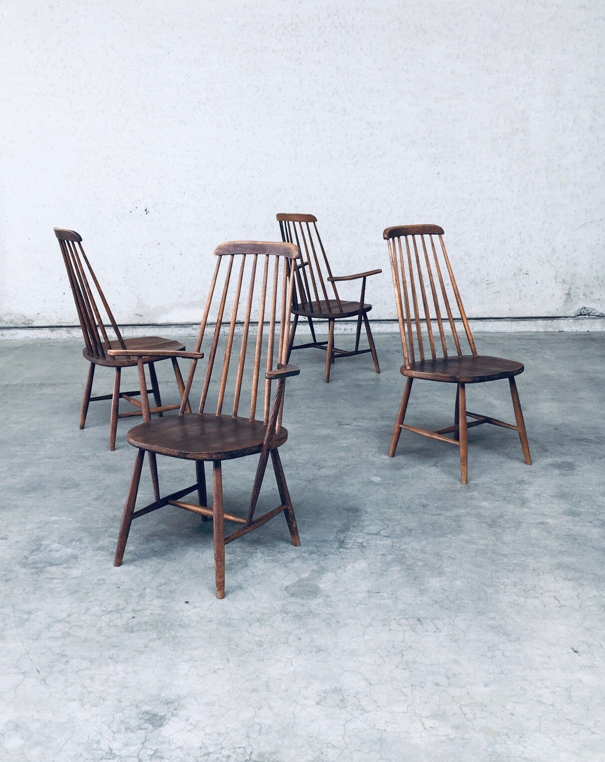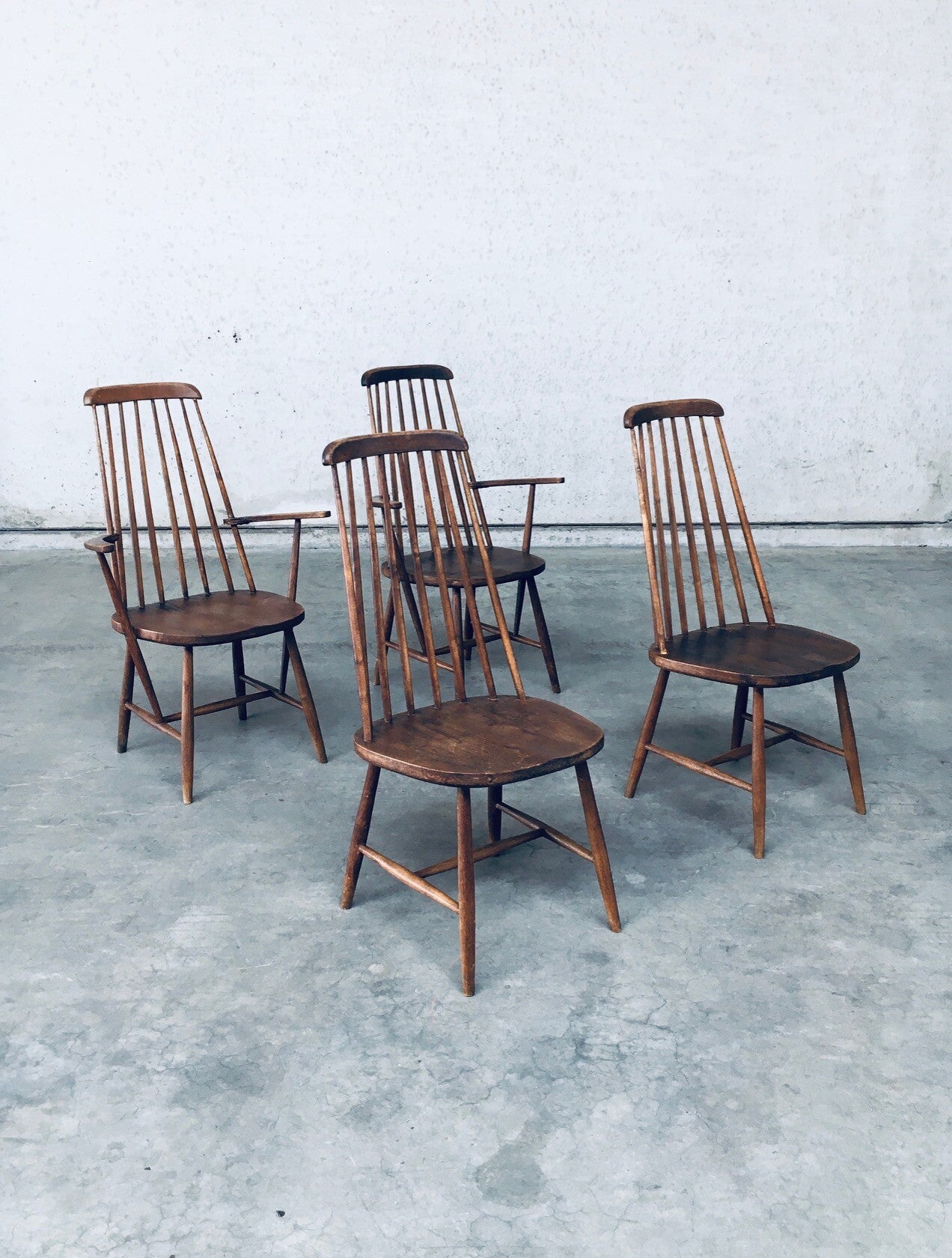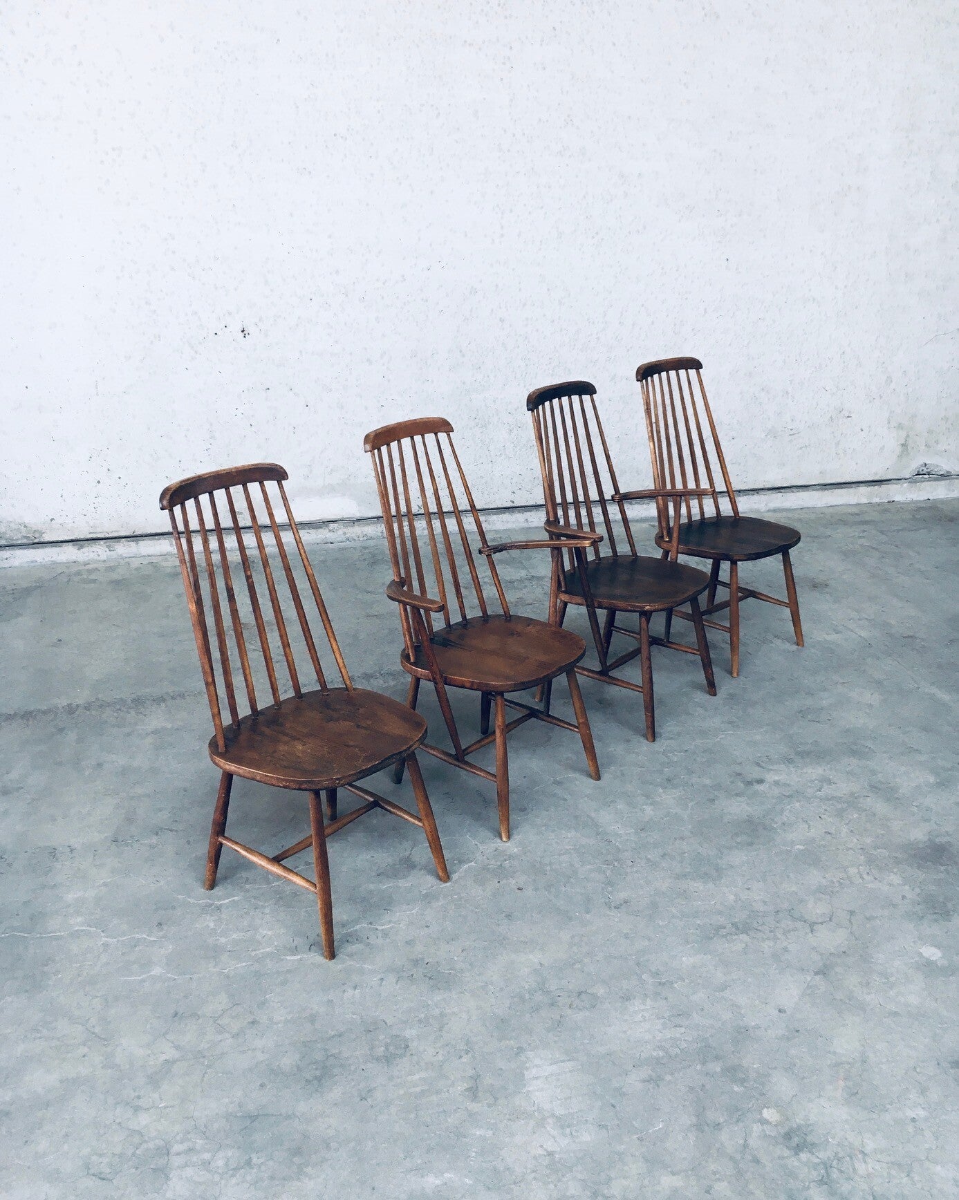 Vintage Midcentury Wabi Sabi Design Oak Spindle Back Chairs. Made in France, 1940's / 50's period. Oak constructed, handcarved chairs with visible oak structure and carving marks. There are 2 chairs with armrests and 2 without. They are all in good, original condition, with normal signs of wear from their use and age. The arm chairs measure 101cm x 68cm x 48cm. The regular chairs measure 101cm x 48cm x 48cm. Seat height is 44cm.