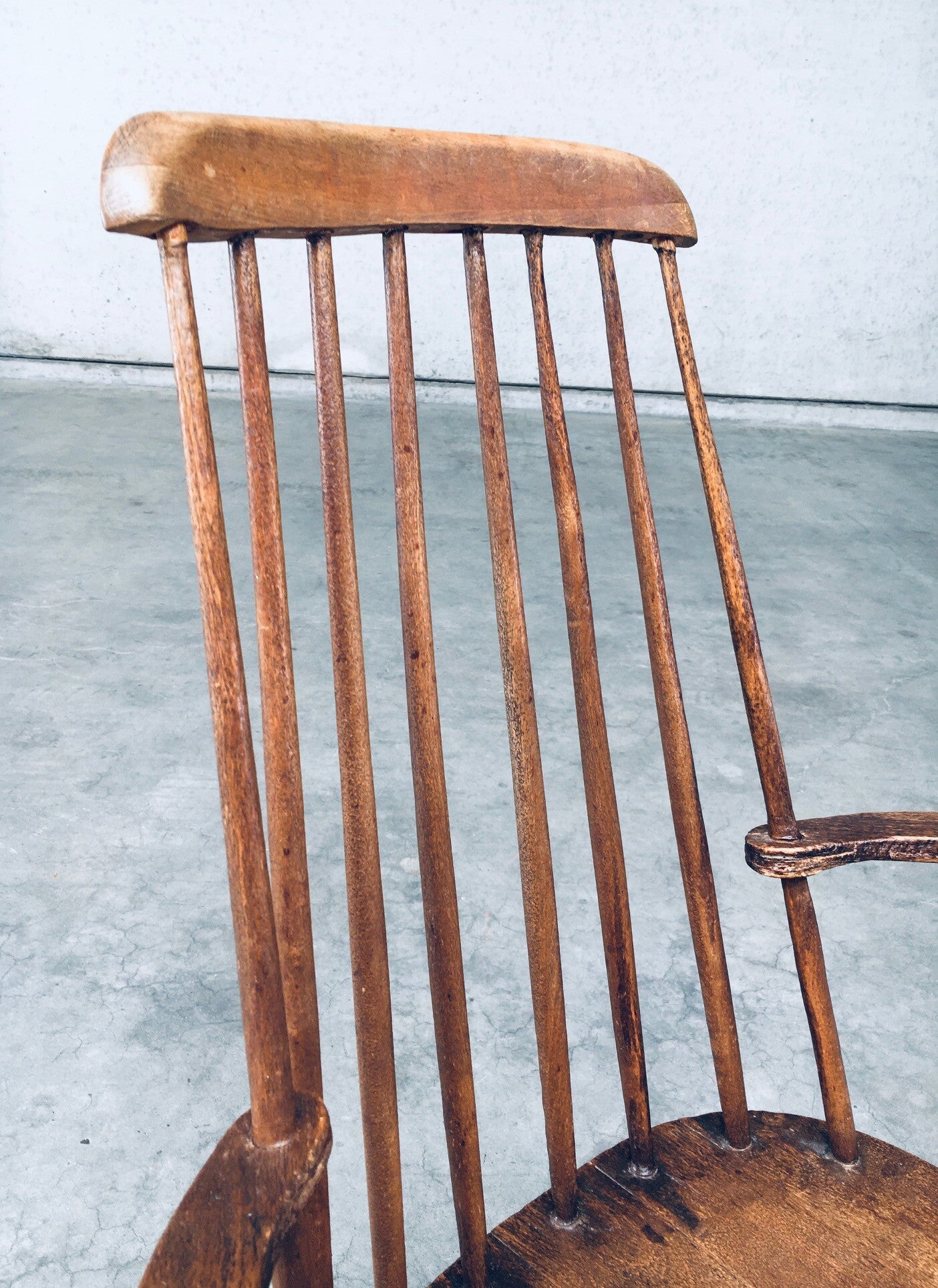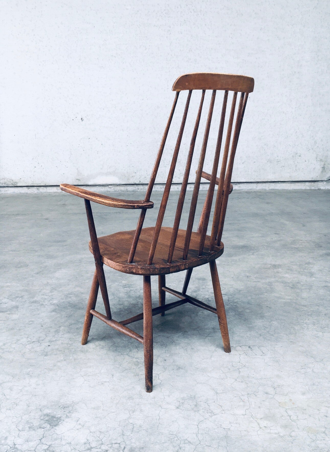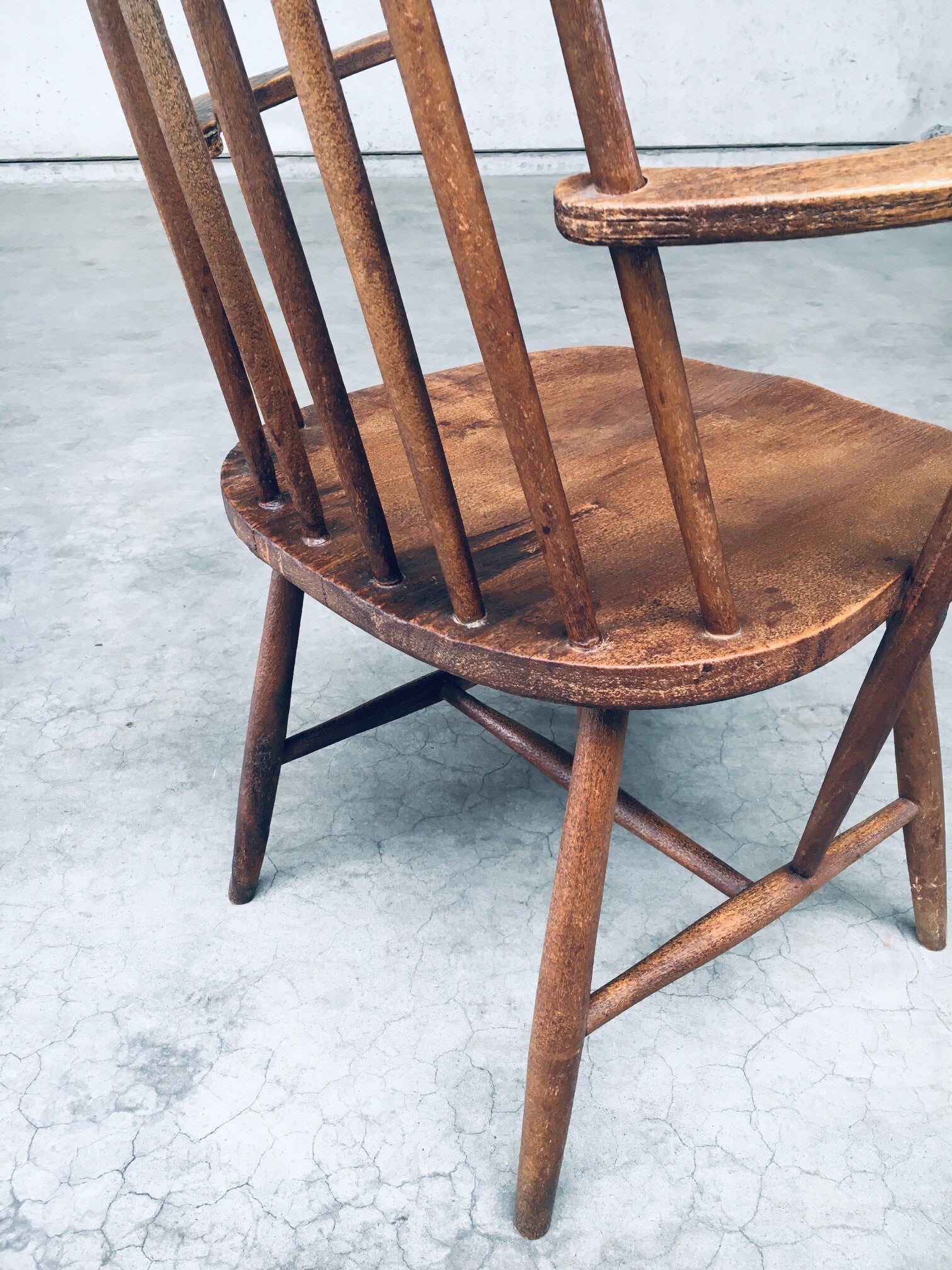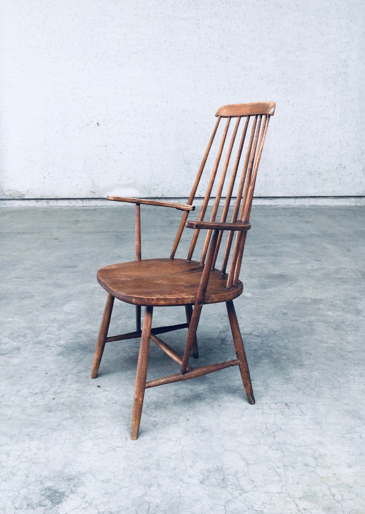 Vintage Midcentury Wabi Sabi Design Oak Spindle Back Chairs. Made in France, 1940's / 50's period. Oak constructed, handcarved chairs with visible oak structure and carving marks. There are 2 chairs with armrests and 2 without. They are all in good, original condition, with normal signs of wear from their use and age. The arm chairs measure 101cm x 68cm x 48cm. The regular chairs measure 101cm x 48cm x 48cm. Seat height is 44cm.