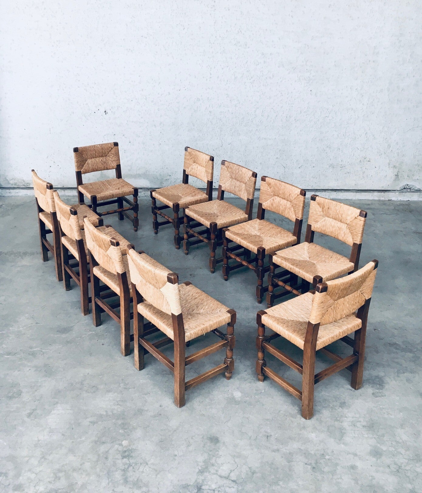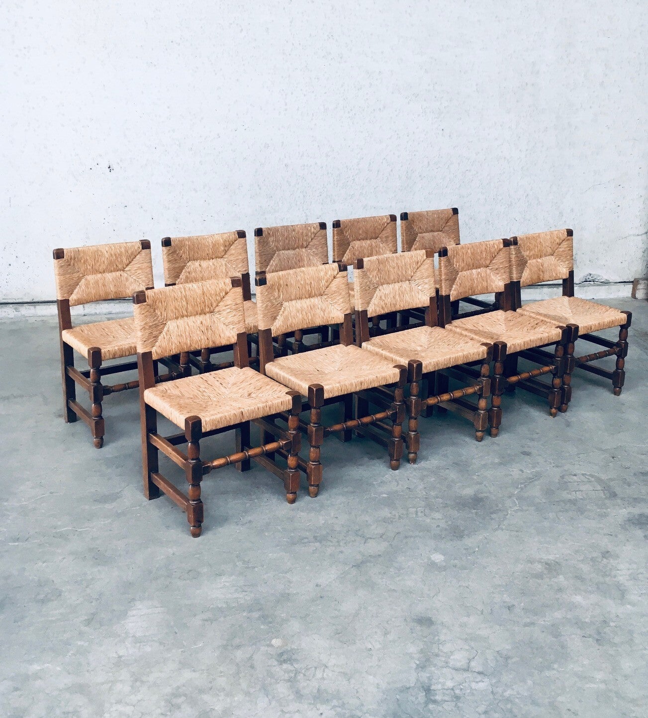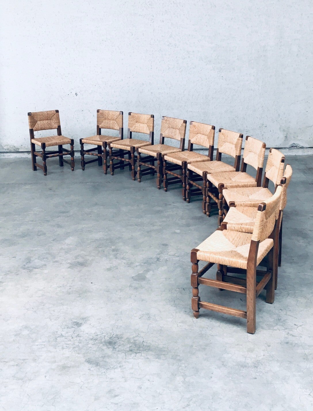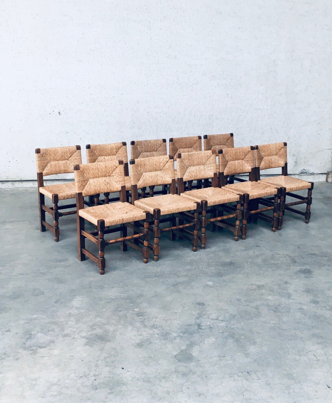 Early 20th Century Tudor Style Design Oak & Rush Dining Chair set of 10 pieces. Made in Belgium, 1930's / 40's period. Solid oak constructed with rush seat and back rest. Sculptural front legs. These chairs are in Cromwelian or Tudor style design. They are all original and in good condition. With normal wear signs of their use and age. The rush seats and back rests are all good on all chairs. The oak constructioned base has some loosened joints, but all chairs are sturdy to use as they are. Each chair measures 82cm x 45cm x 44cm. Seat height: 45cm.