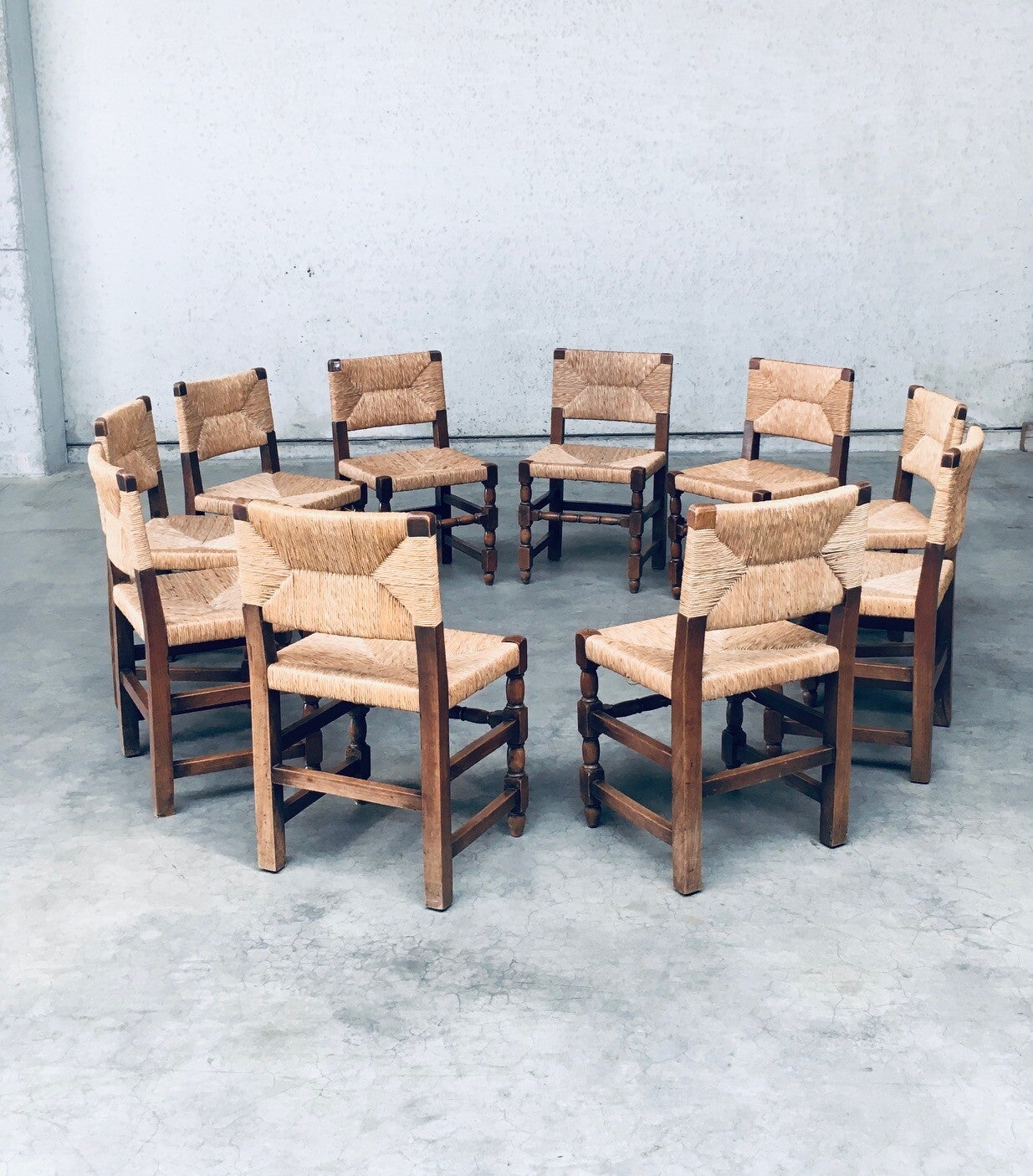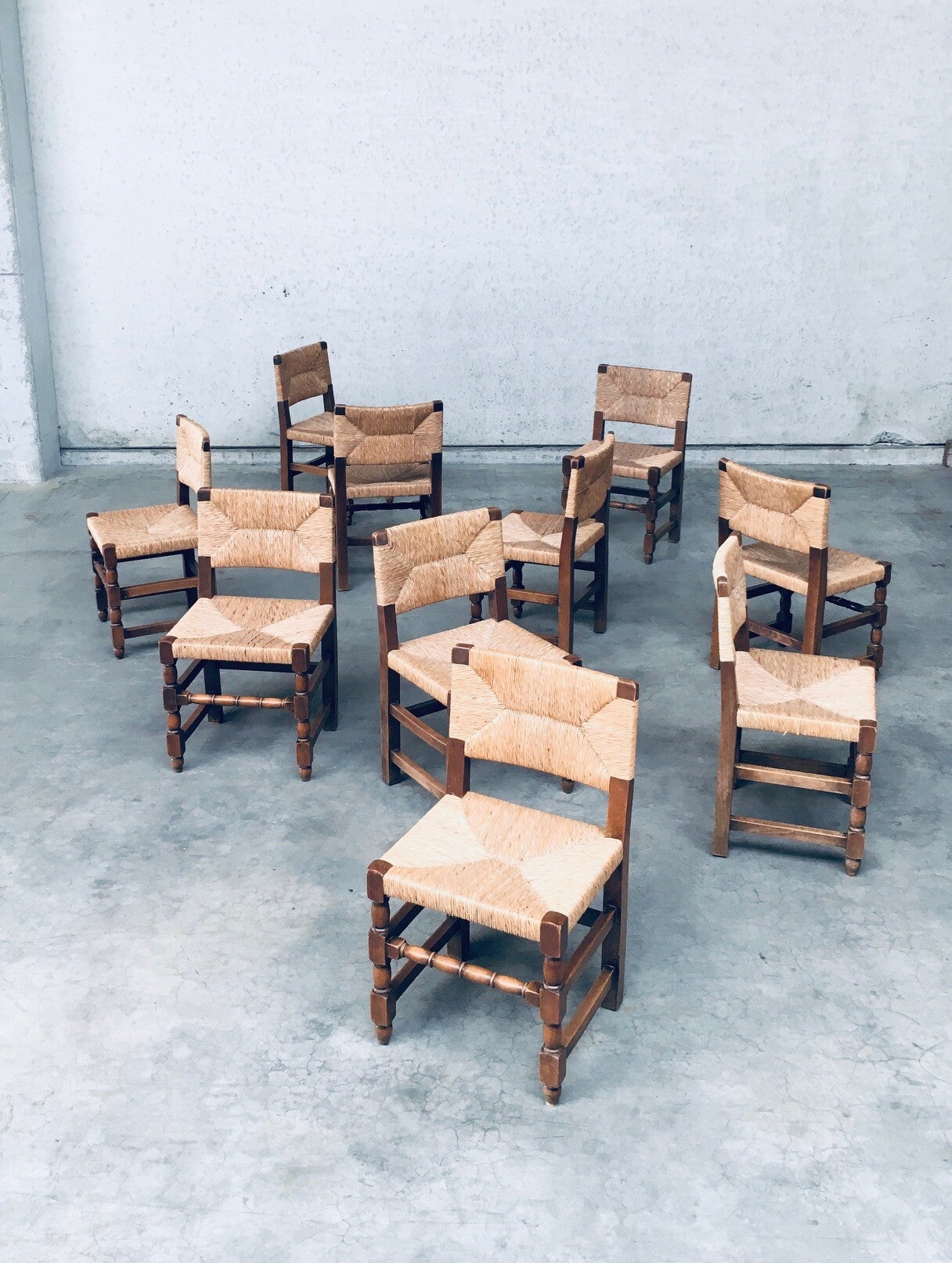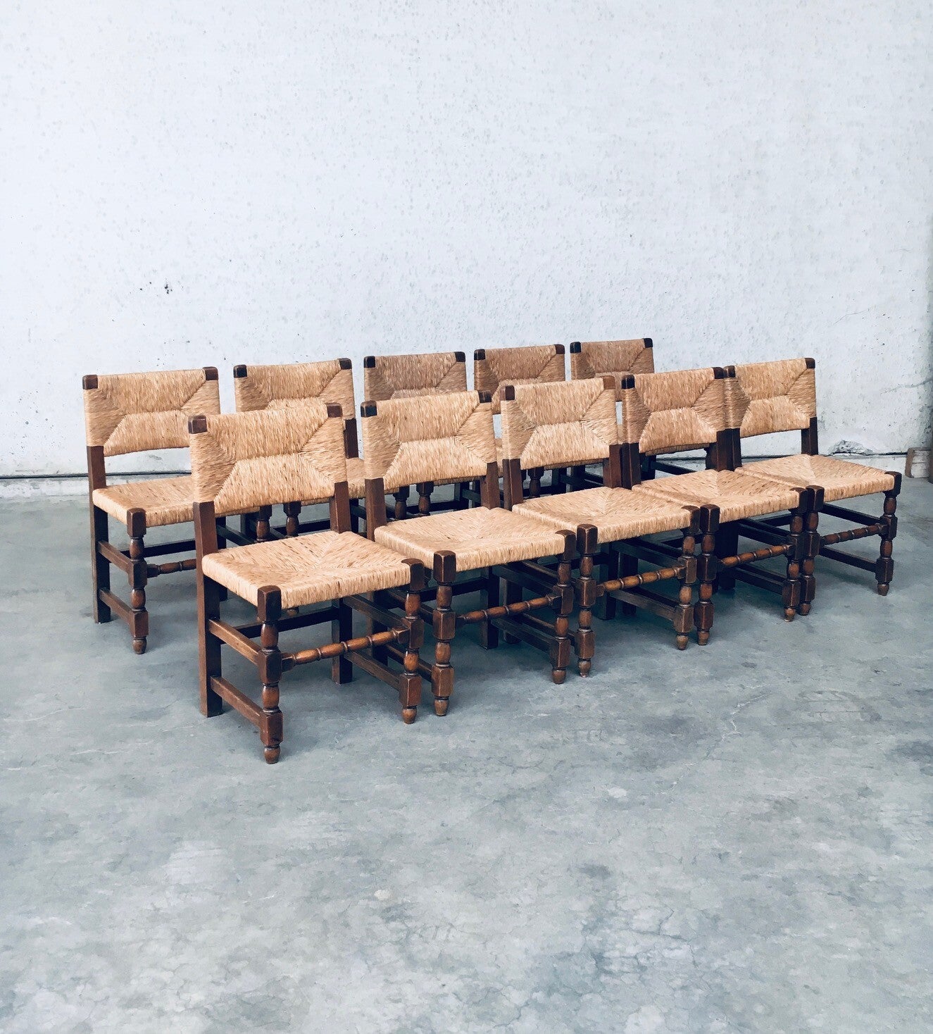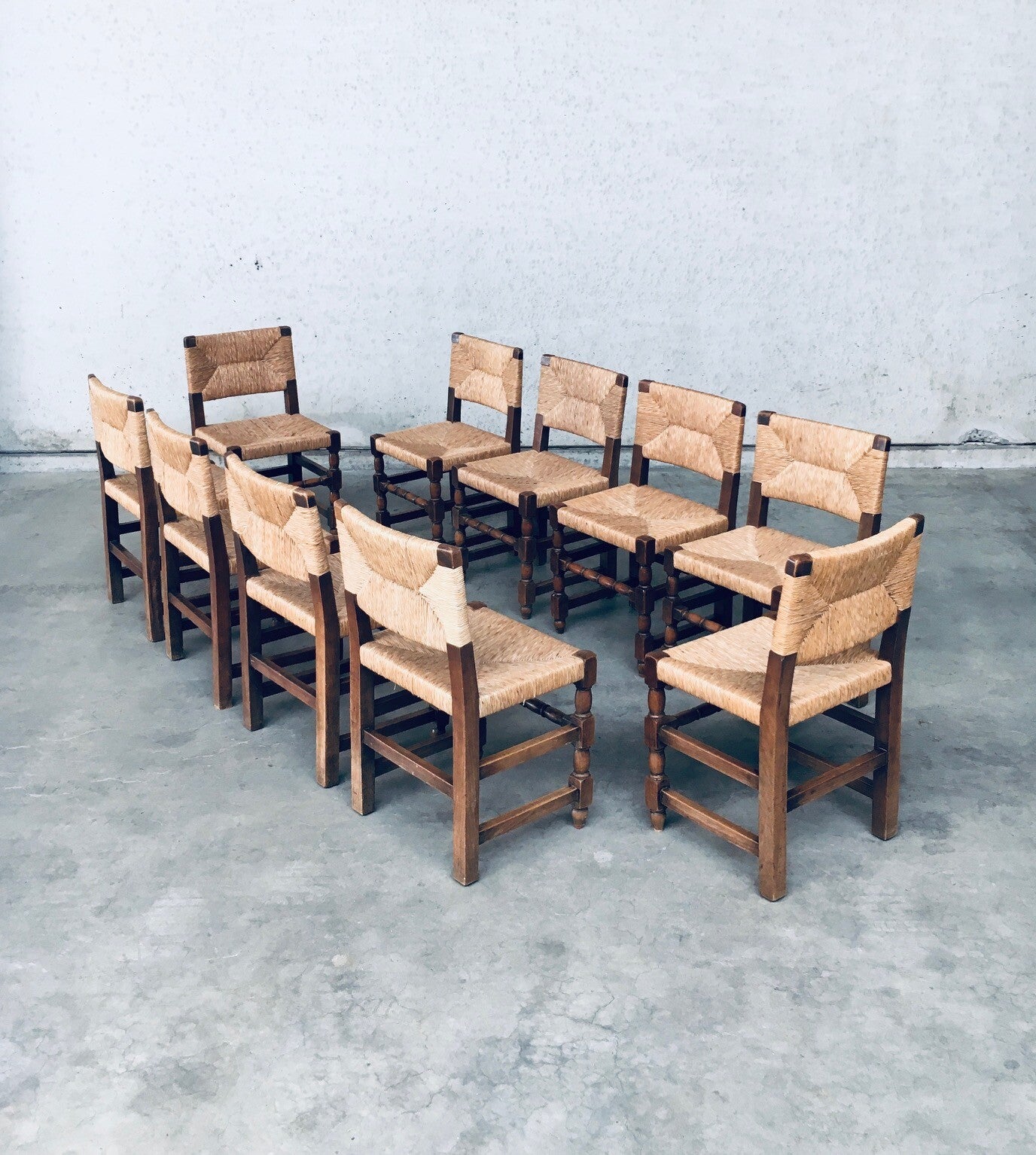 Early 20th Century Tudor Style Design Oak & Rush Dining Chair set of 10 pieces. Made in Belgium, 1930's / 40's period. Solid oak constructed with rush seat and back rest. Sculptural front legs. These chairs are in Cromwelian or Tudor style design. They are all original and in good condition. With normal wear signs of their use and age. The rush seats and back rests are all good on all chairs. The oak constructioned base has some loosened joints, but all chairs are sturdy to use as they are. Each chair measures 82cm x 45cm x 44cm. Seat height: 45cm.