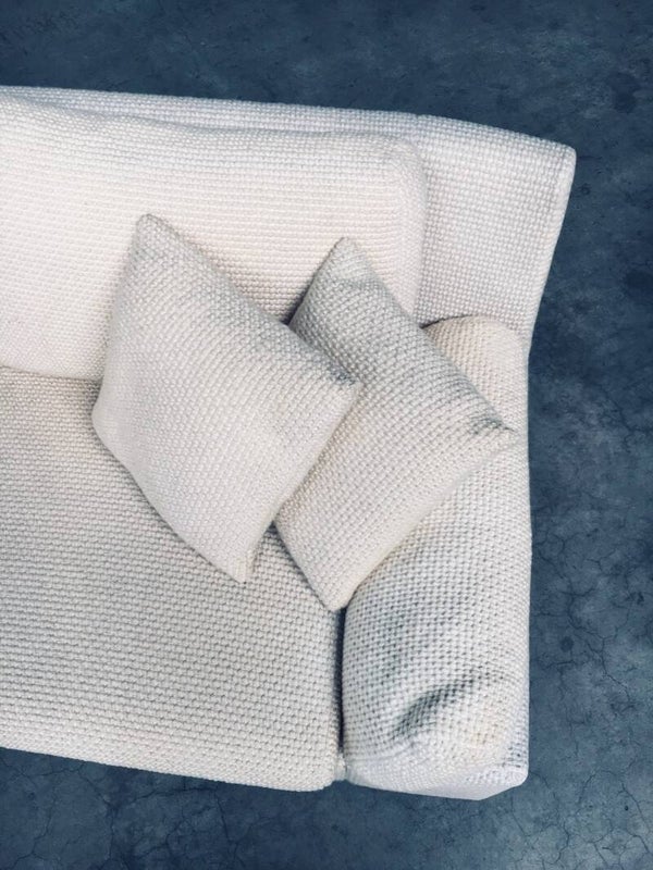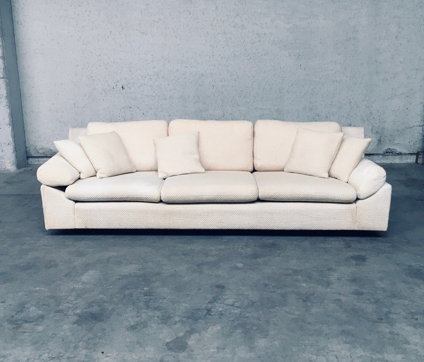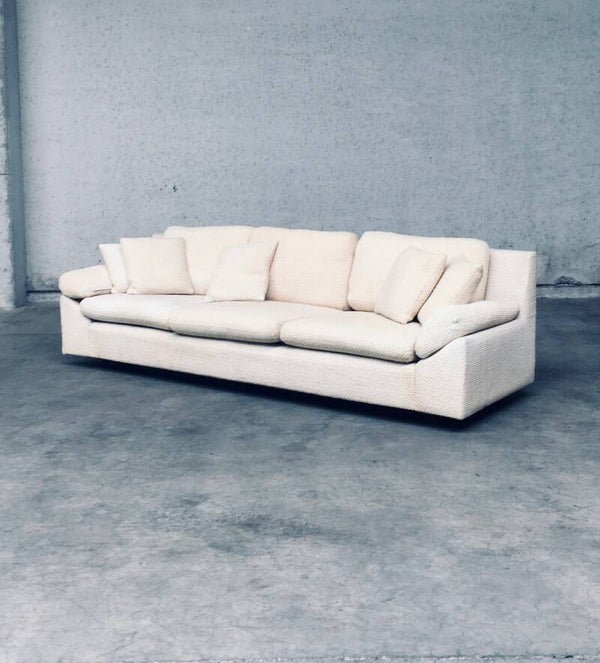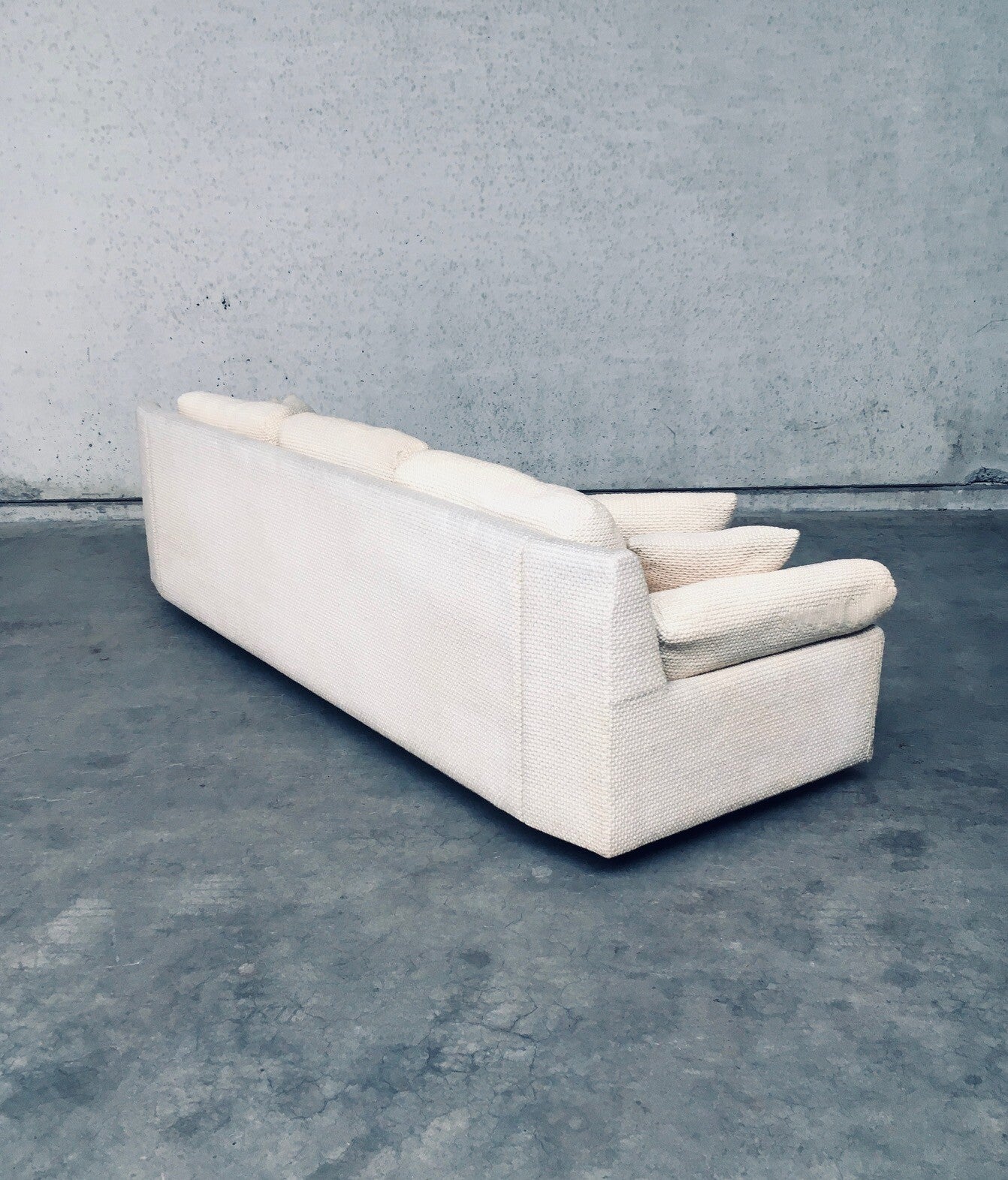 Vintage Midcentury Modern Belgian Design Boucle Wool 3 Seat Sofa. Made in Belgium, 1960's period. This is custom / bespoke made by a Belgian furniture maker for the previous owners to fit their bespoke MCM architectural house in the Mechelen area. Very well made sofa with nice detail. The back corners are bending inwards, so the sofa is also nice designed from the back and can stand free in the living space. This is all original with it's original thick Boucle Wool fabric. The fabric on the sofa has been professionally cleaned, but still shows marks and stains from it's use and age. This comes in overall good condition. This measures 82cm high x 260cm wide x 90cm deep. Seat height is 40cm.
