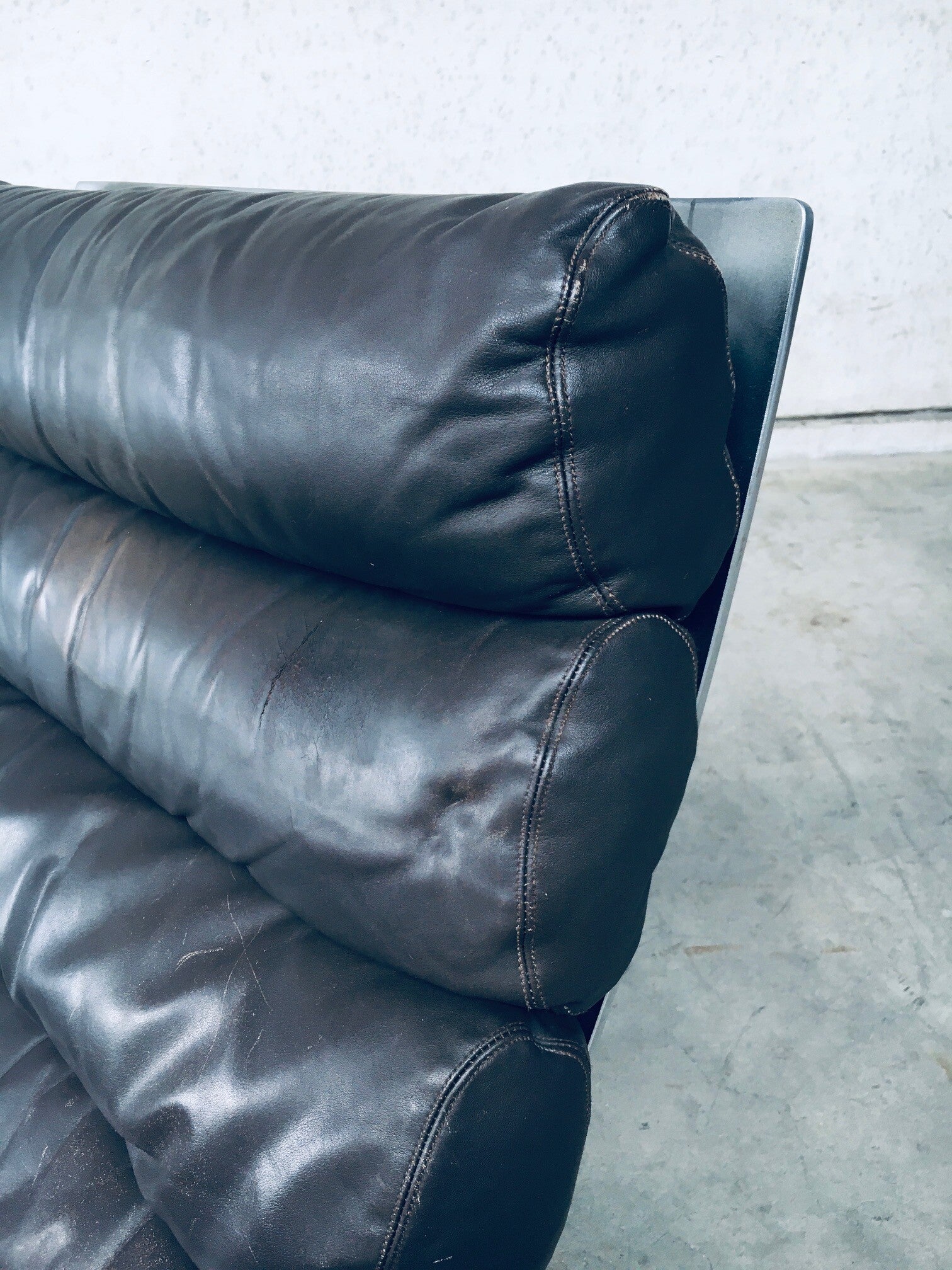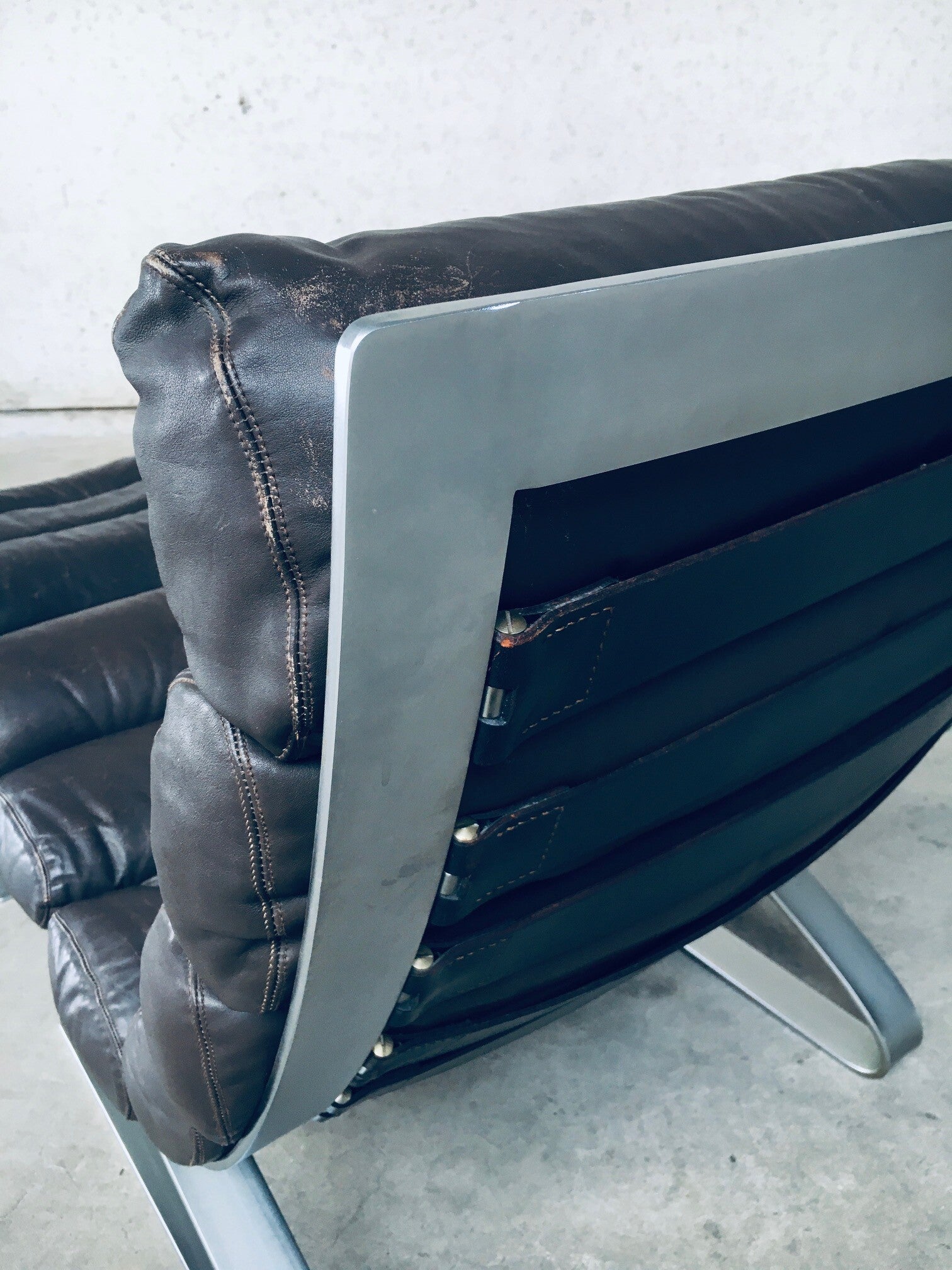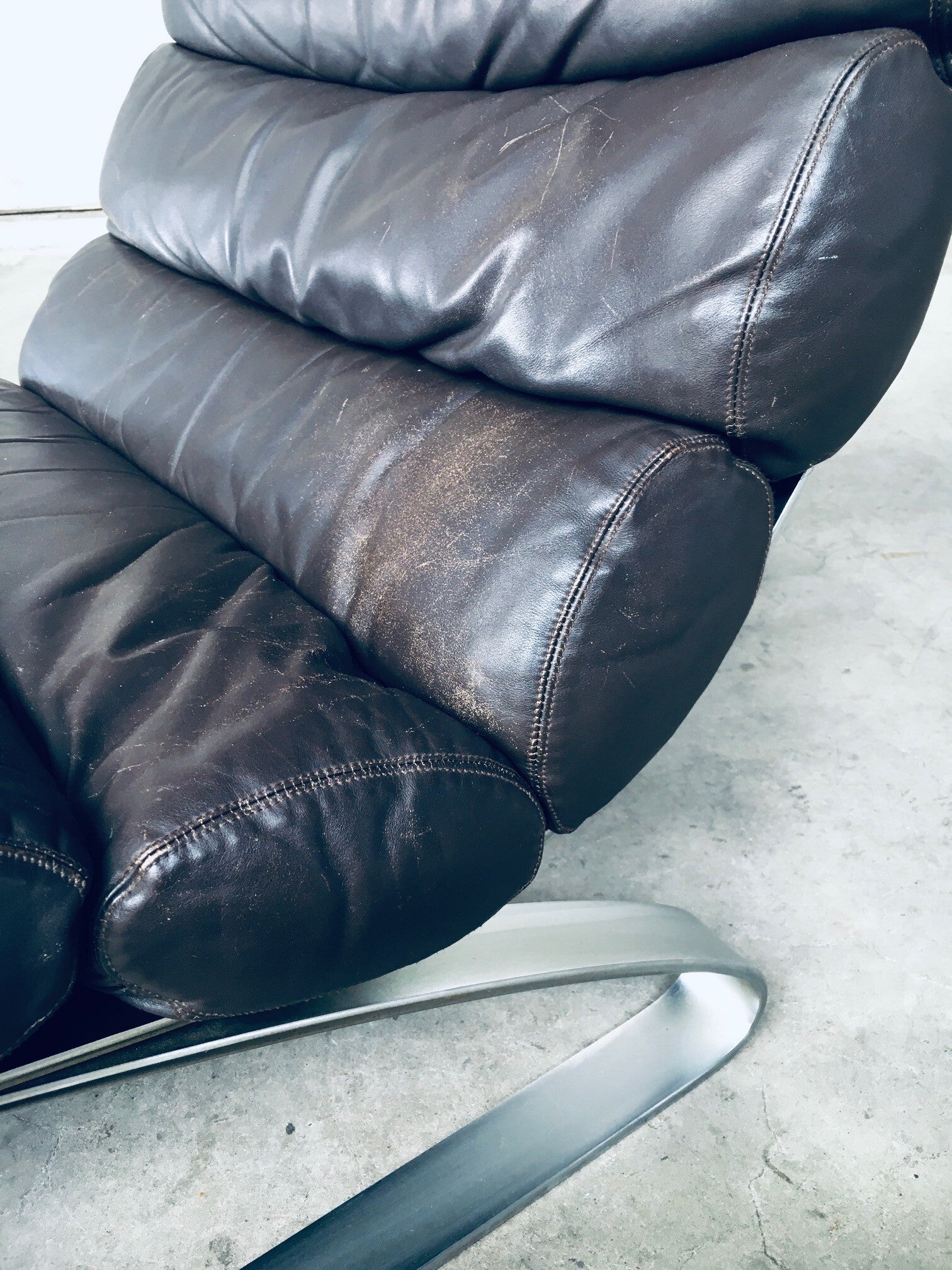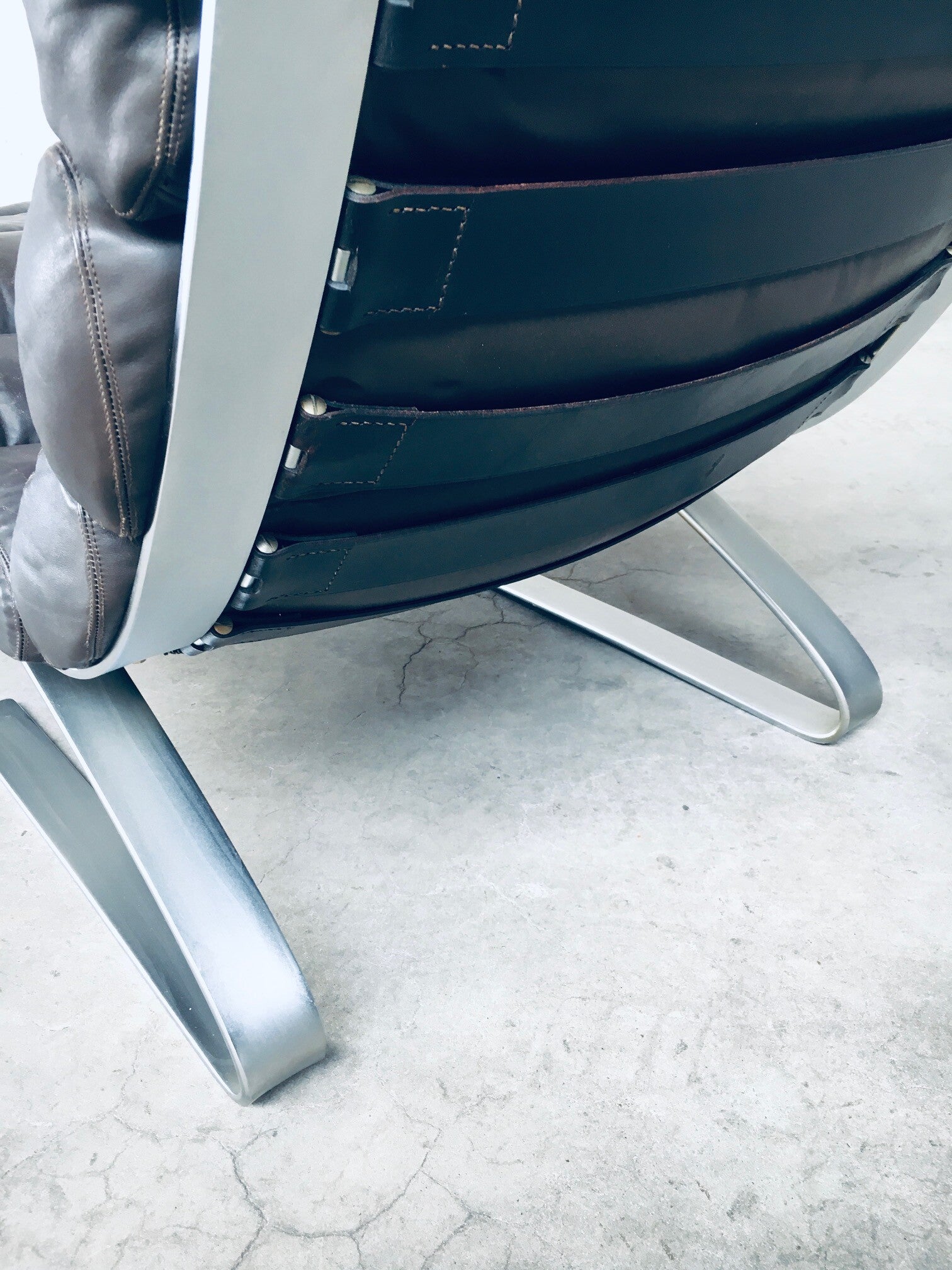 Vintage Midcentury Modern German Design "SINUS" Lounge Chair and Hocker by Reinhold Adolf & Hans Jürgen Schröpfer for COR. Made in Germany, 1970's. Design is from 1973. This is a very early made lounge chair, complete with it's hocker / footstool / ottoman. Brown leather on this super comfortable chair. This shows it's age and has wear on the leather from it's use. A very nice patinated chair for the purists. Comes in very good, all original condition. The chair measures 87cm x 70cm x 95cm. Seat height 40cm. The hocker measures 43cm x 70cm x 60cm.