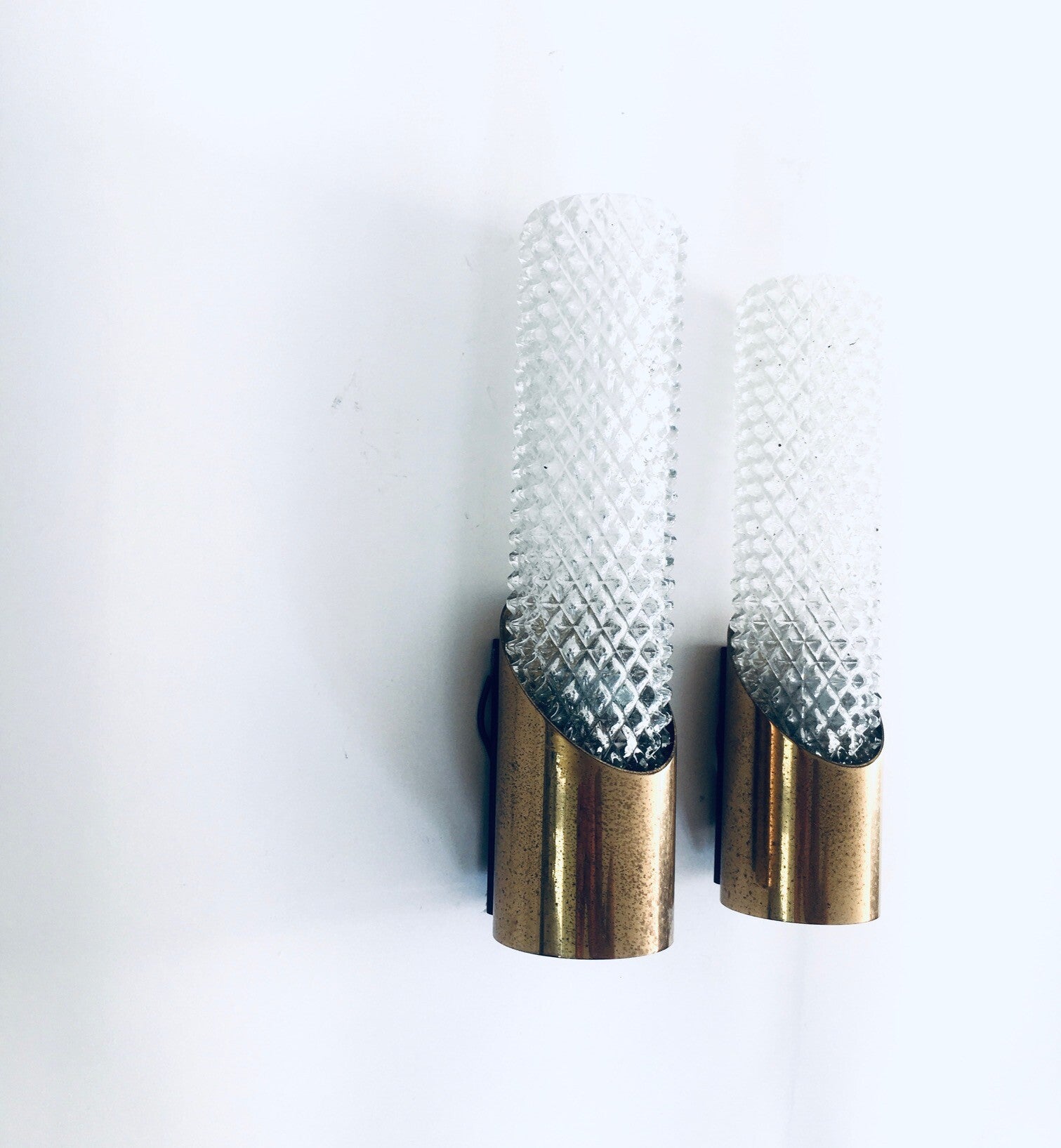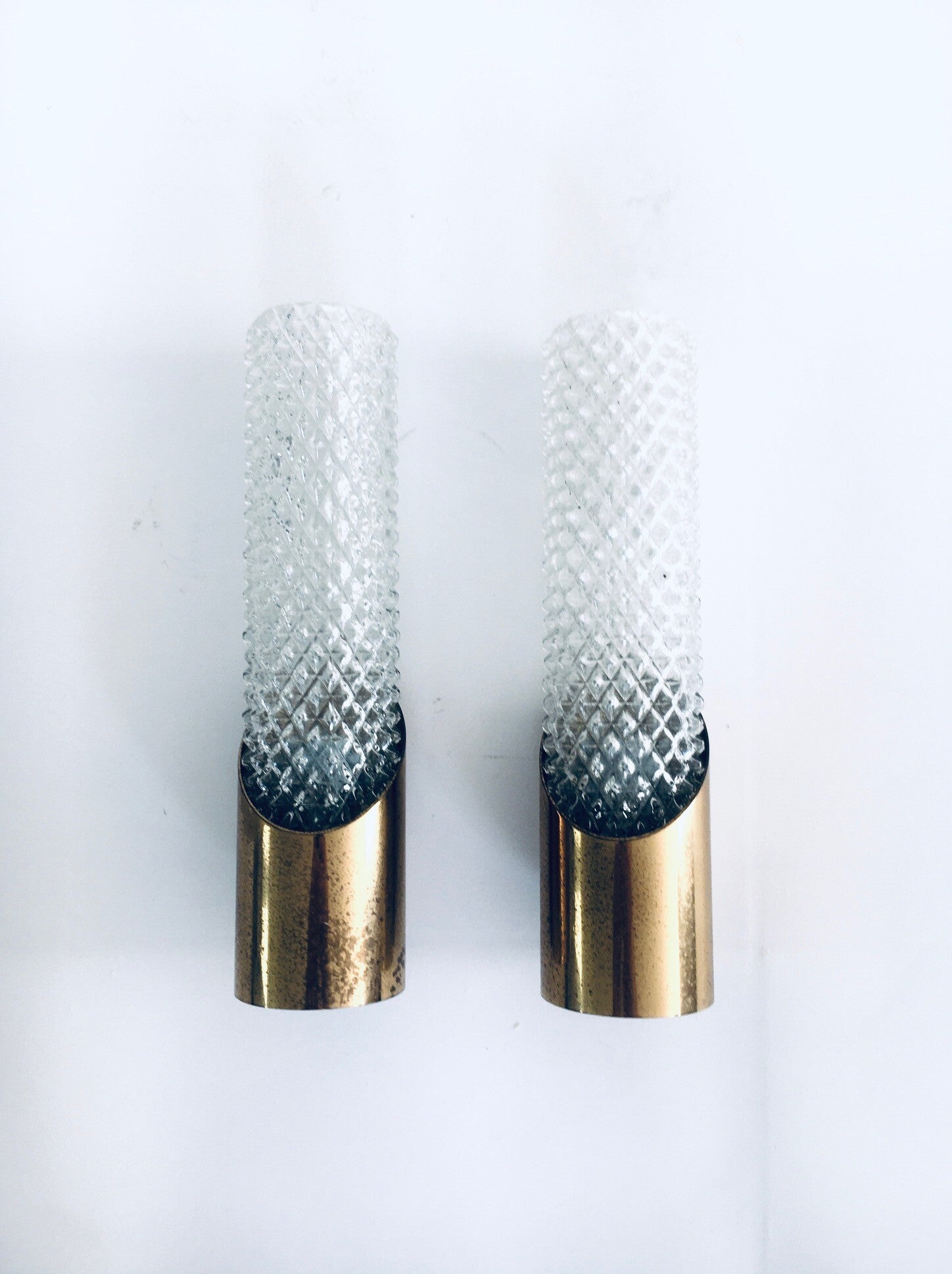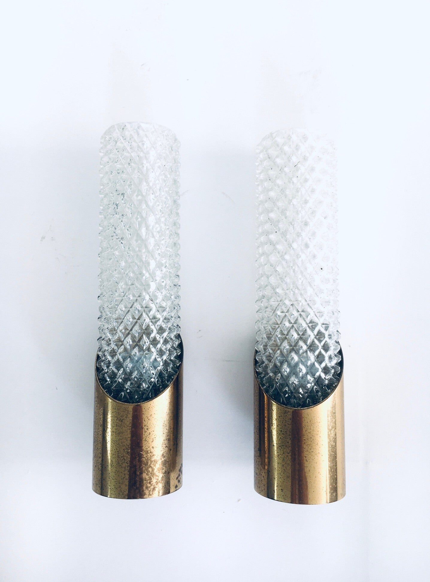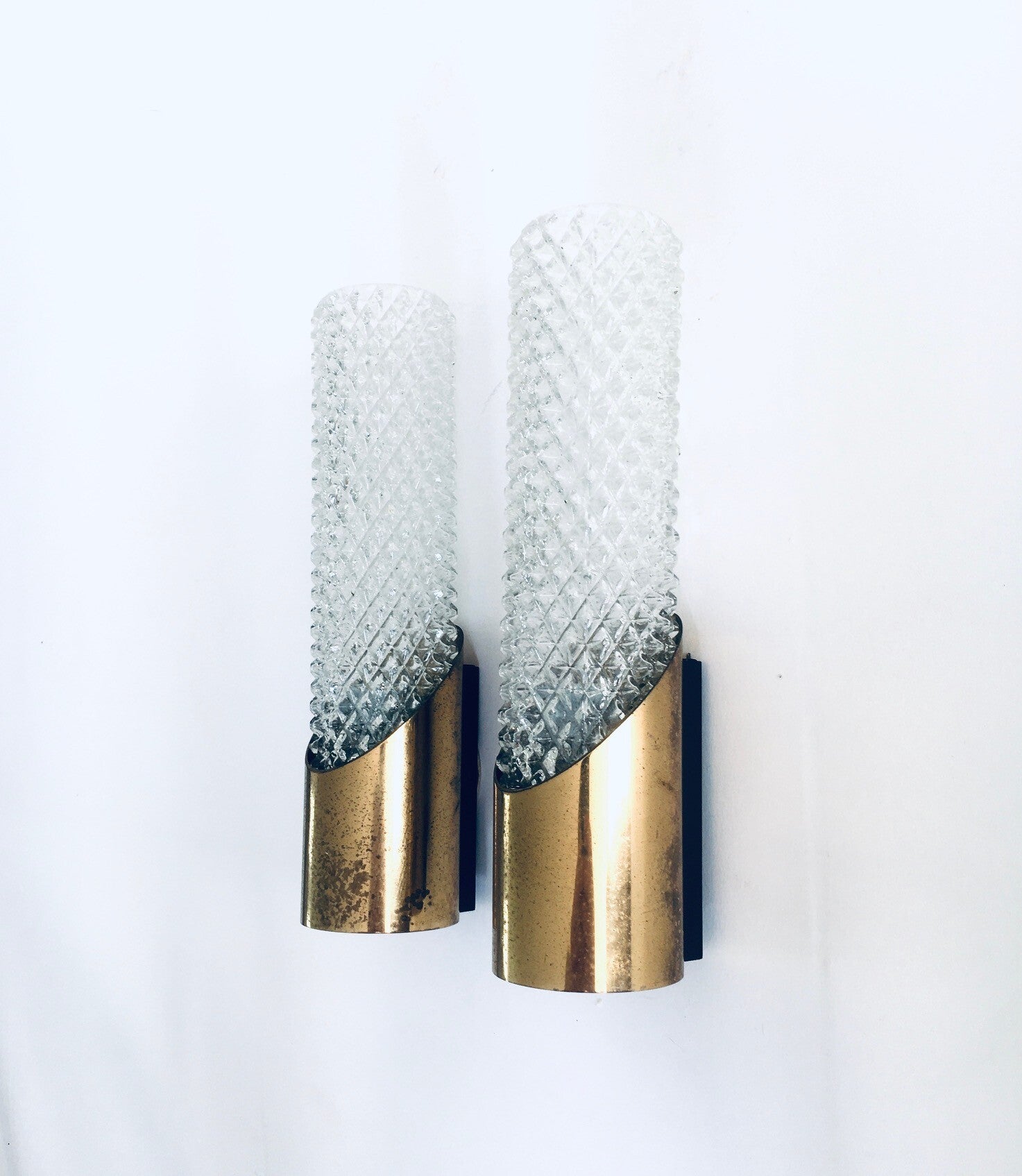 Vintage Midcentury Design Glass & Brass Flush Mounted Wall Lamp set. Made in France, 1960's period. Cut glass with brass constructed wall lamps. Slender in design with a nice combination of the glass with the brass. The set comes in good, all original condition, with minor wear from their age and use. Each measures 24,5cm x 6,5cm x 7cm.
