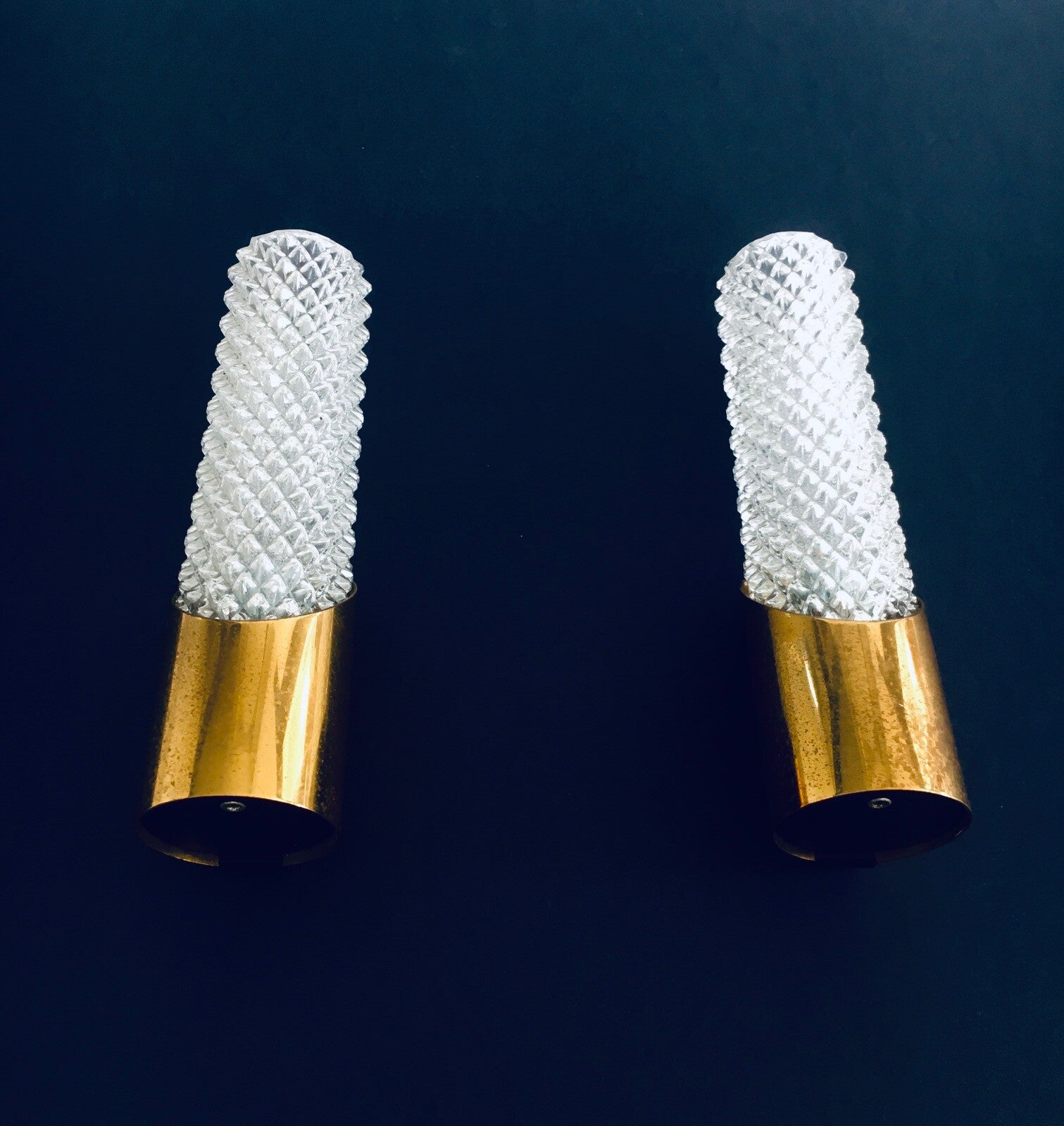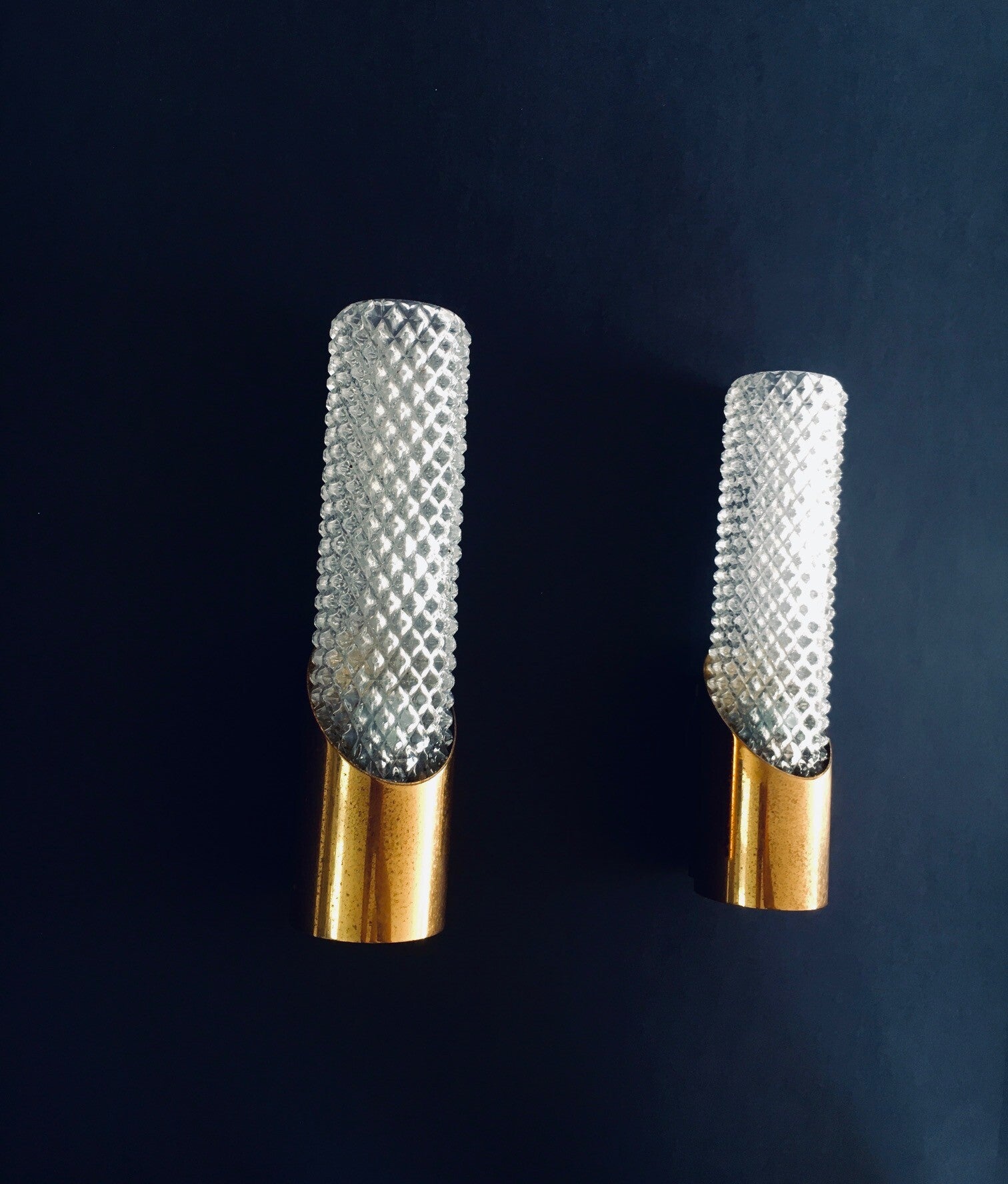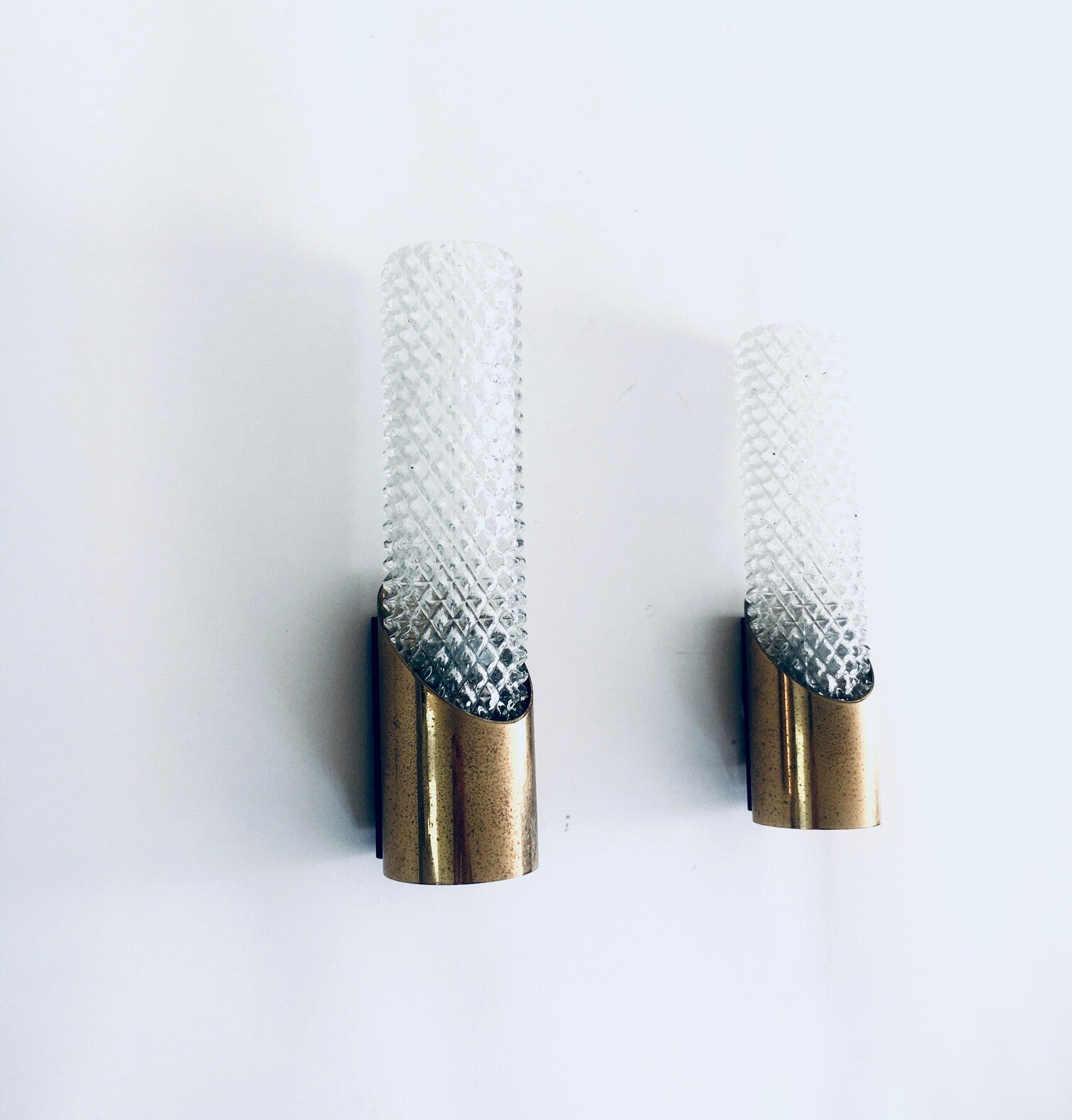 Vintage Midcentury Design Glass & Brass Flush Mounted Wall Lamp set. Made in France, 1960's period. Cut glass with brass constructed wall lamps. Slender in design with a nice combination of the glass with the brass. The set comes in good, all original condition, with minor wear from their age and use. Each measures 24,5cm x 6,5cm x 7cm.