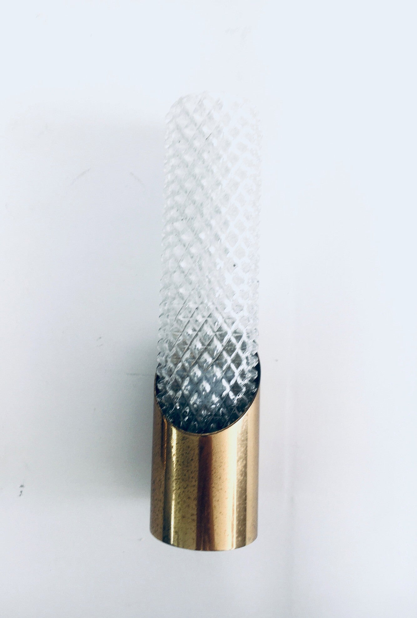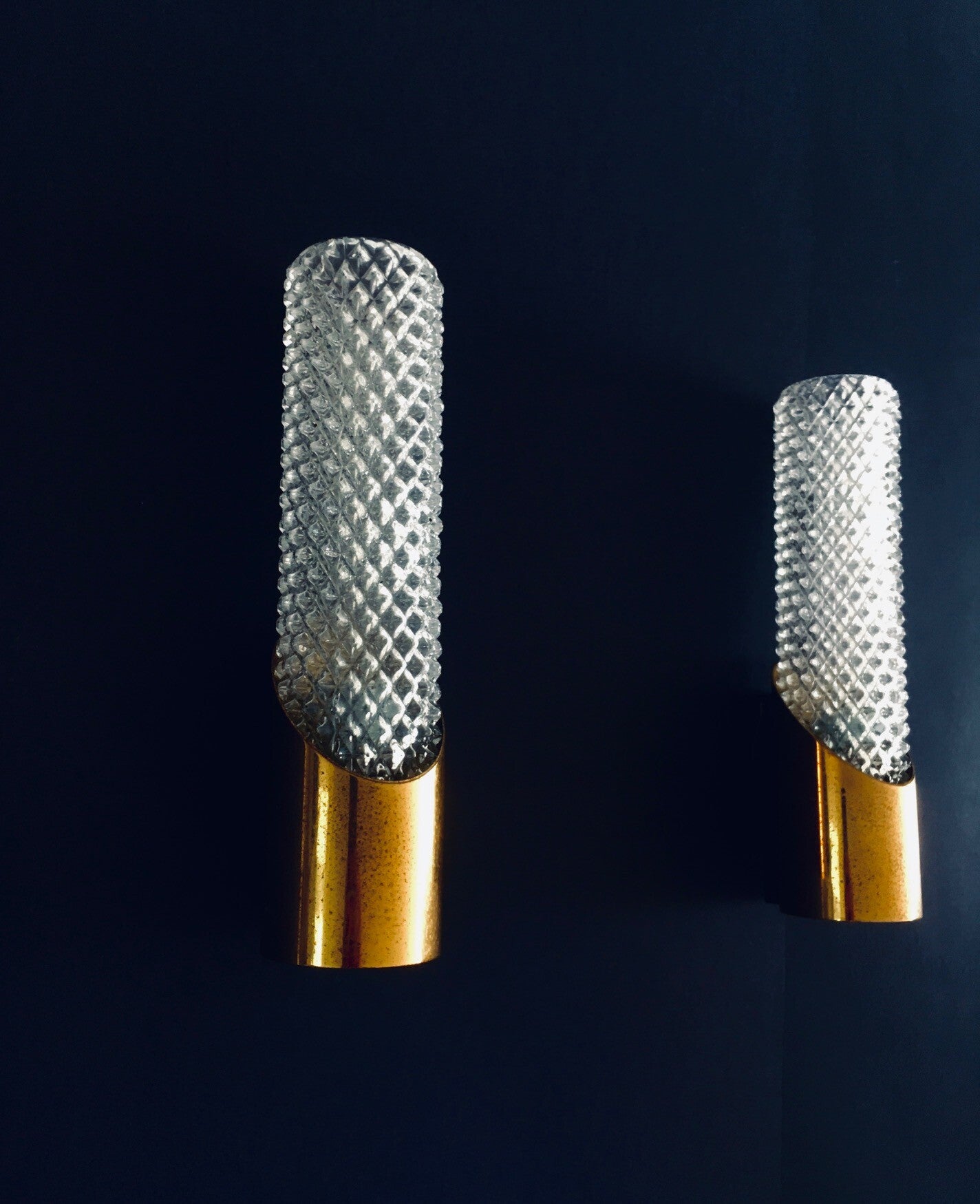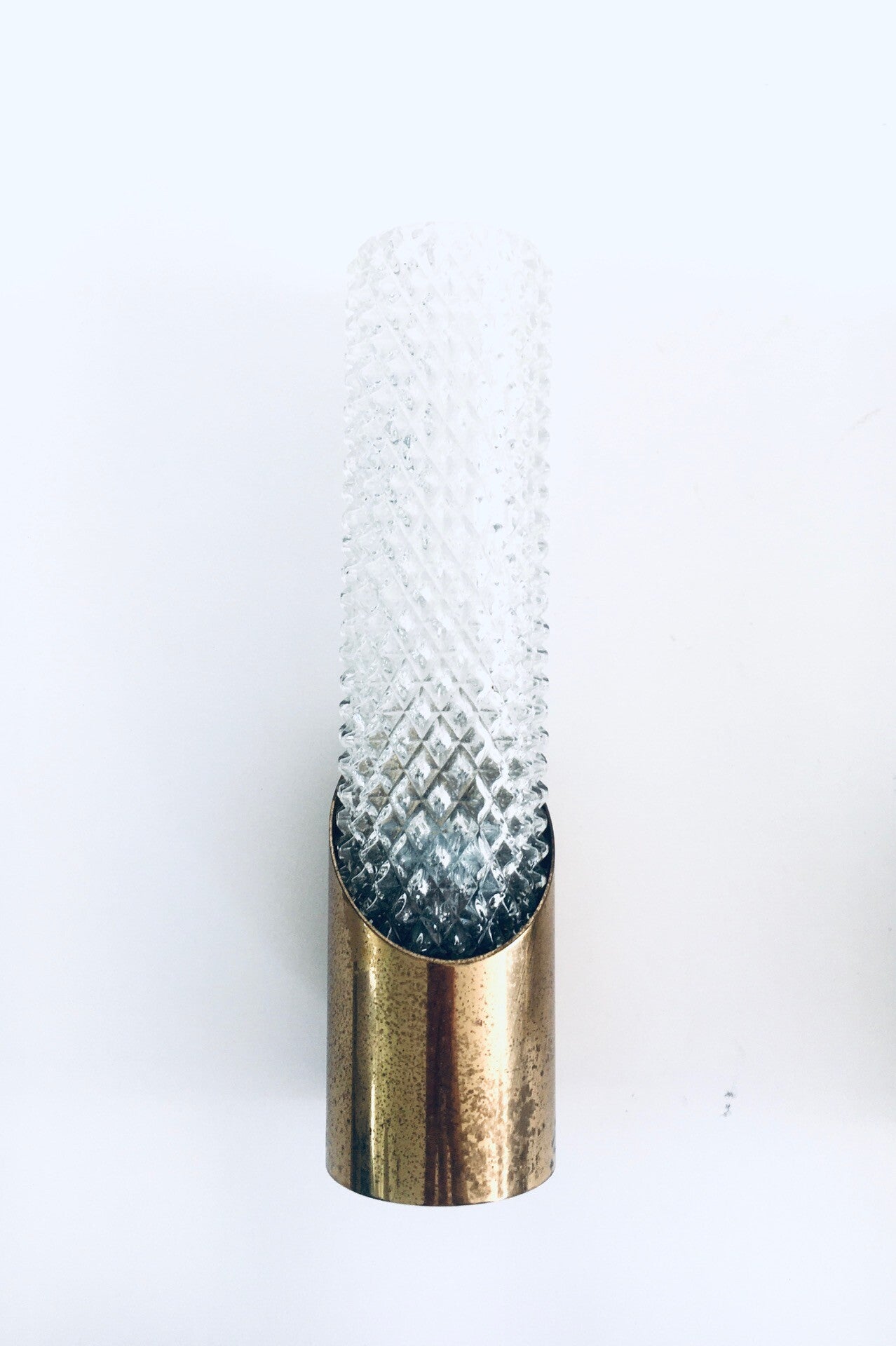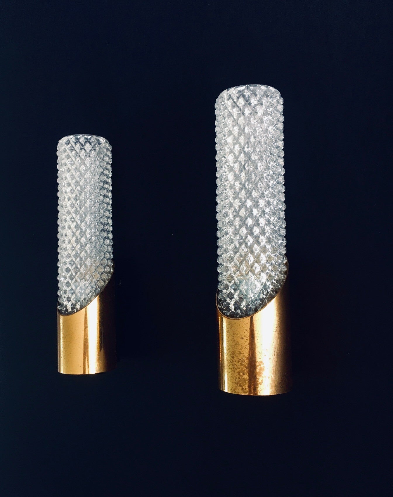 Vintage Midcentury Design Glass & Brass Flush Mounted Wall Lamp set. Made in France, 1960's period. Cut glass with brass constructed wall lamps. Slender in design with a nice combination of the glass with the brass. The set comes in good, all original condition, with minor wear from their age and use. Each measures 24,5cm x 6,5cm x 7cm.