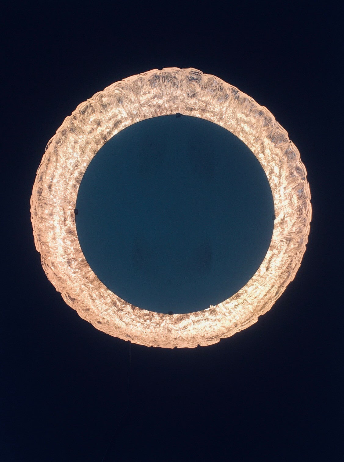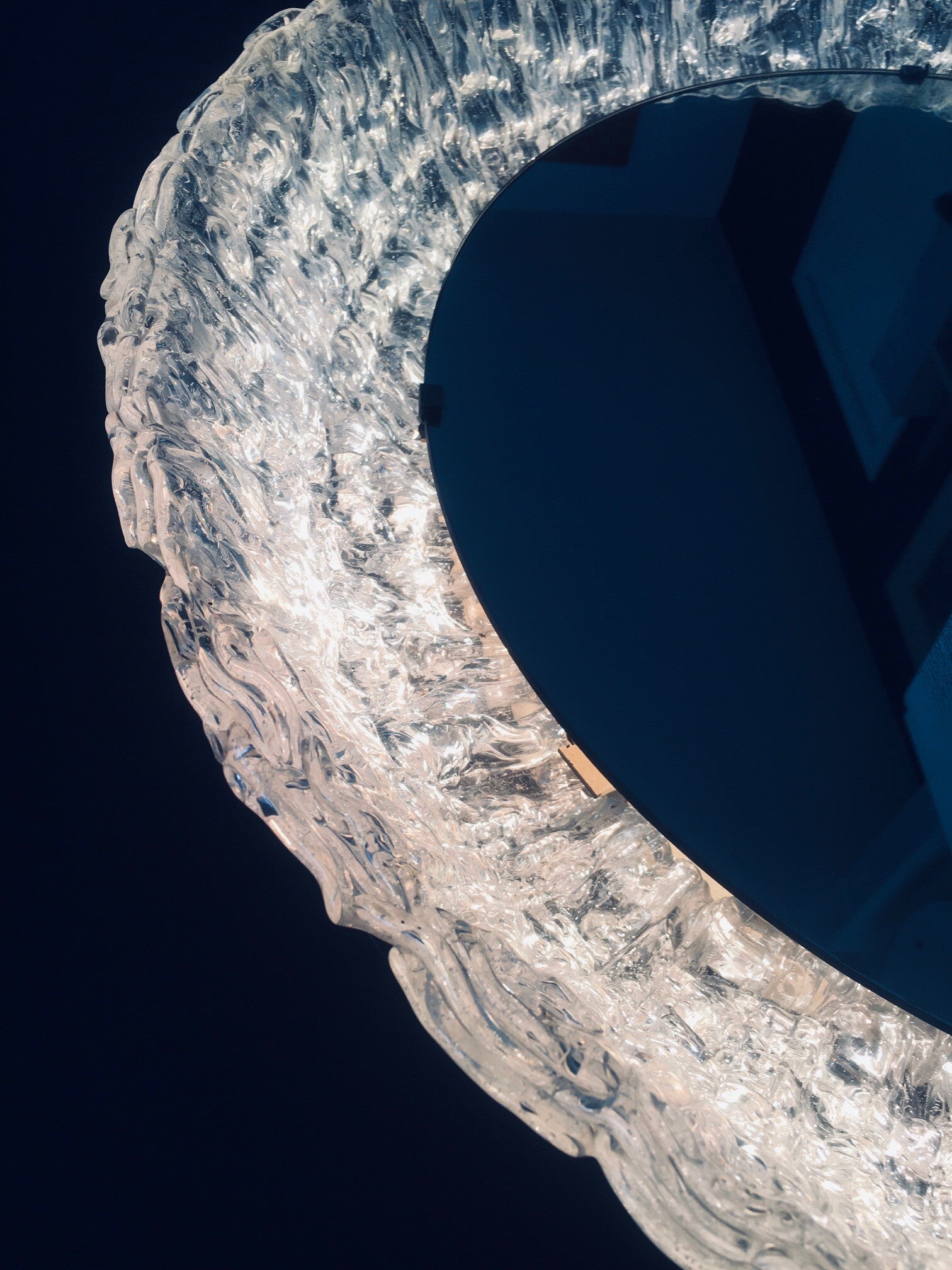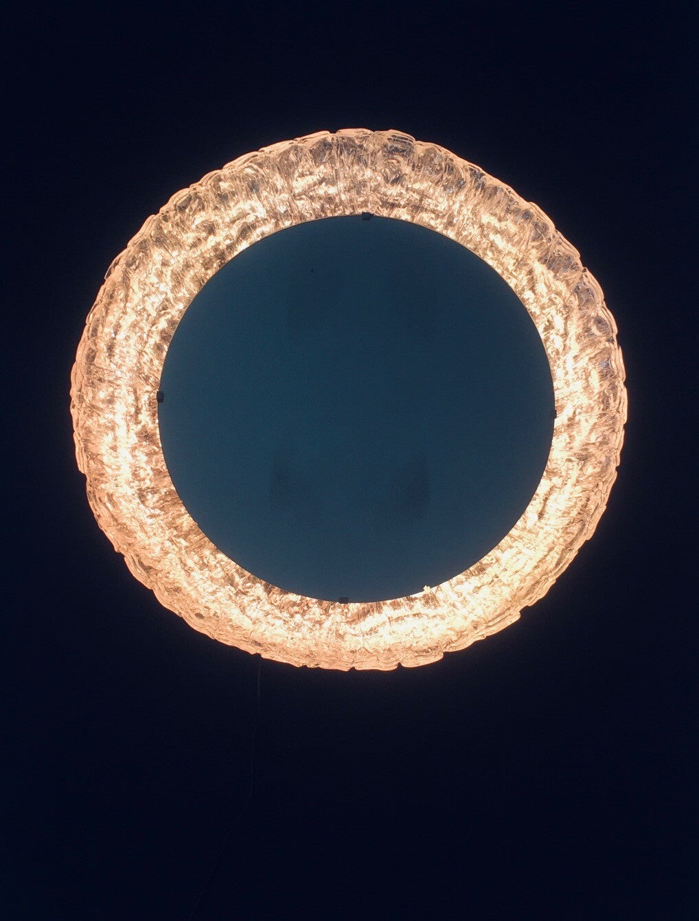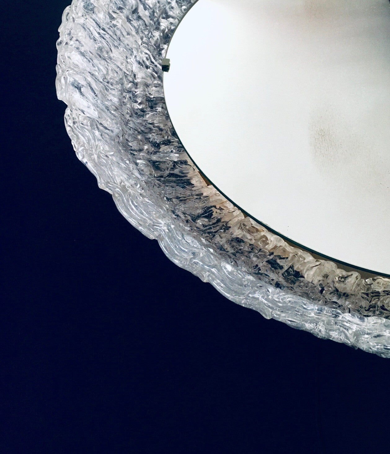 Vintage Midcentury Design Lucite Wall Mirror with Backlight by Egon Hillebrand for Hillebrand Leuchten. Made in Germany, 1970's period. Large round mirror with lucite plastic ice structure floating back which can be lit up. The mirror has nice aging. The lucite back ring comes in perfect condition. Measures 68cm x 14cm x 68cm.