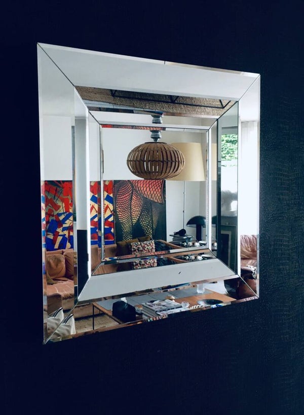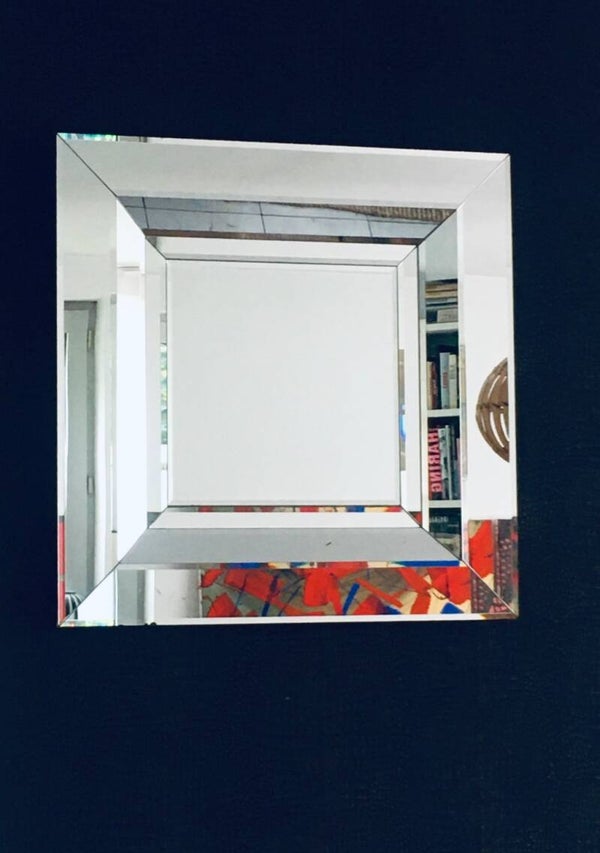 Vintage Postmodern Design Square Facet Cut Wall Mirror by Deknudt. Made in Belgium, 1970's period. Marked with typical sticker label on the back. Large handmade square mirror with geometrical facet design. This comes in good condition, with some aging marks in the mirror which is not uncommon for it's age and use. Measures 76,5cm x 76,5cm x 7cm.
